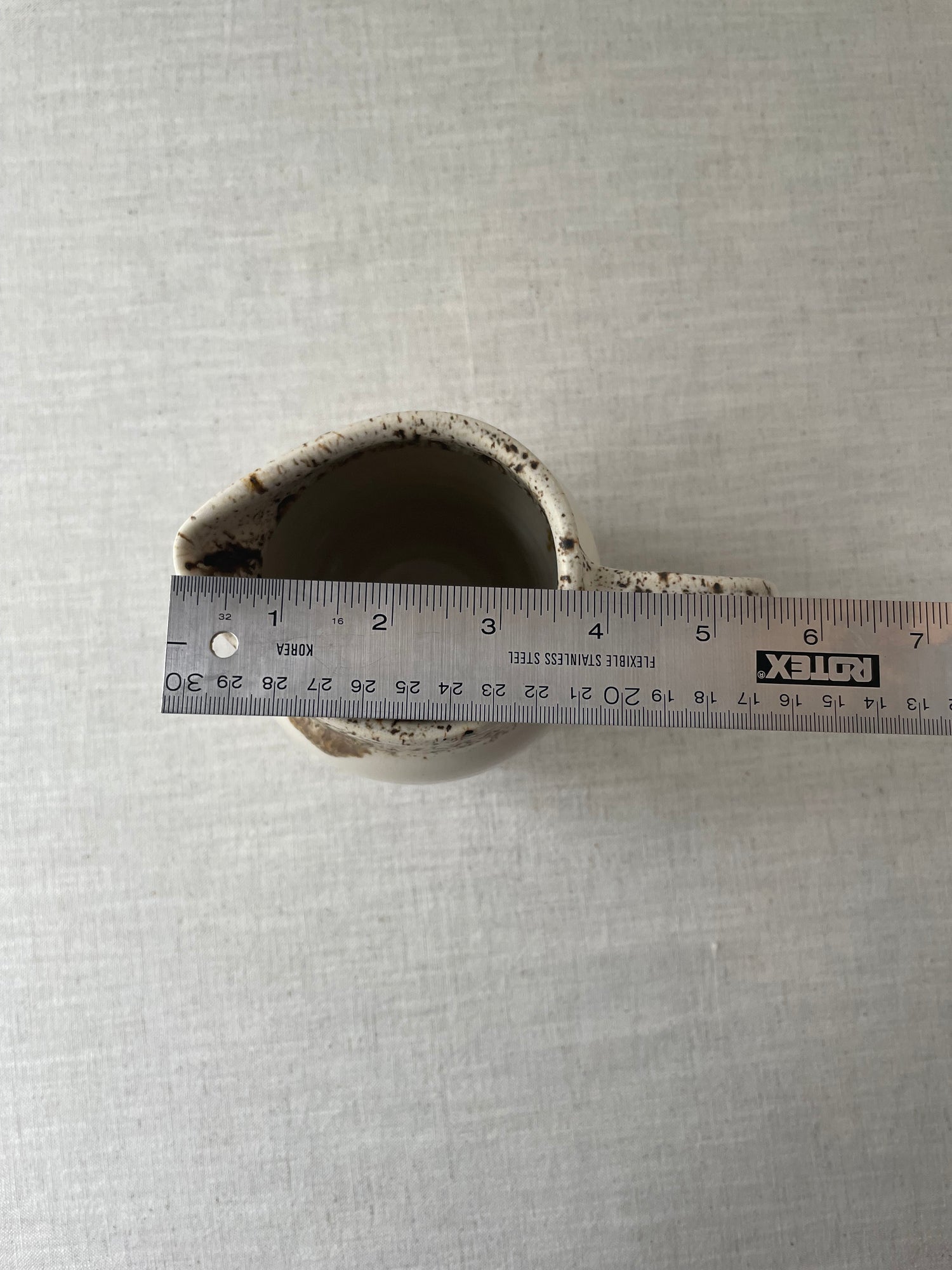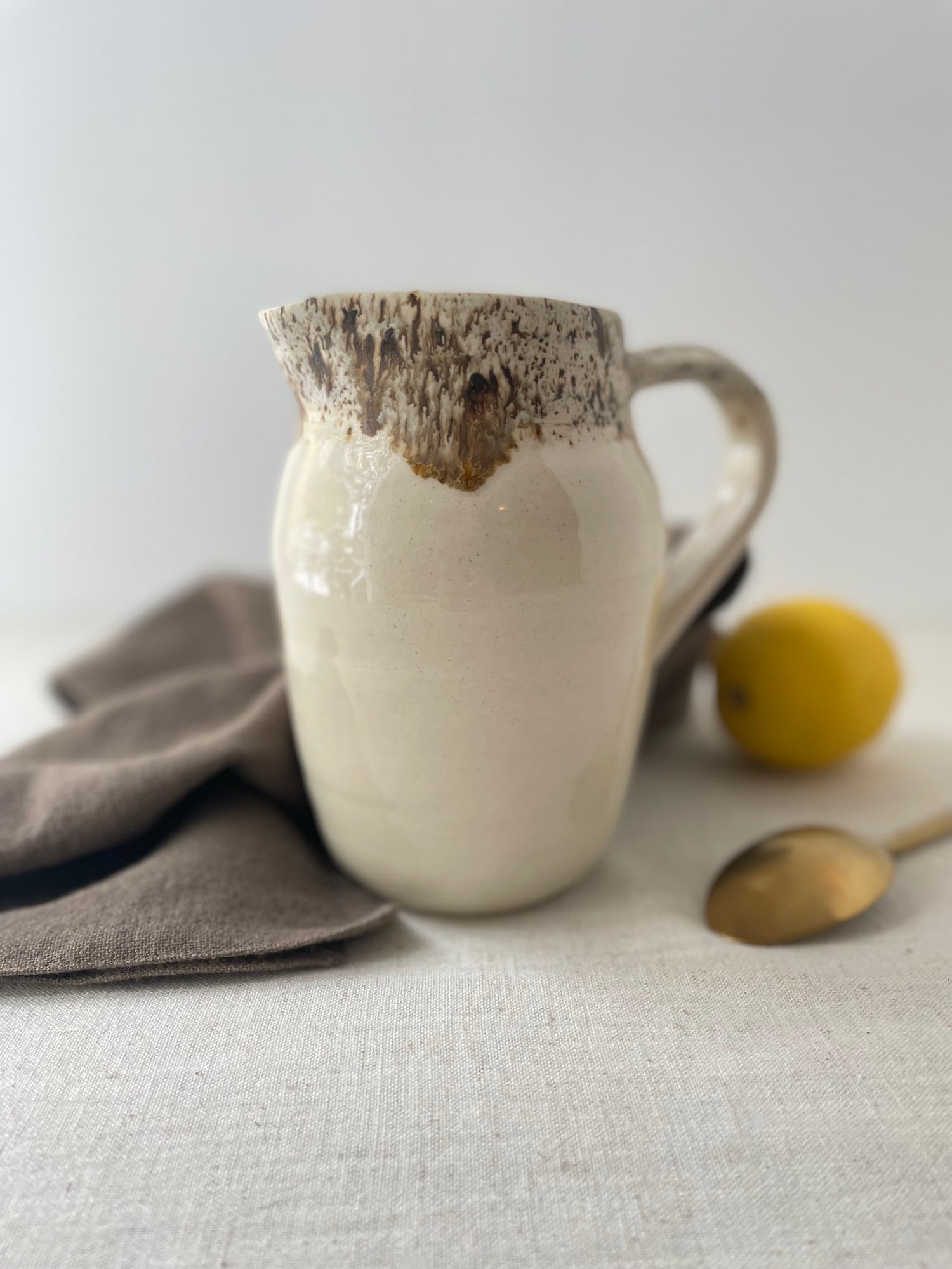 This pitcher is wheel-thrown with a handmade handle and a variegated glaze flecked with rich brown tones along the rim inside and out.