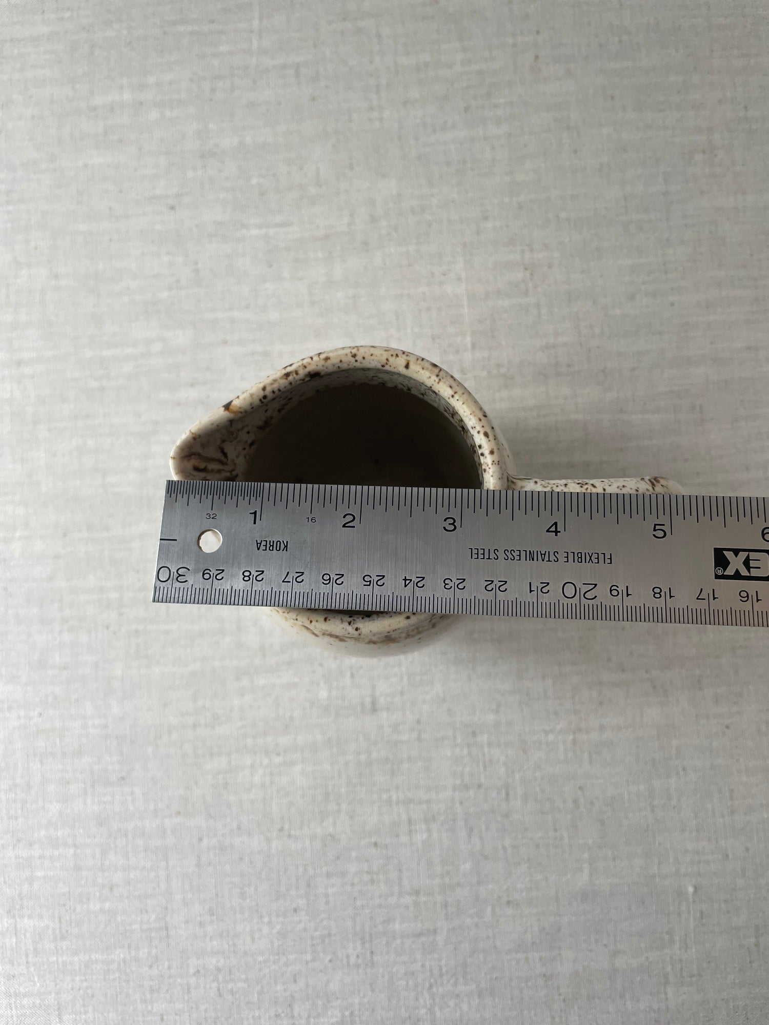 This pitcher is wheel-thrown with a handmade handle and a variegated glaze flecked with rich brown tones on the rim to complement the speckled clay.