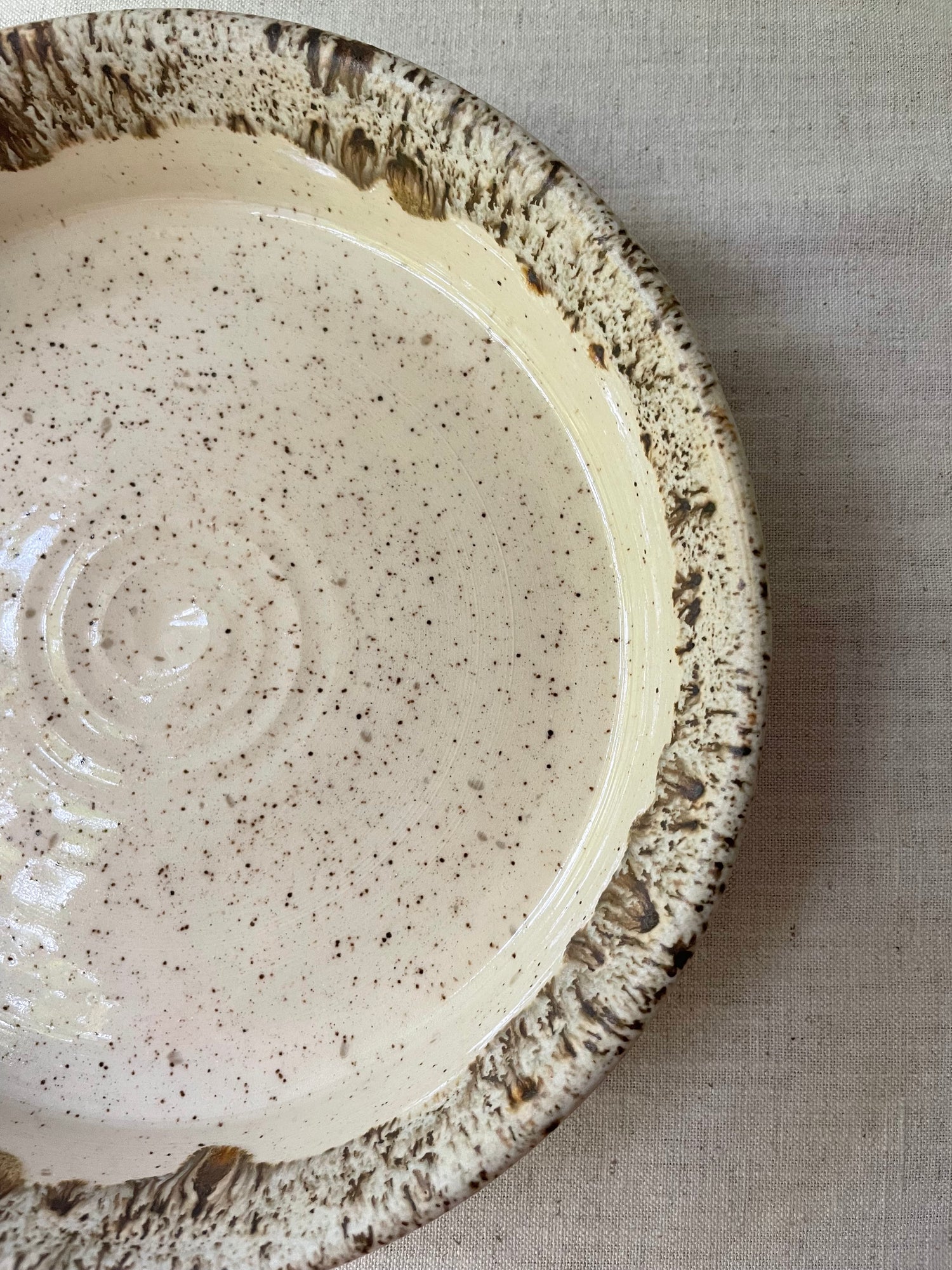 This casserole started thrown on the wheel, after which I impressed a spiral in the bottom, added texture to the exterior, formed handles and adhered these to the casserole. After being fired in an electric kiln, I choose this speckled glaze with rich brown tones.