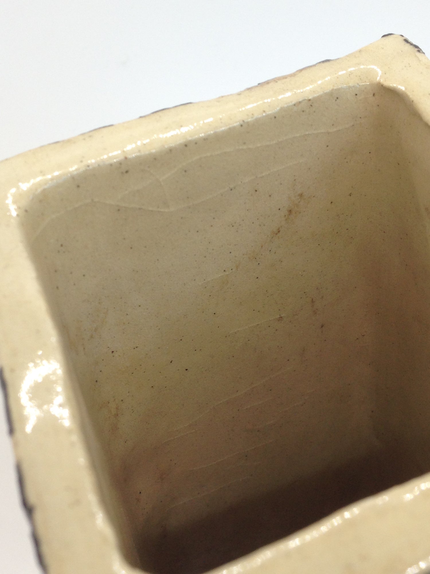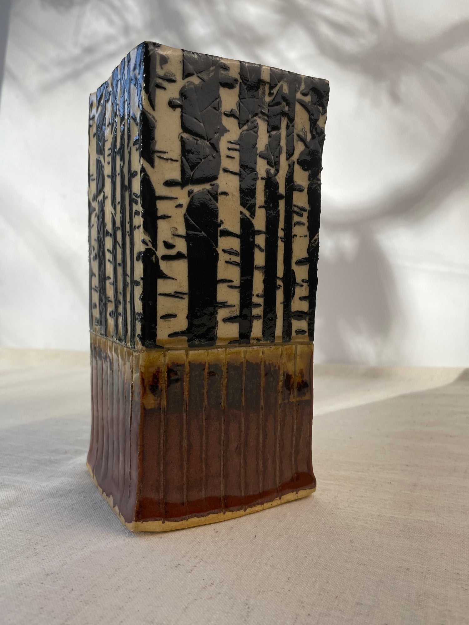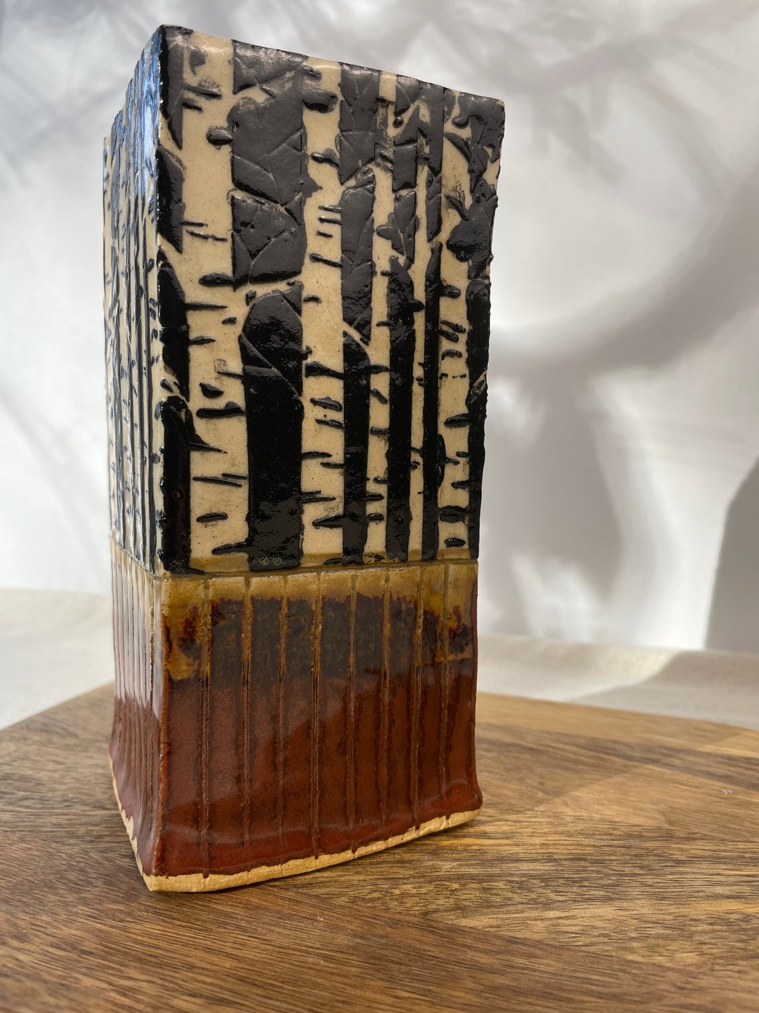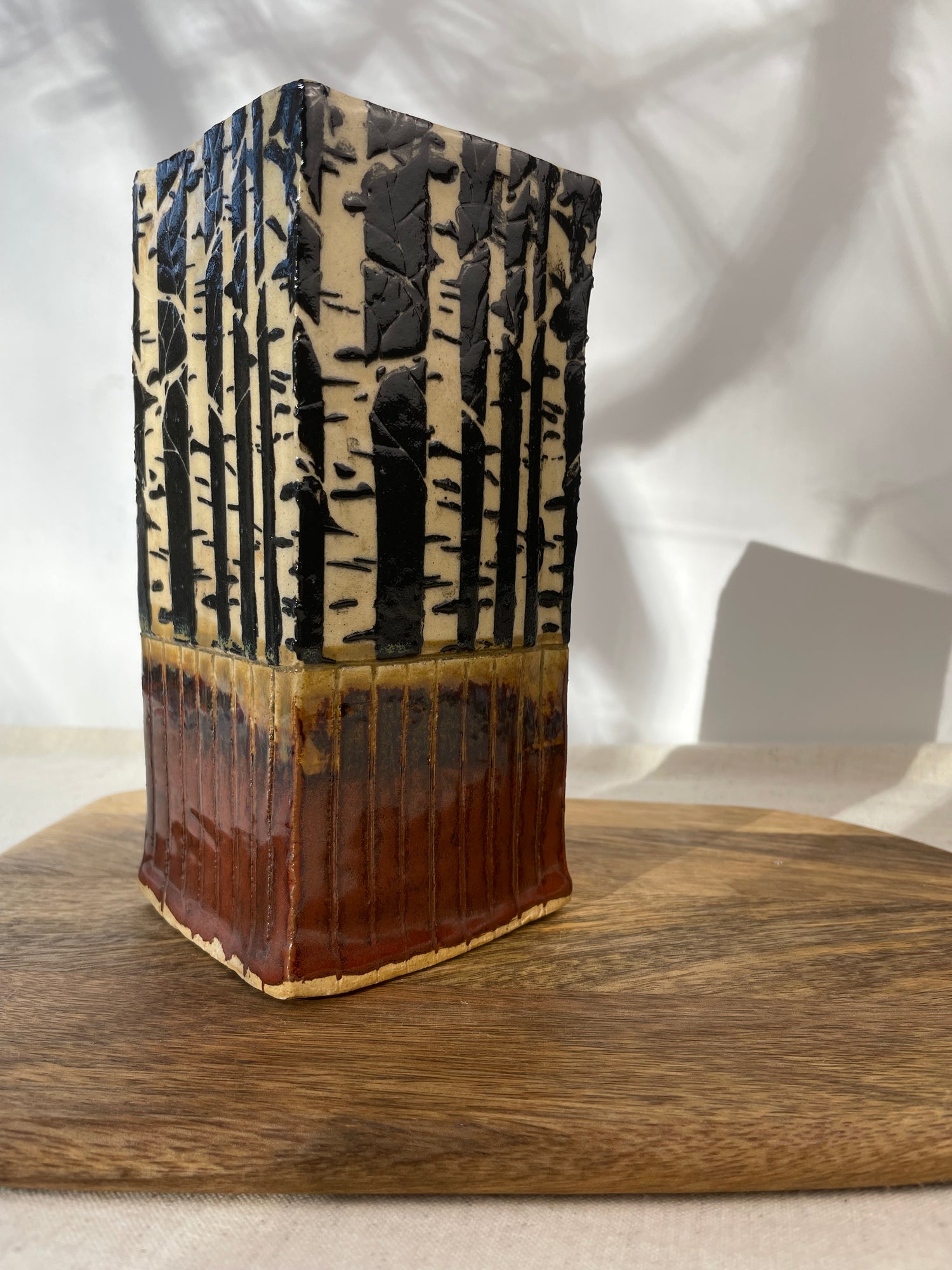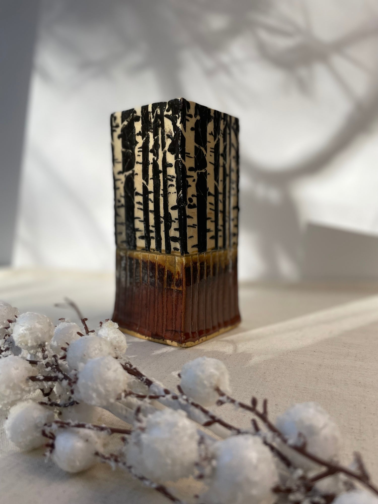 This vase is constructed from slabs that I dried separately and joined once they were firm. After its first firing in an electric kiln, I painted on black underglaze while retaining the white of the clay to capture a birch forest. The lower third is dipped in a warm earthy tone reminiscent of a humus-rich forest floor. The clear liner glaze in the interior displays some crackles, as seen in the photo, which do not affect the functionality of the vase.