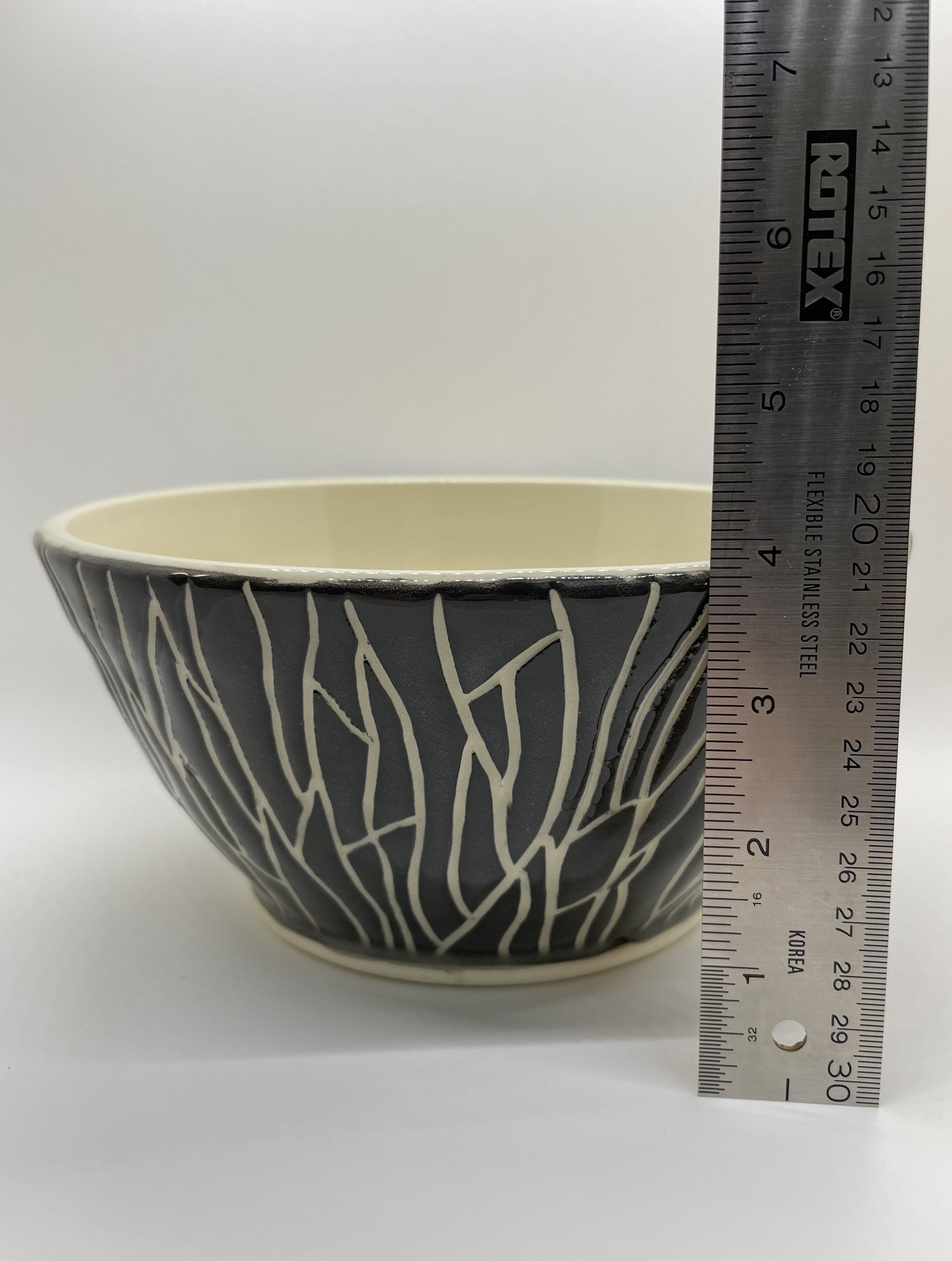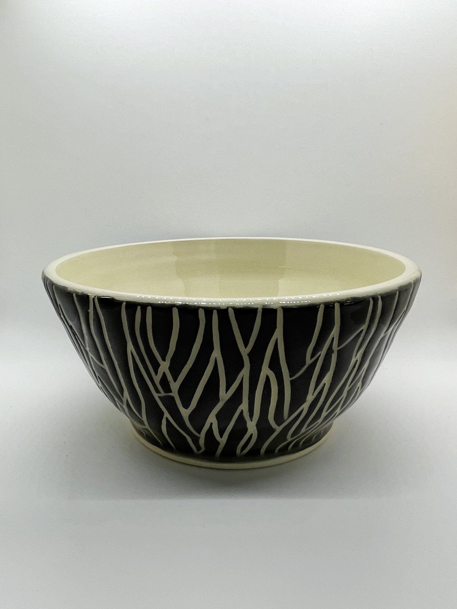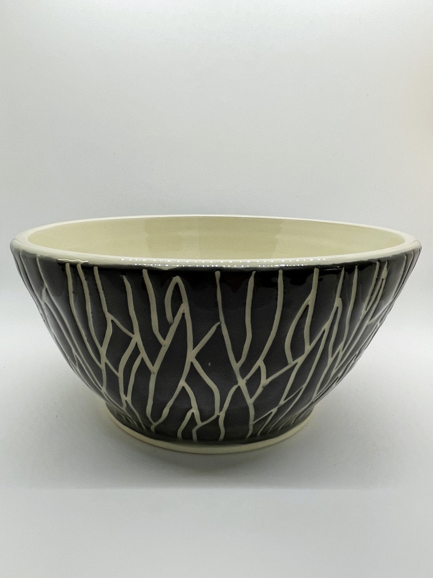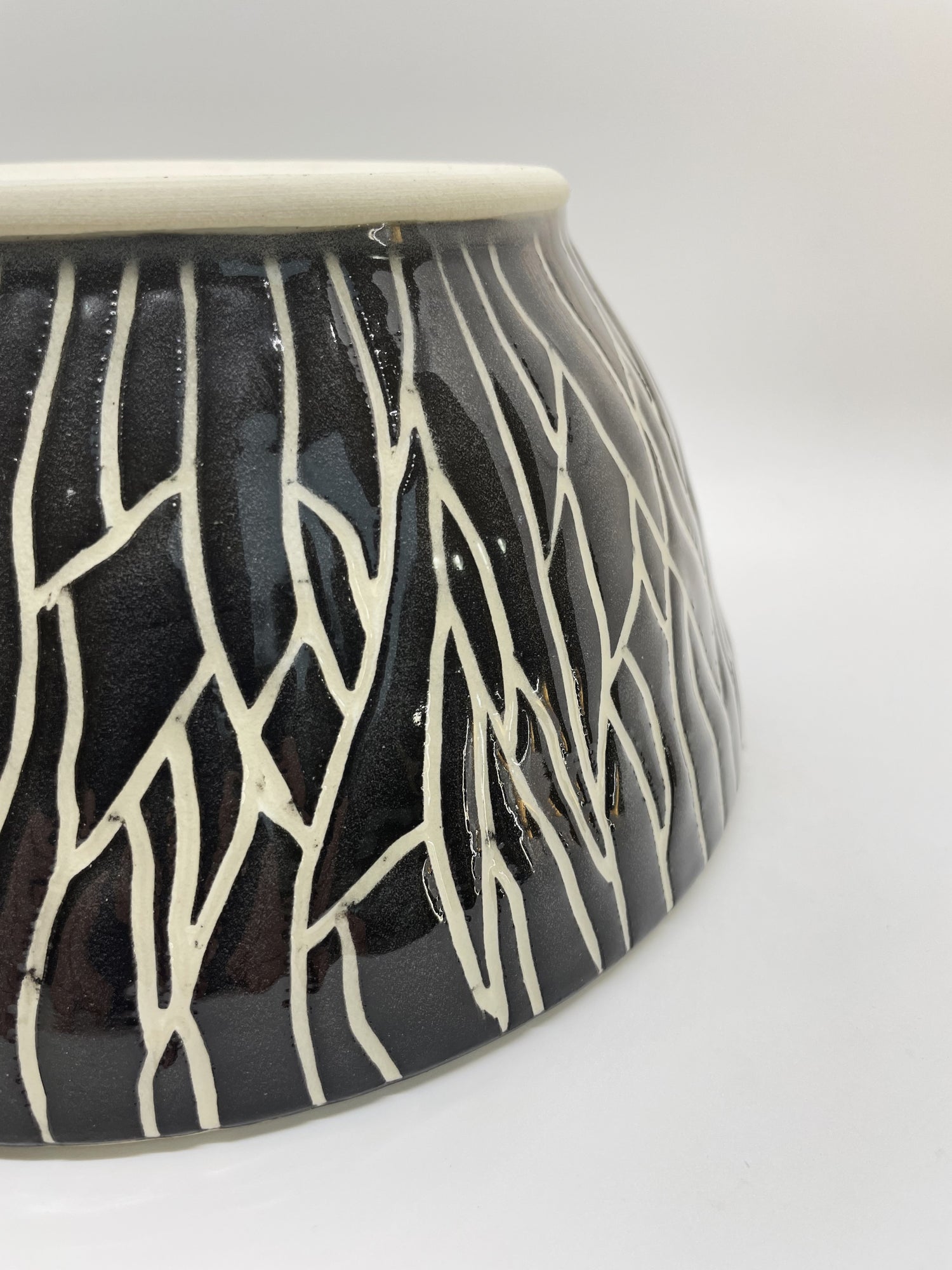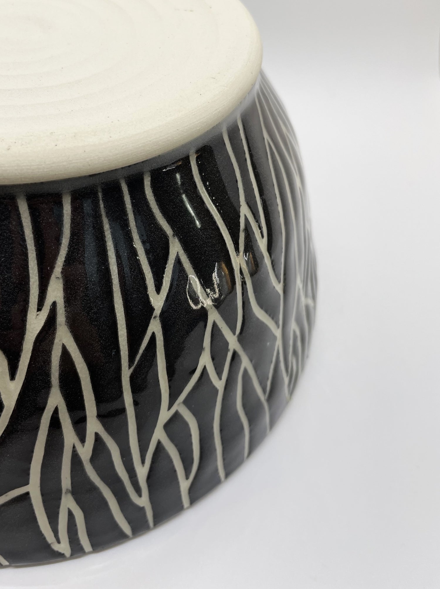 For gatherings, fill this textured black and white ceramic bowl with side dishes, popcorn, chips, pilafs, pasta salad and more. Or simply enjoy its dark and dramatic vibe as an elegantly rustic home-decor accessory. After throwing this footed bowl on the wheel, I painted a hand-tinted velvety black slip all over the surface, into which I carved a bark texture. Once fired in an electric kiln, I dipped it in a clear glaze for durability and shine.
