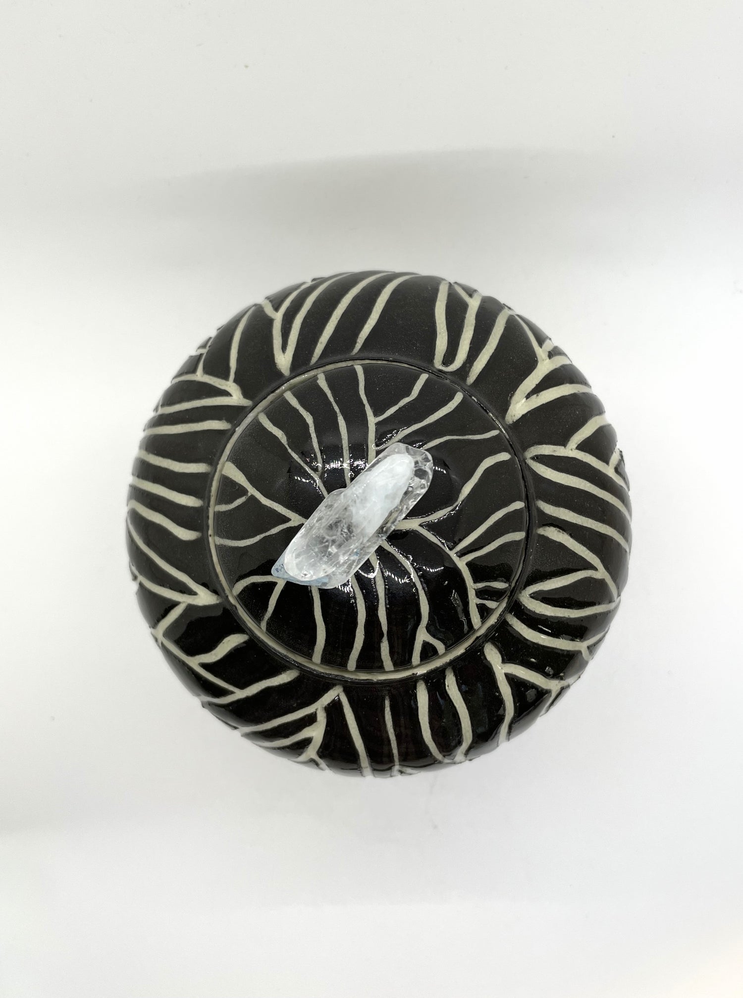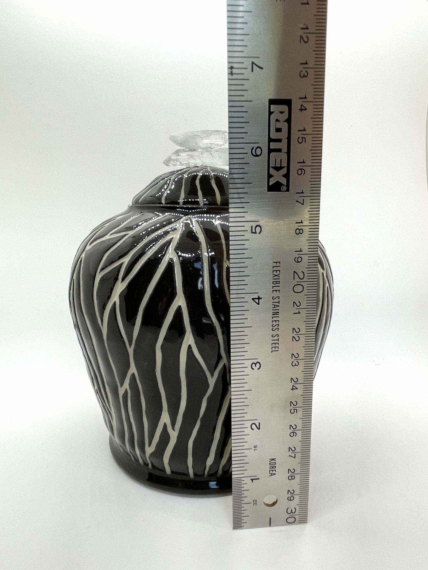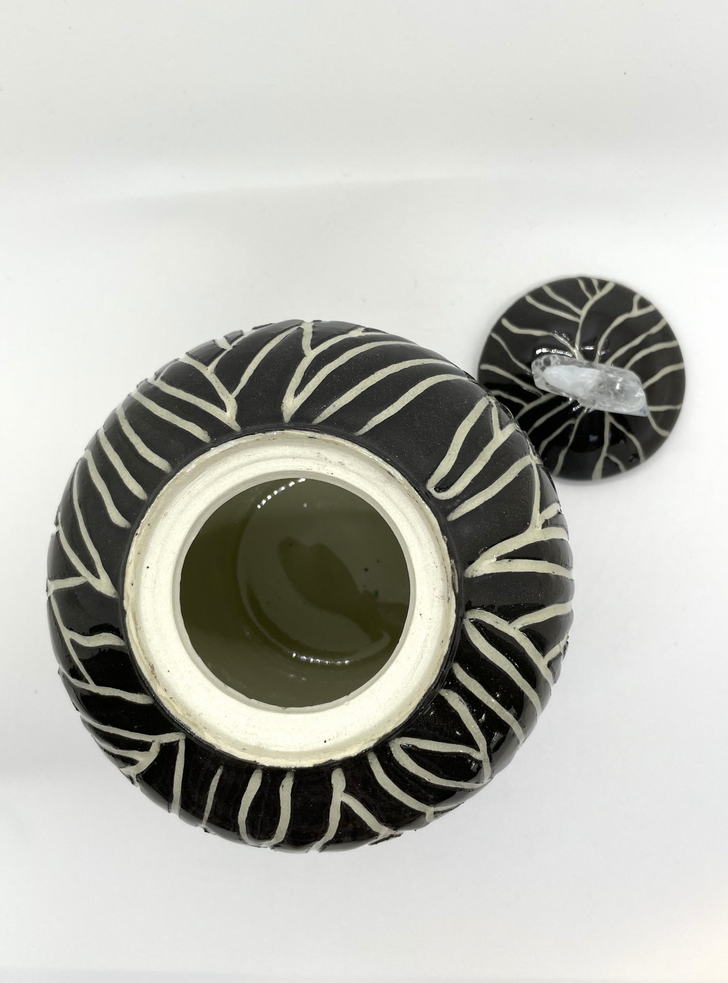 I used stoneware clay to throw this vessel and lid on a potter’s wheel, then I painted them with liquid clay stained velvety black. Once the slip dried, I used a technique known as sgraffito to embellish the pieces with carvings. After being fired an electric kiln for the first time, I dipped them in a food-safe clear glaze. Next, they were fired a second time for a vitrified, durable finish. Finally, to enhance the organic feel of the pot, for a knob, I applied genuine quartz crystal beads.