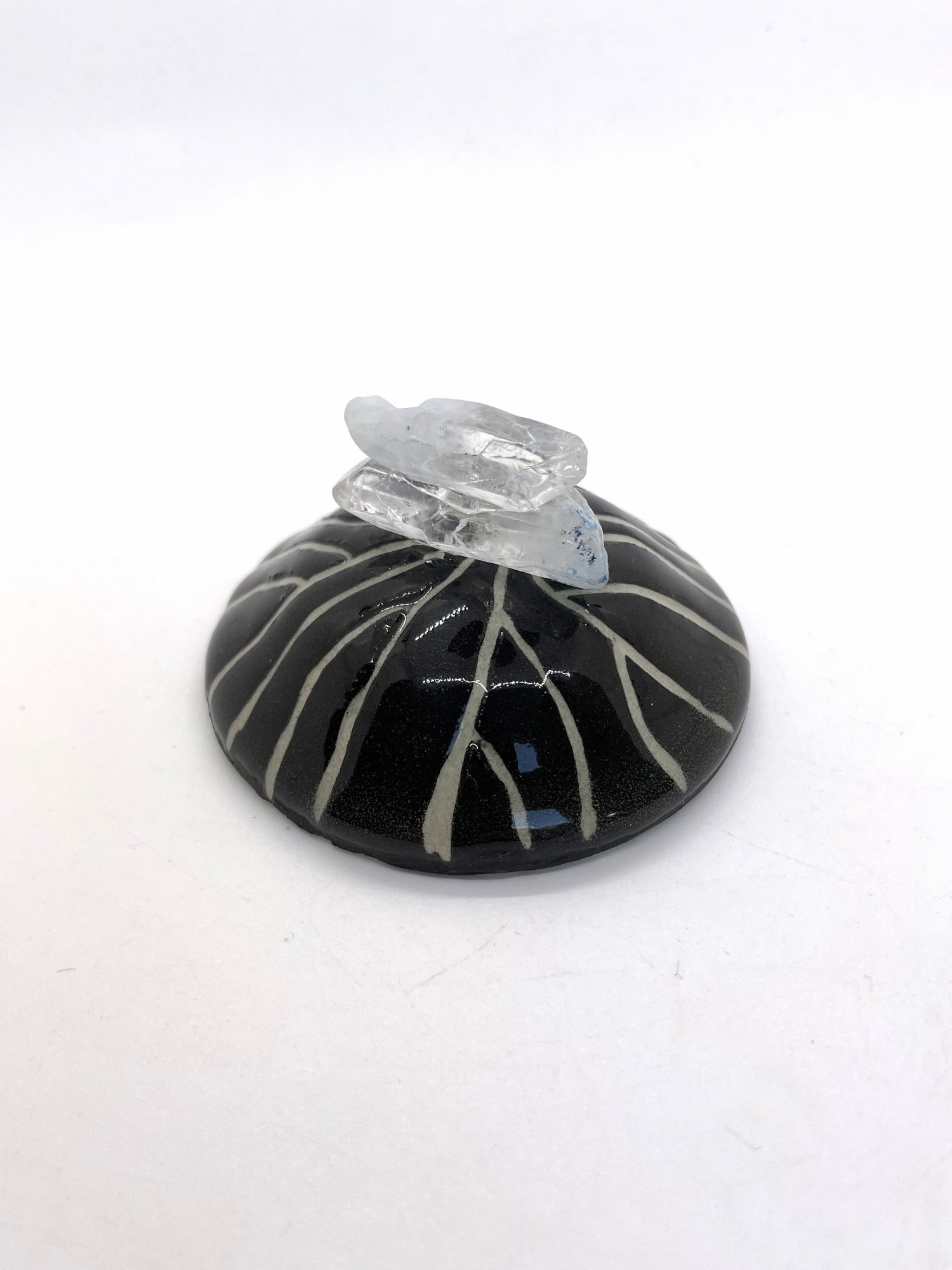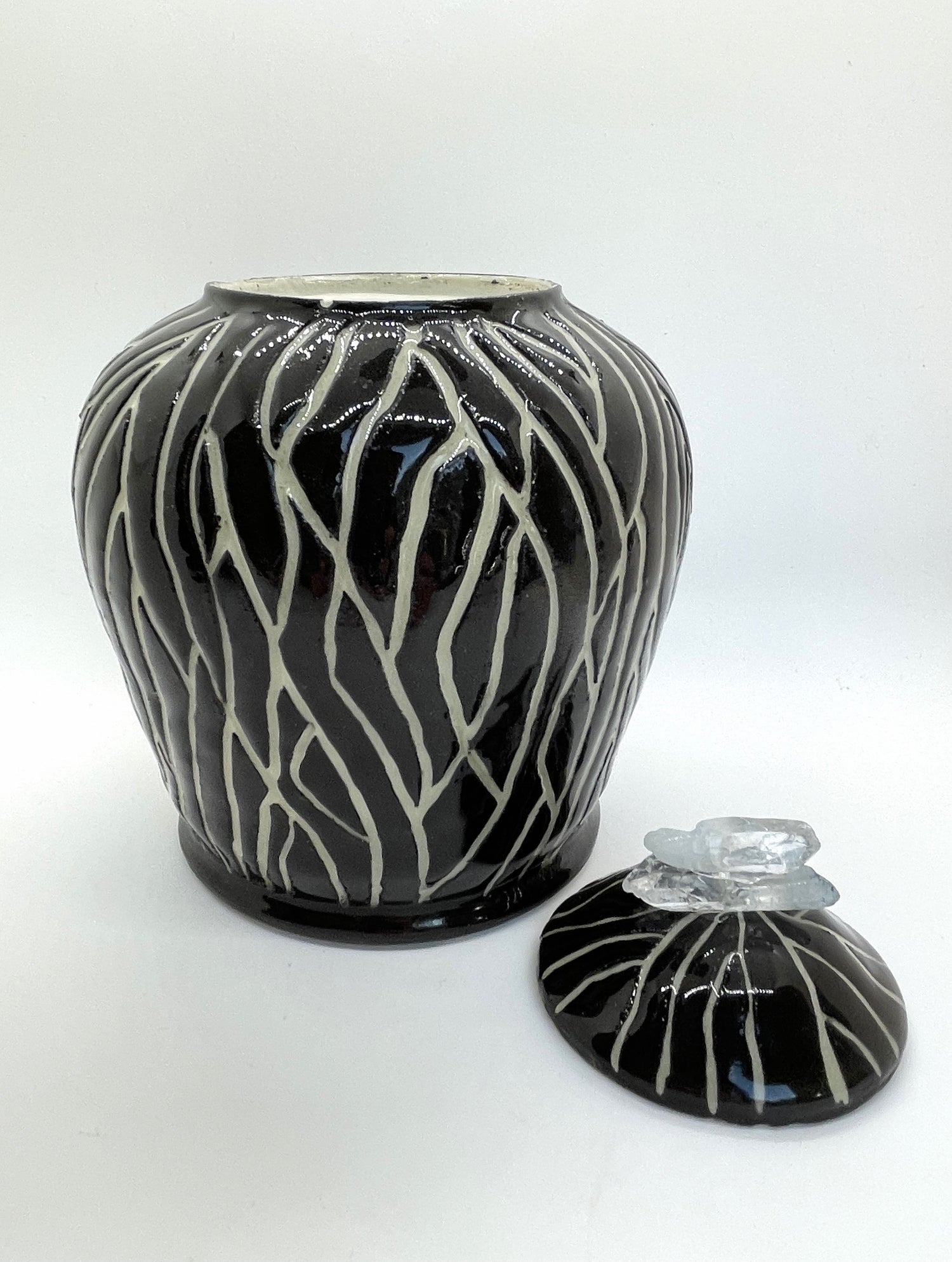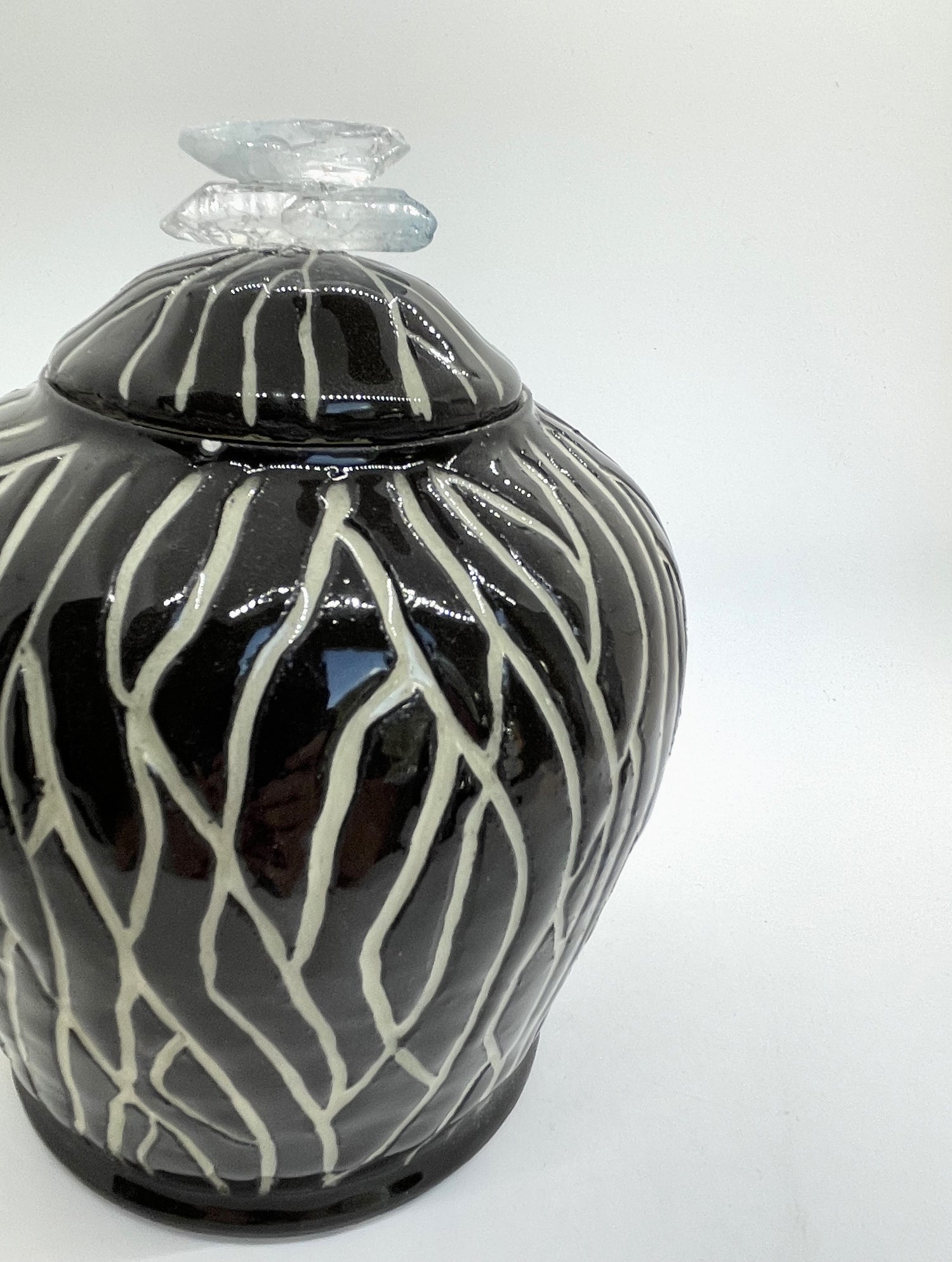 I used stoneware clay to throw this vessel and lid on a potter’s wheel, then I painted them with liquid clay stained velvety black. Once the slip dried, I used a technique known as sgraffito to embellish the pieces with carvings. After being fired an electric kiln for the first time, I dipped them in a food-safe clear glaze. Next, they were fired a second time for a vitrified, durable finish. Finally, to enhance the organic feel of the pot, for a knob, I applied genuine quartz crystal beads.