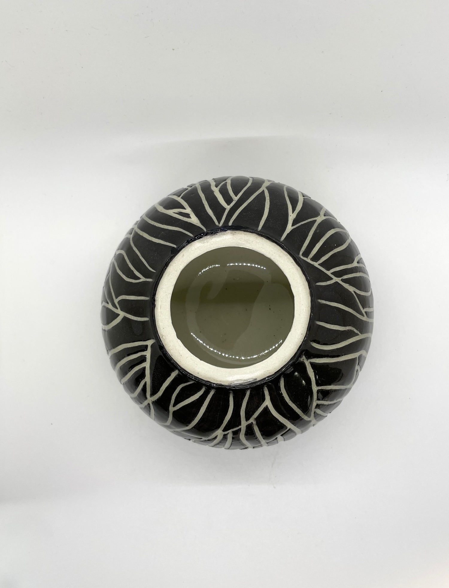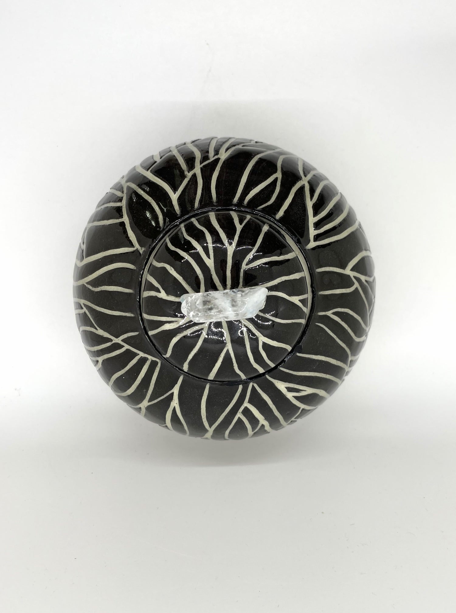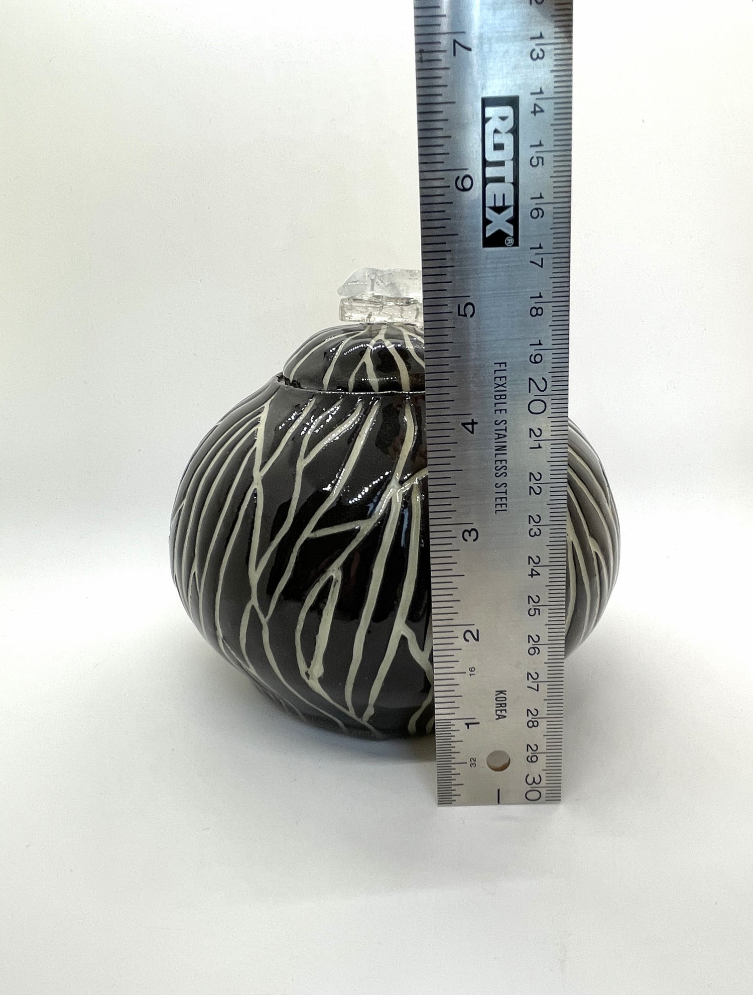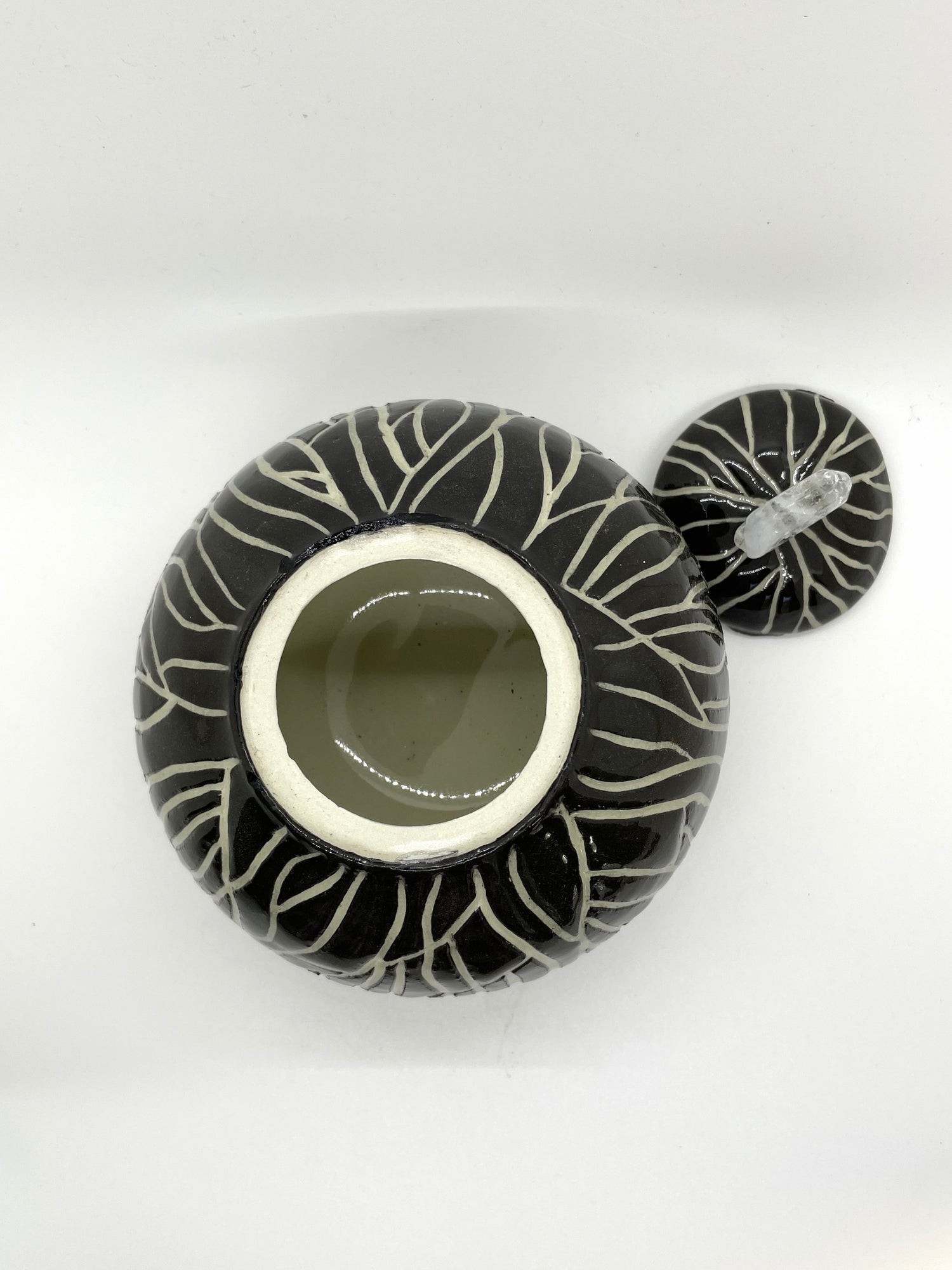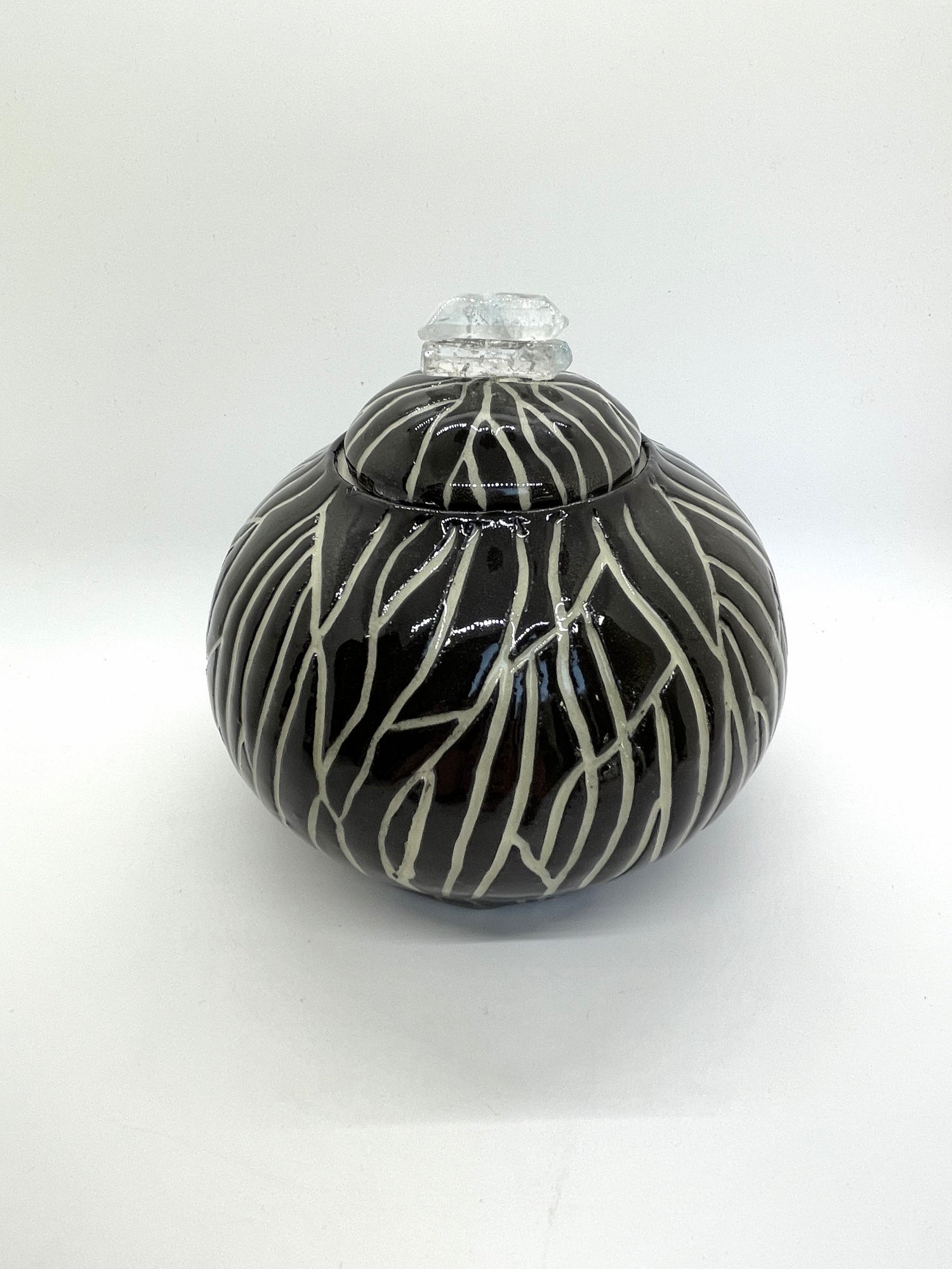 I used stoneware clay to throw this vessel and lid on a potter’s wheel, then I painted them with liquid clay stained velvety black. Once the slip dried, I used a technique known as sgraffito to embellish the pieces with carvings. After being fired an electric kiln for the first time, I dipped them in a food-safe clear glaze. Next, they were fired a second time for a vitrified, durable finish. Finally, to enhance the organic feel of the pot, for a knob, I applied genuine quartz crystal beads.