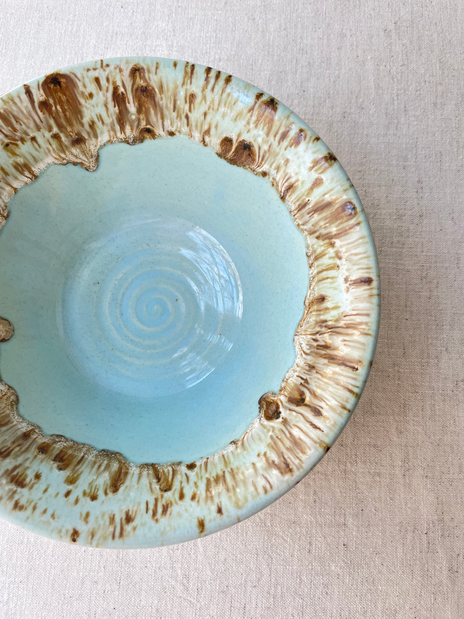 Enjoy a fresh presentation of salads, sides, fresh fruit, and more. A flowing matte white glaze with chocolate-brown crystals paired with translucent turquoise makes an elegantly organic impact on your table. Both decorative and functional, the larger 8-inch bowl makes a wonderful fruit bowl, salad bowl or pasta serving dish for families or gatherings. The medium 7-inch bowl works well for side-dishes and desserts.Â