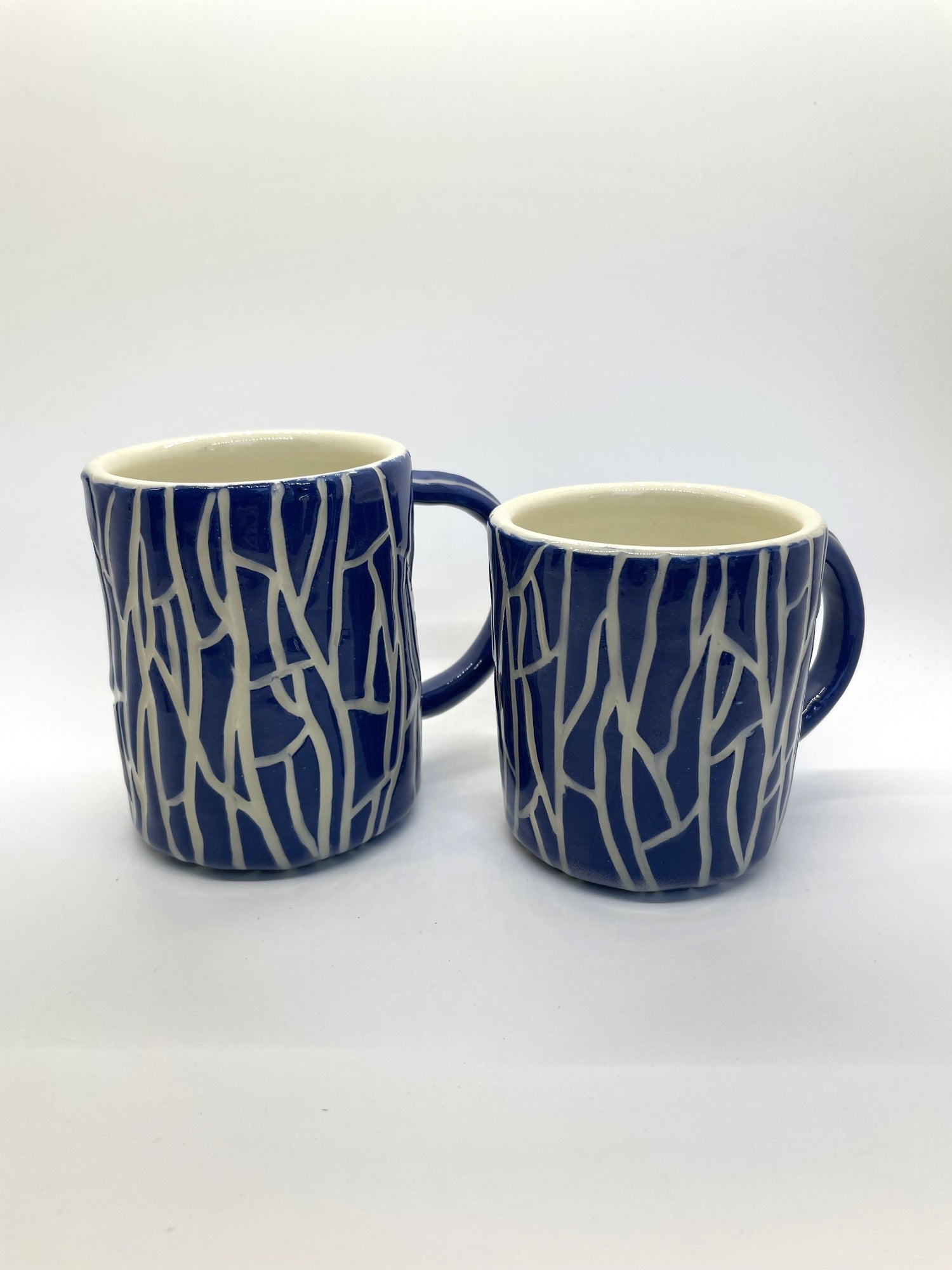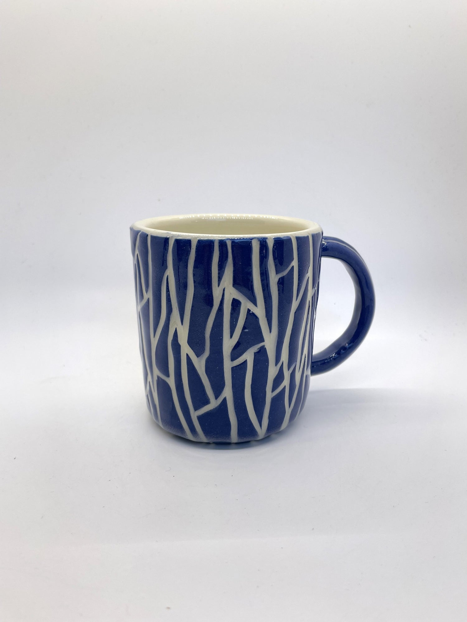 After I threw the form on the wheel, I hand-painted the surface with several coats of slip (liquid clay) that I had tinted rich cobalt. I then carved bark texture using a technique known as sgraffito. The handcrafted textured black cup has a shiny clear glaze for durability and gloss. This mug holds 8 oz.