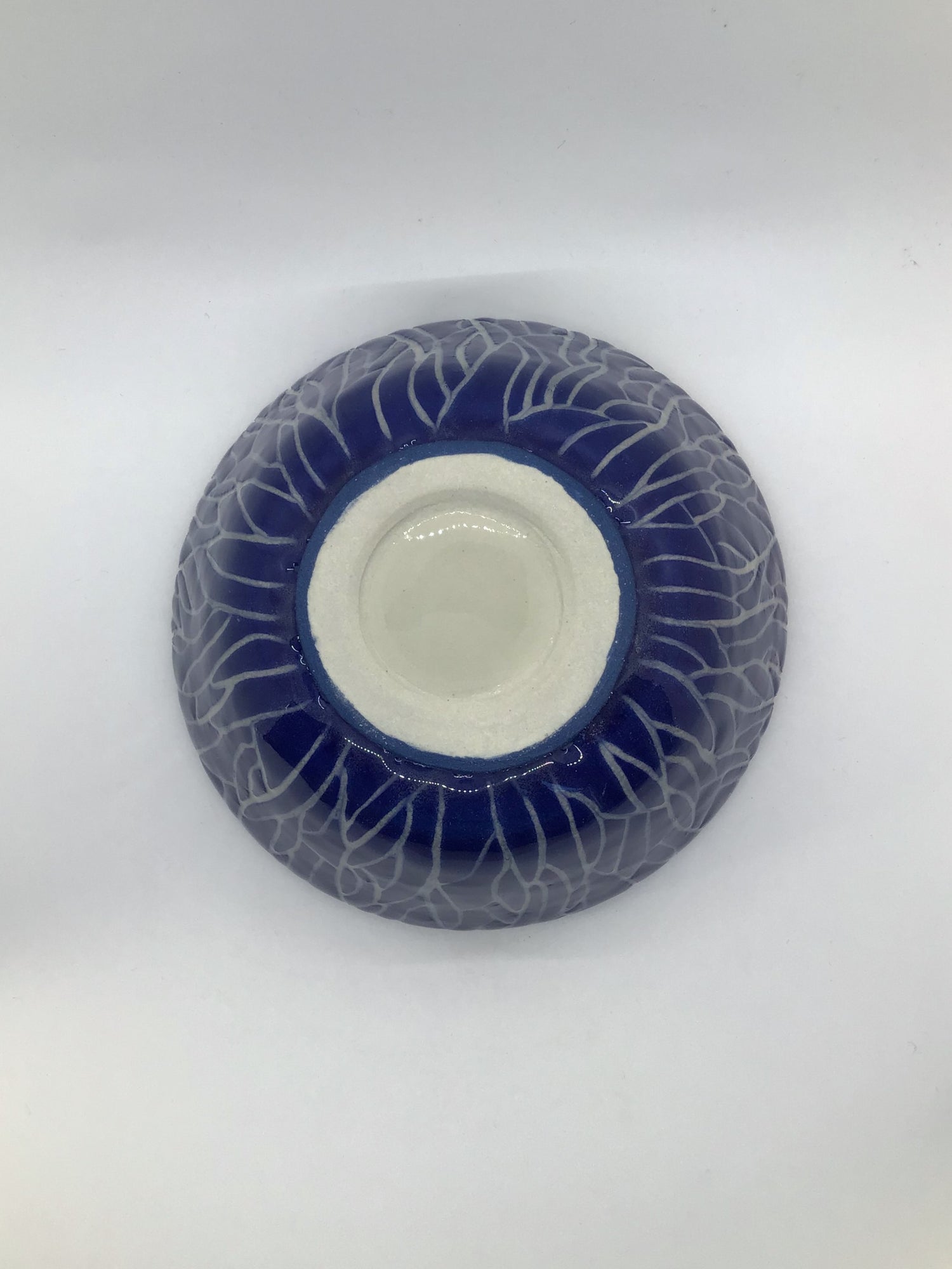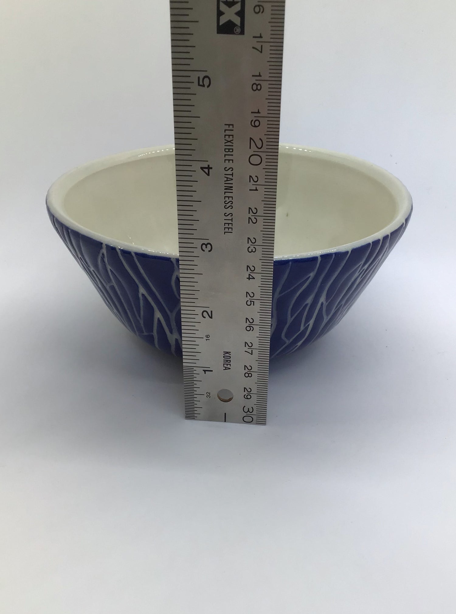 For gatherings, fillĀ this textured blue ceramic bowl with crackers, candy, snacks, cookies, small side dishes of pilafs, couscous and more. Enjoy noodles, cereal, soup, stews or grain bowls. Or simply enjoy it as a home-decor accessory. After throwing this bowl on the wheel, I painted cobalt-coloured slip all over the surface, into which I carved a bark texture.Ā OnceĀ fired in an electric kiln, I dipped it in a clear glaze for durability and shine.
