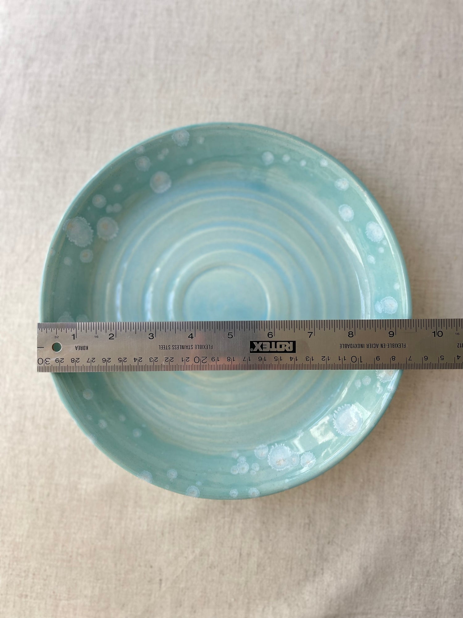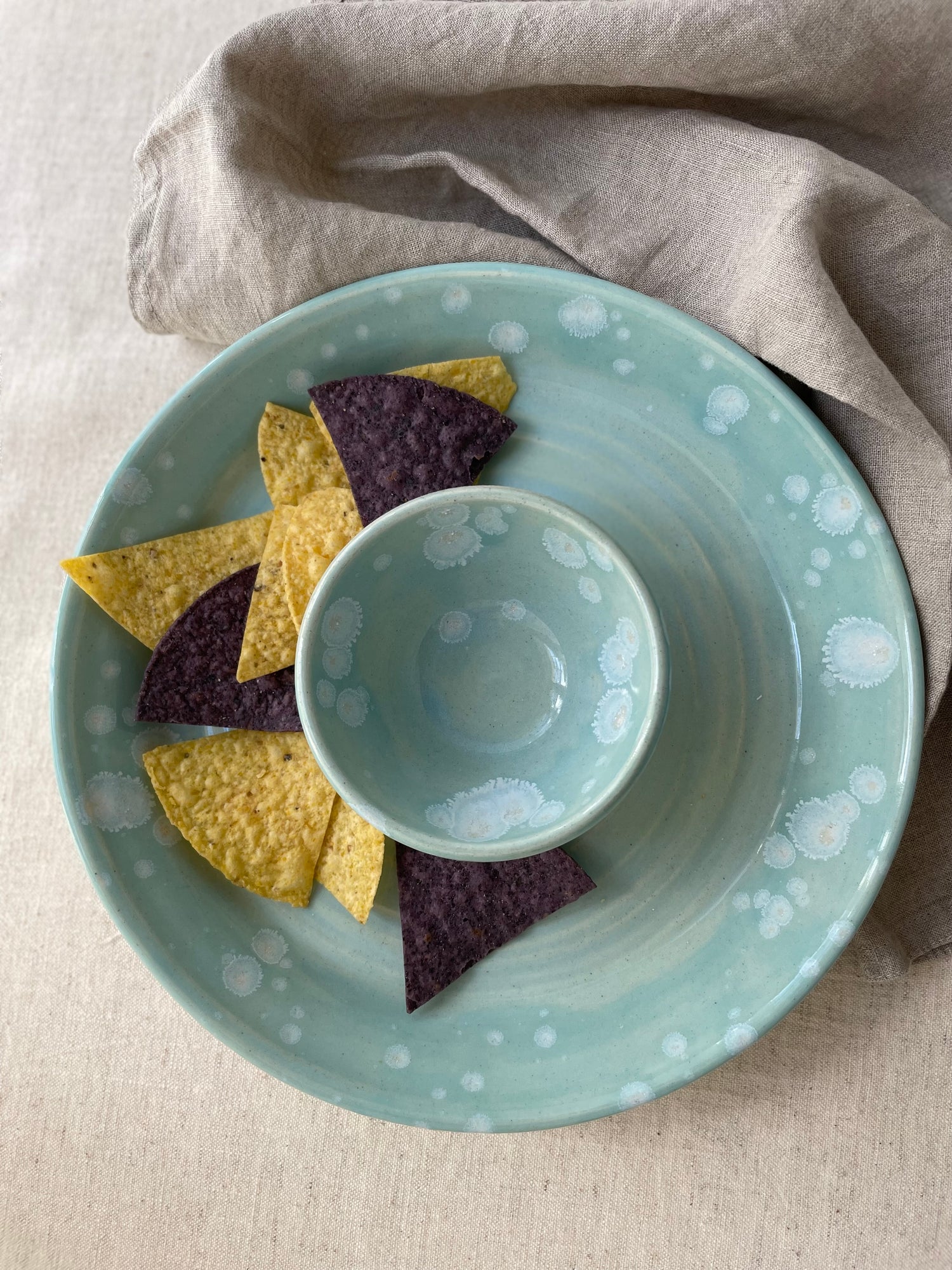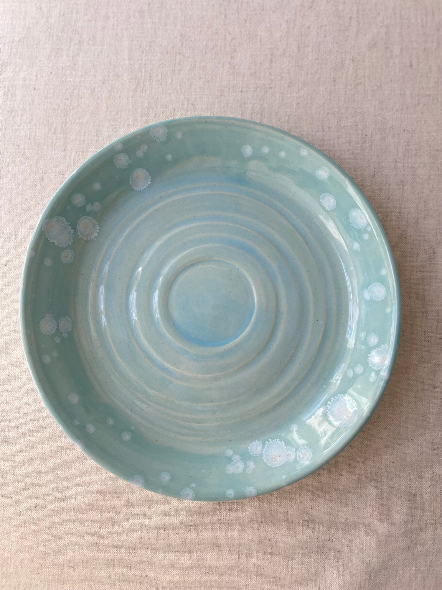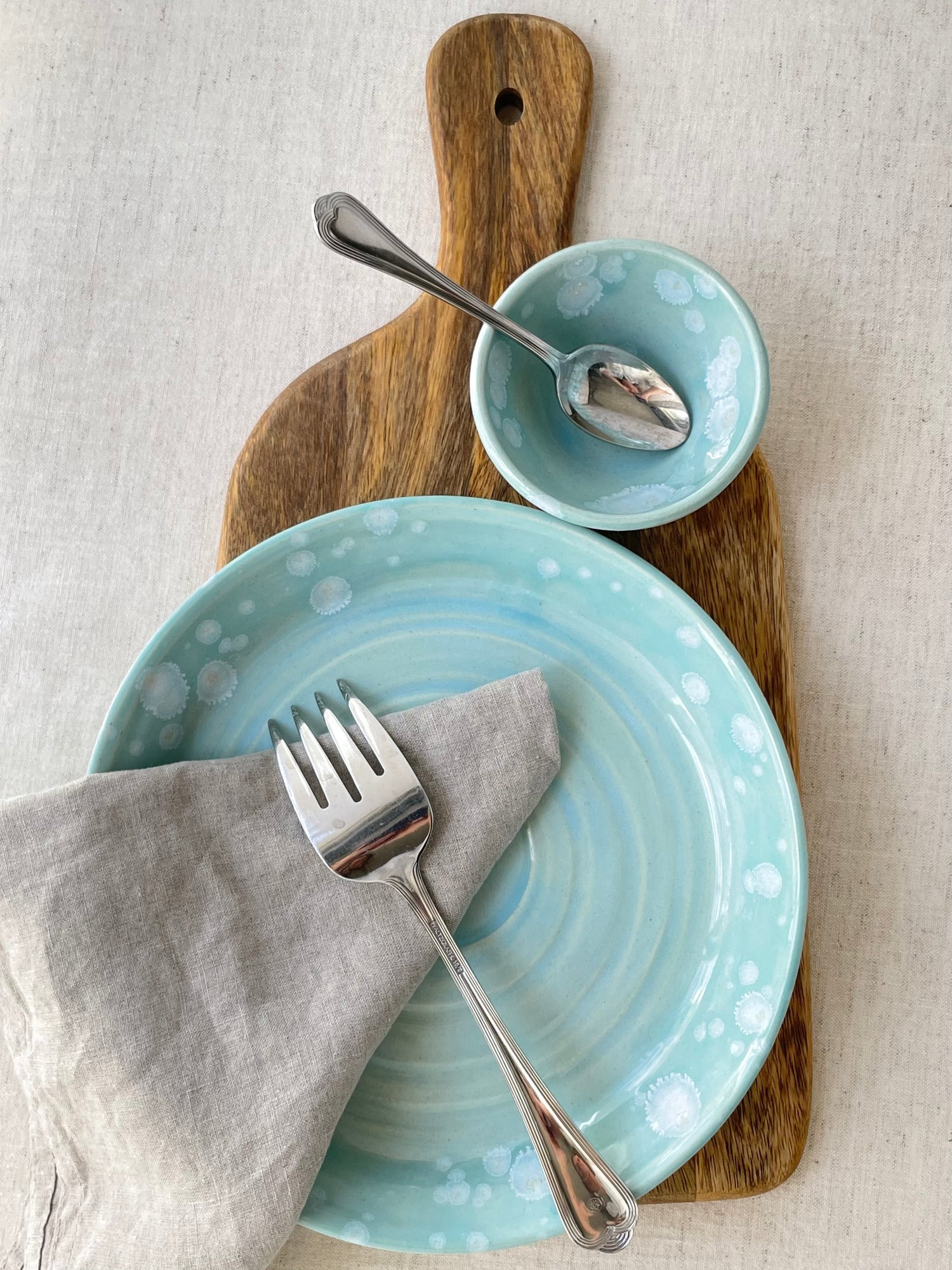 Stoneware clay gives this set its strength and durability. After throwing and bisque firing the ridged plate and small bowl, I used a fresh turquoise tone as a base and applied a crystalline glaze to achieve the organic blooms in the firing process for a truly unique finish.Â