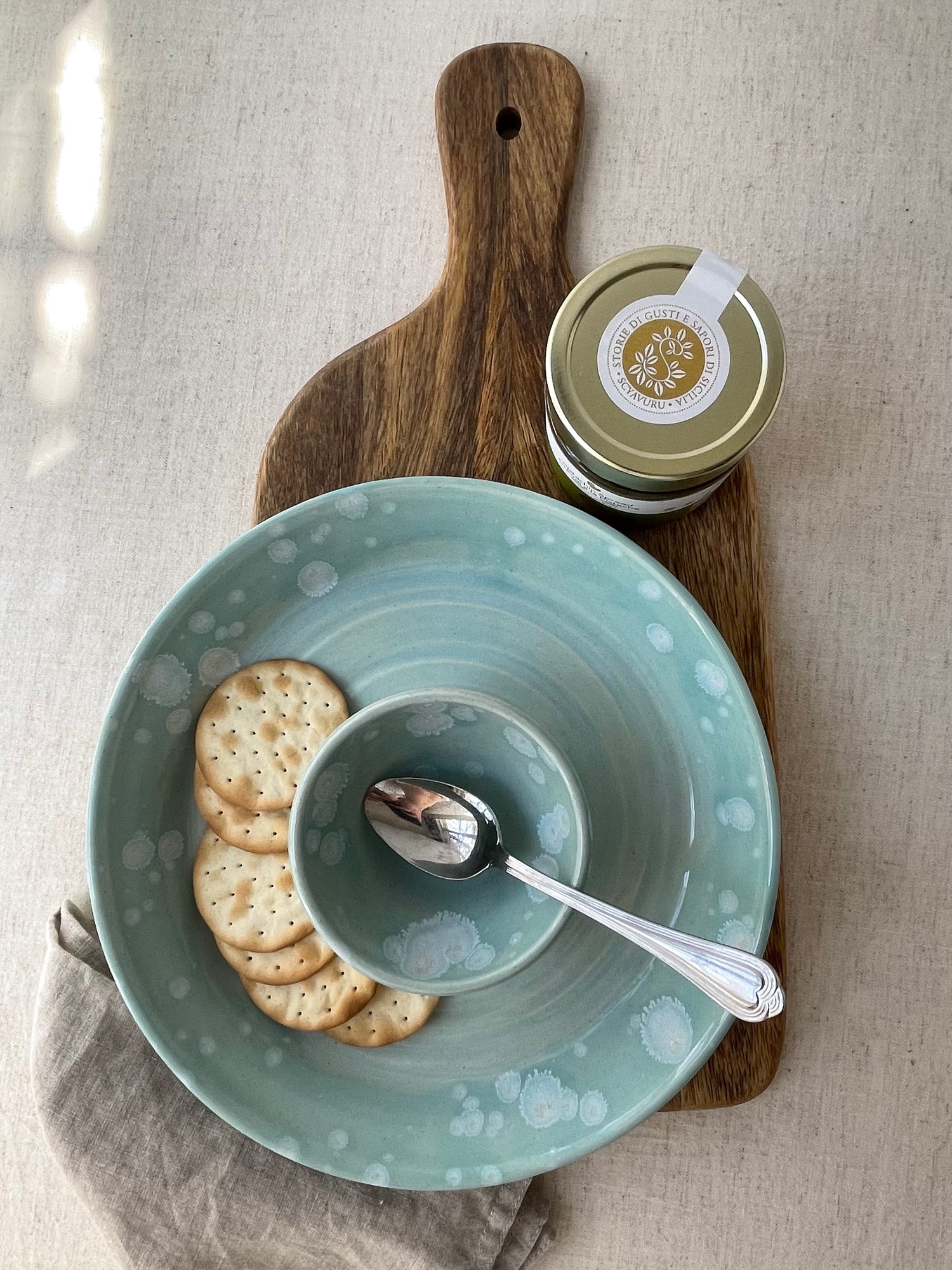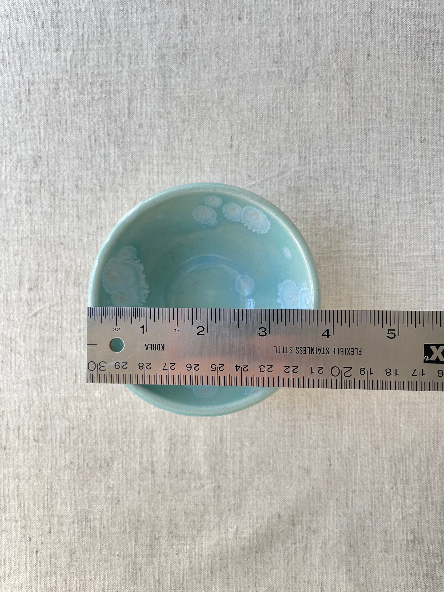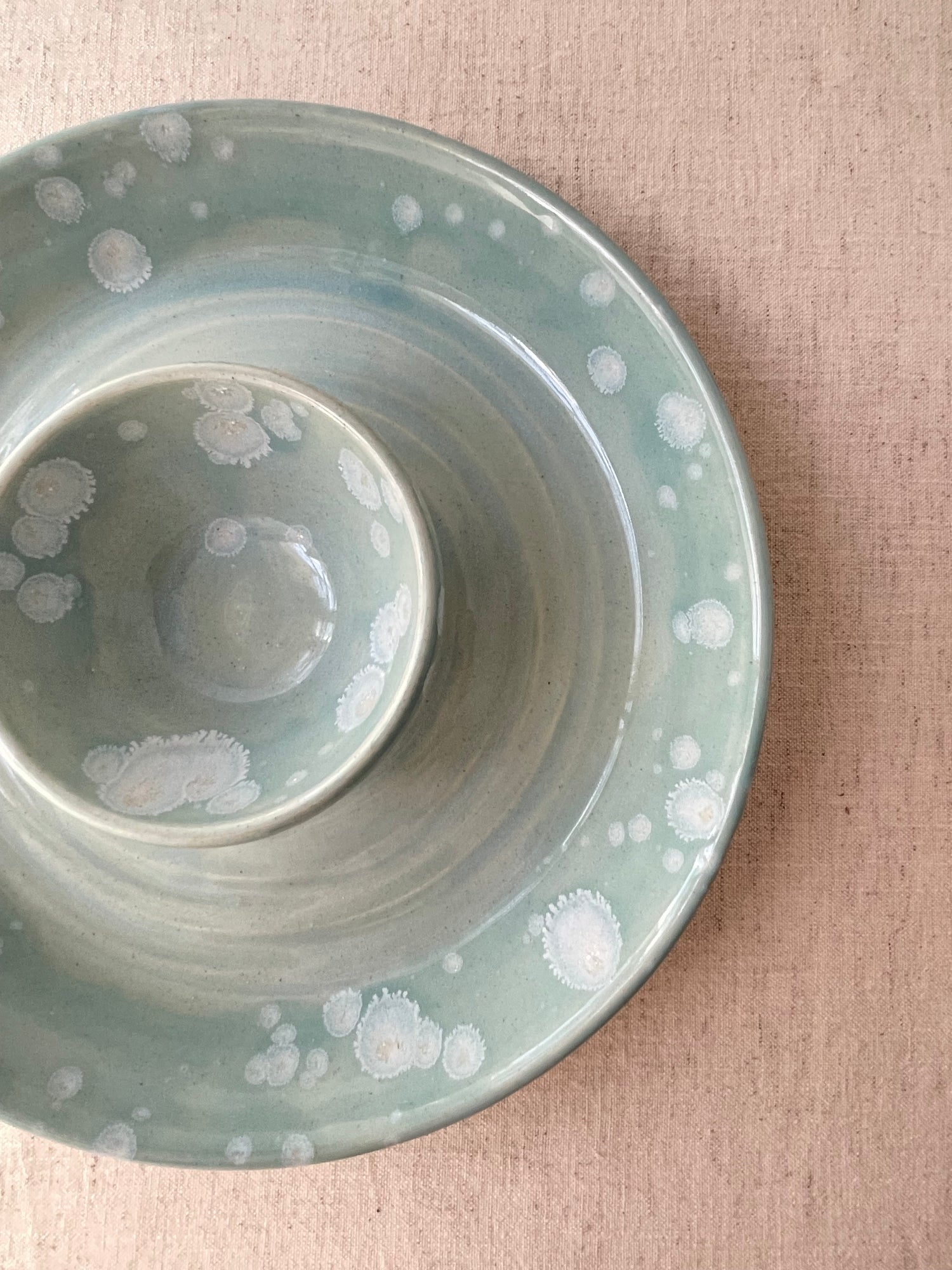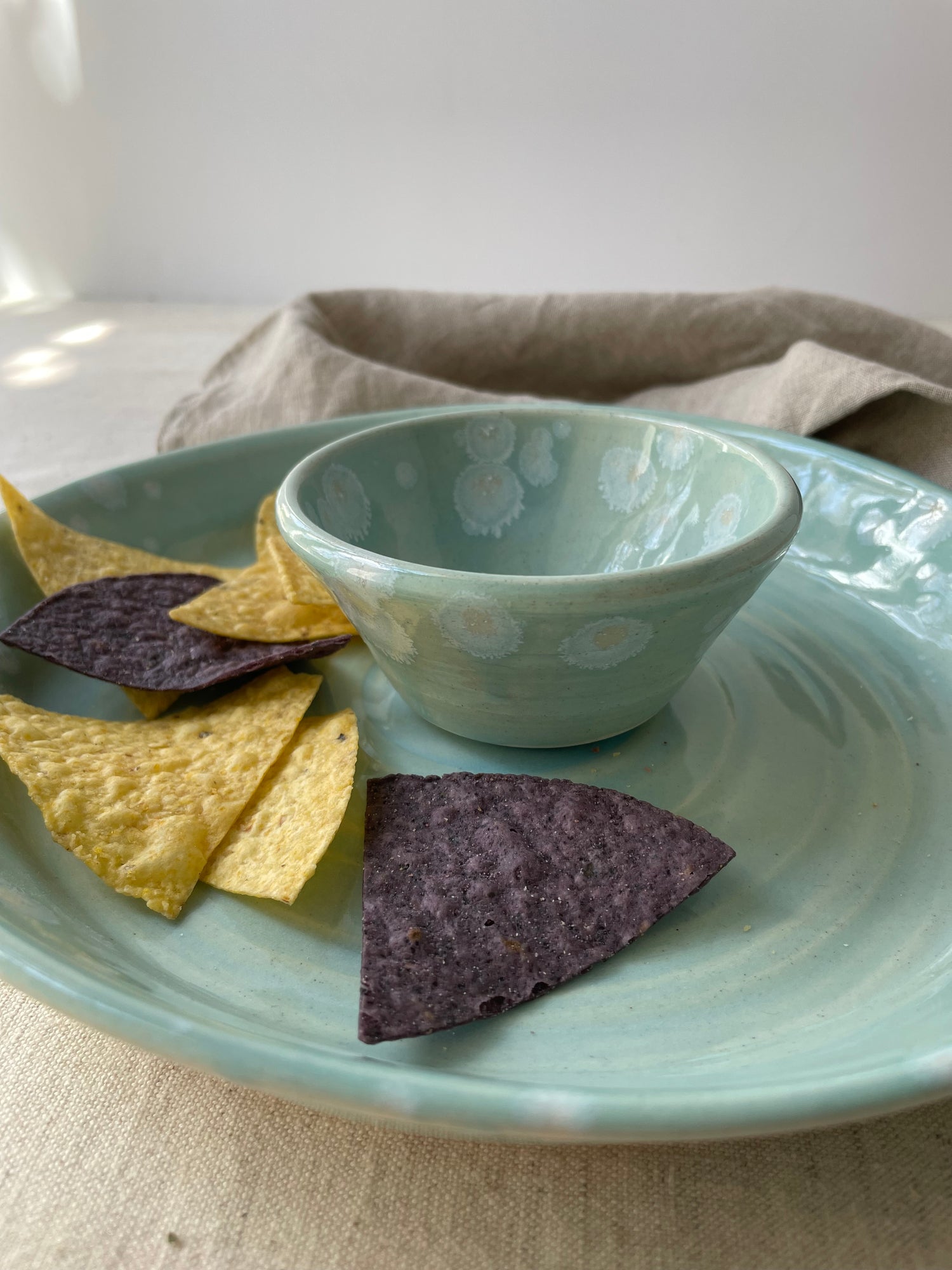 Stoneware clay gives this set its strength and durability. After throwing and bisque firing the ridged plate and small bowl, I used a fresh turquoise tone as a base and applied a crystalline glaze to achieve the organic blooms in the firing process for a truly unique finish.Â