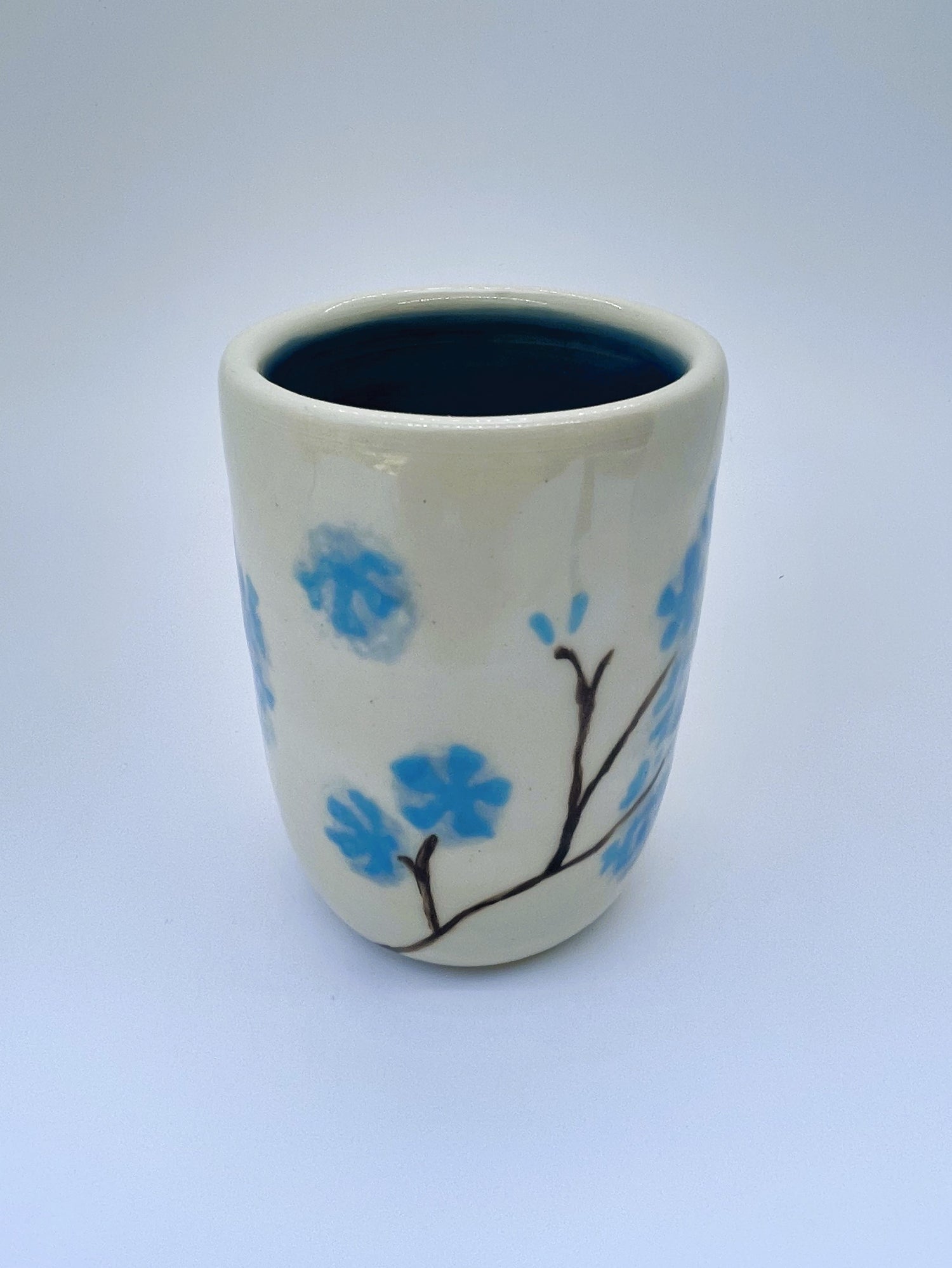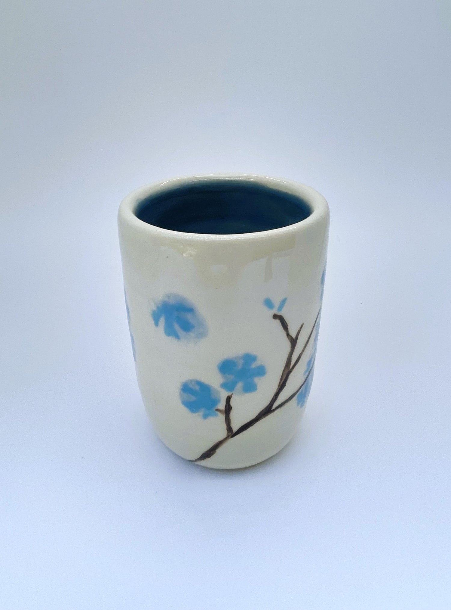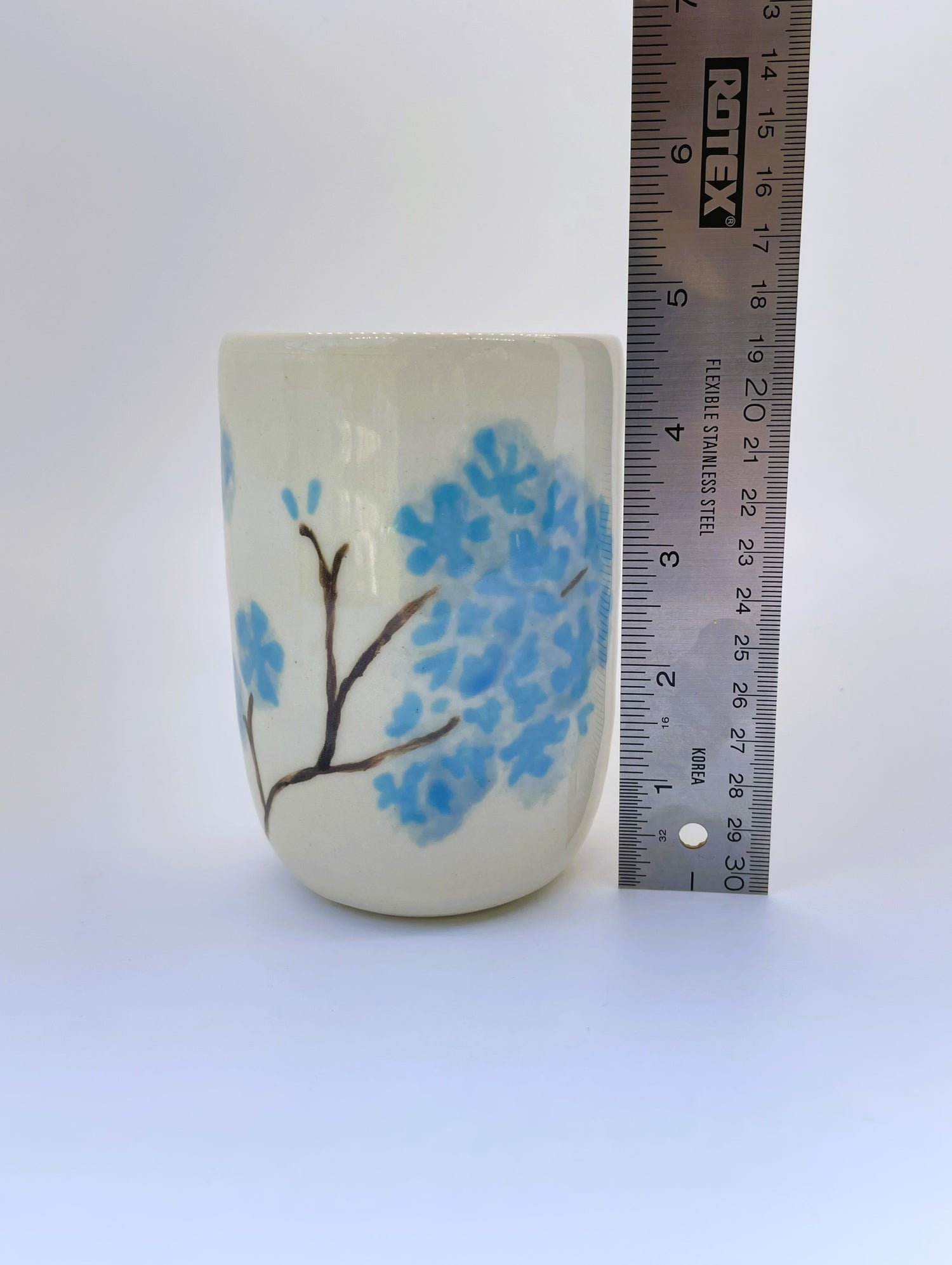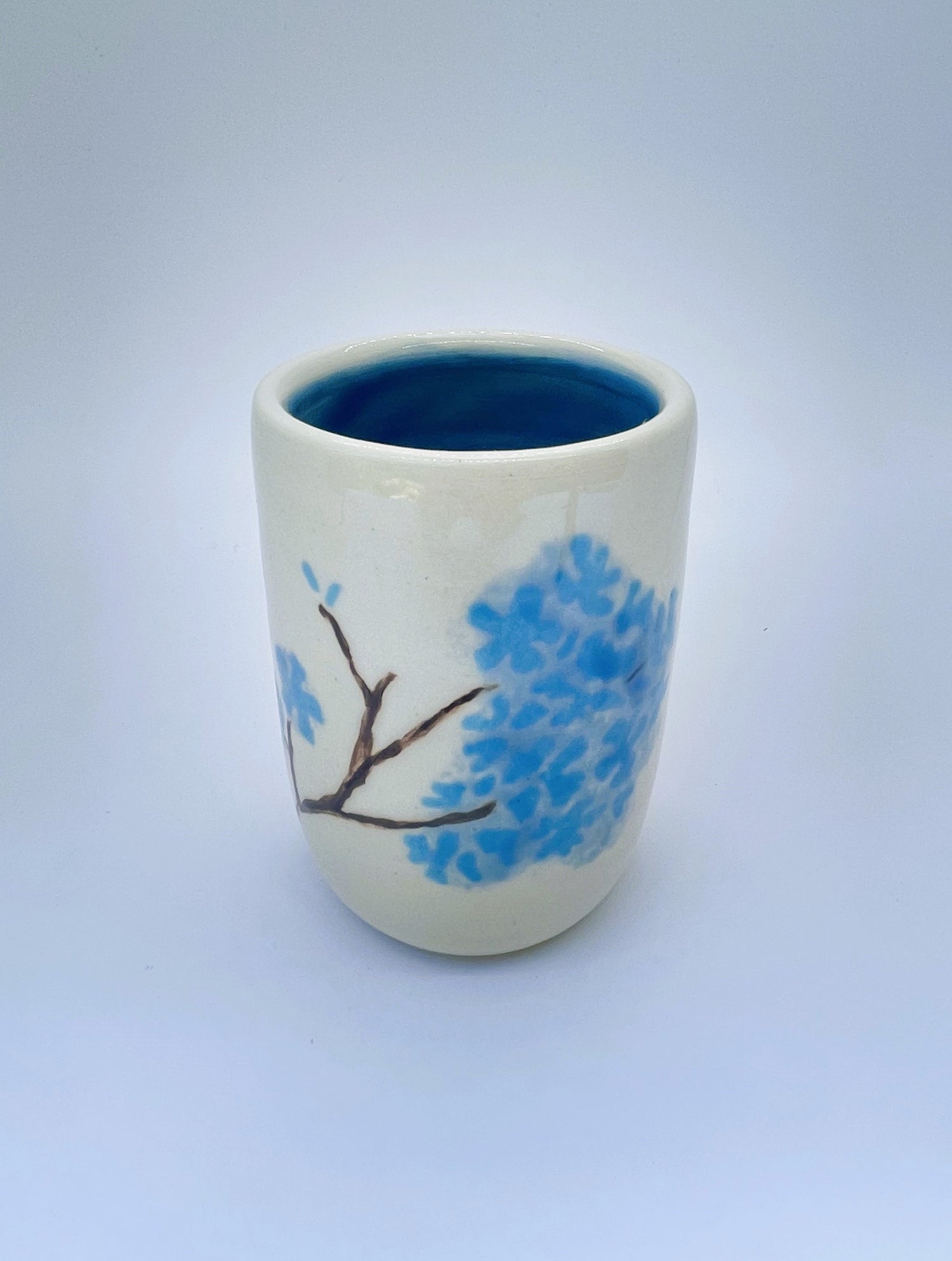 I threw this ceramic vase on the wheel in durable stoneware, and once it was bisque fired, I hand-painted sky-blue hydrangea petals and brown stems in underglaze before firing it a second time to fuse the pattern to the vase. Finally, I hand-painted a translucent light-blue glaze in the interior and sponged on the same glaze over the petals for a diffused romantic effect. It awaits your favourite flowers!