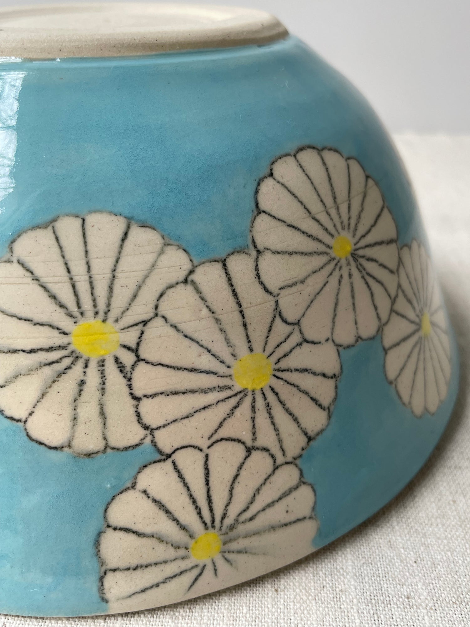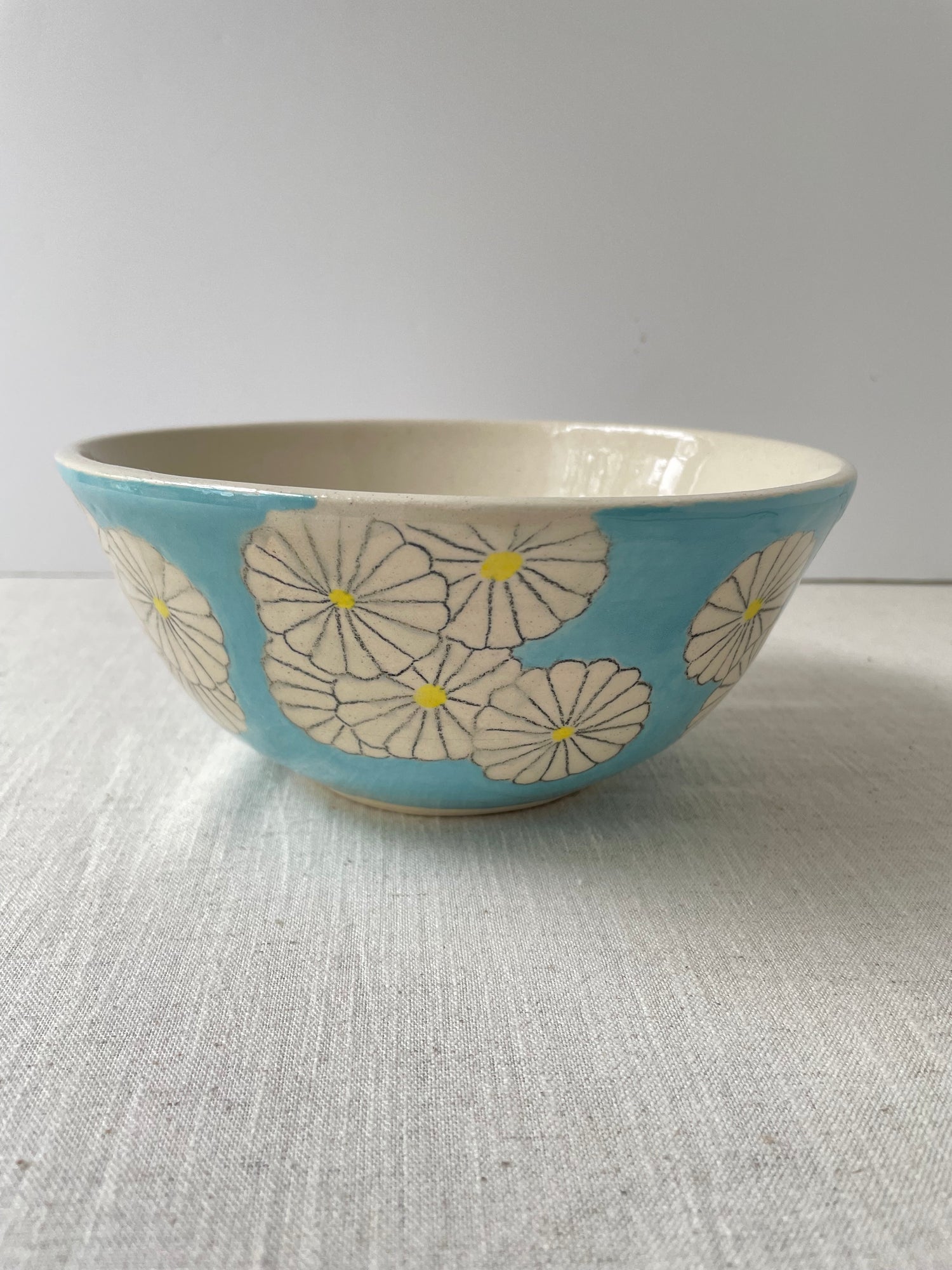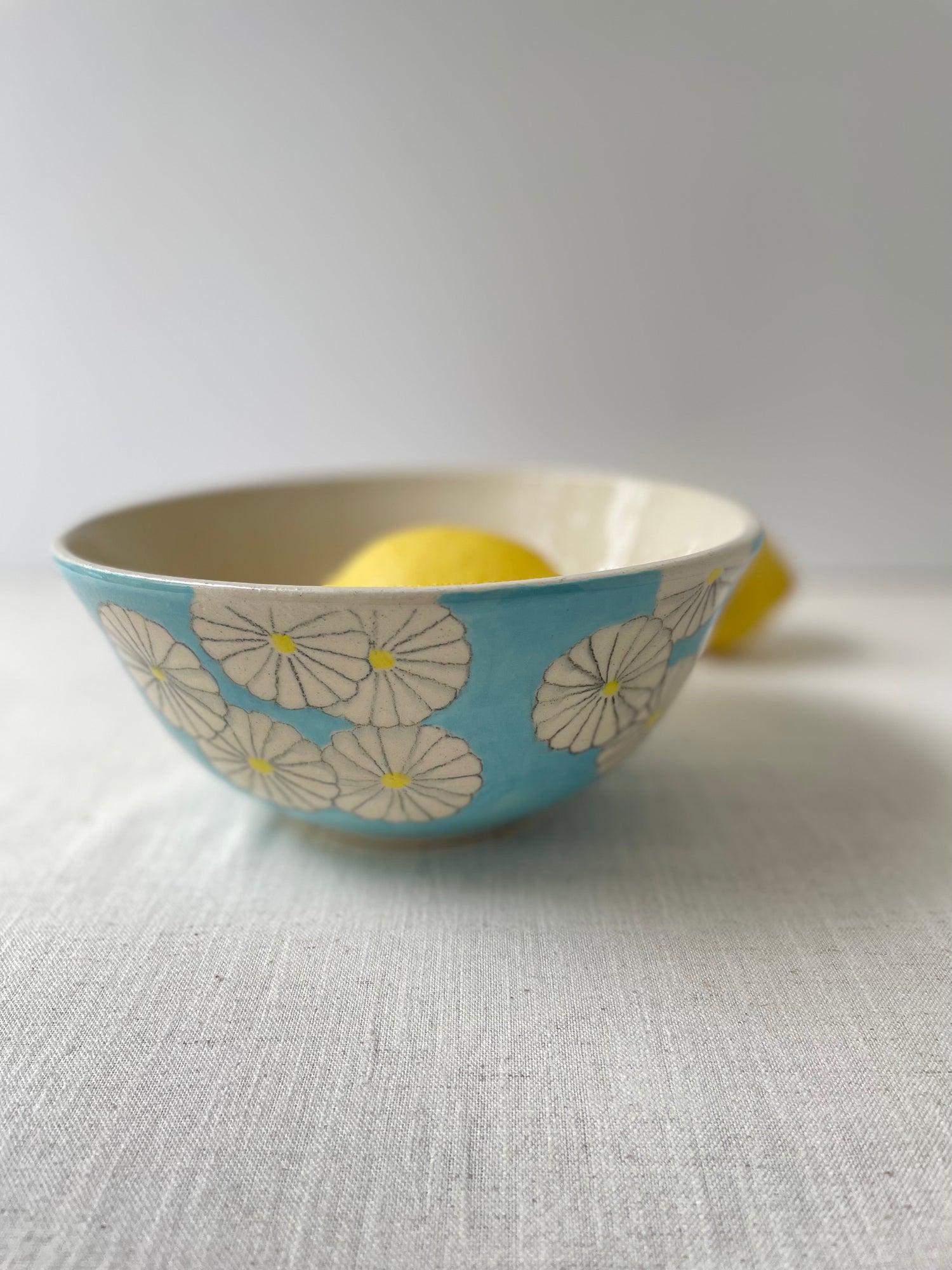 After first firing this stoneware bowl in an electric kiln, I drew each flower in a repeating pattern and painted underglazes on the exterior. The painted pattern gets set with a second firing in the kiln. Finally, I used a glossy clear glaze for a smooth finish before its final glaze firing.