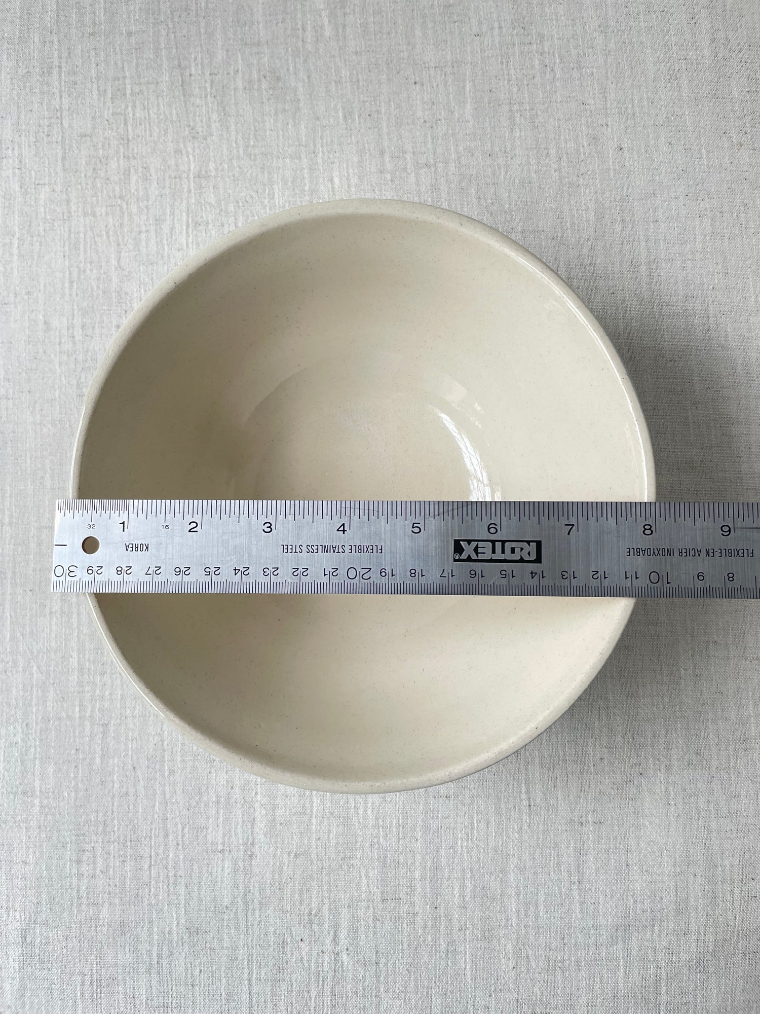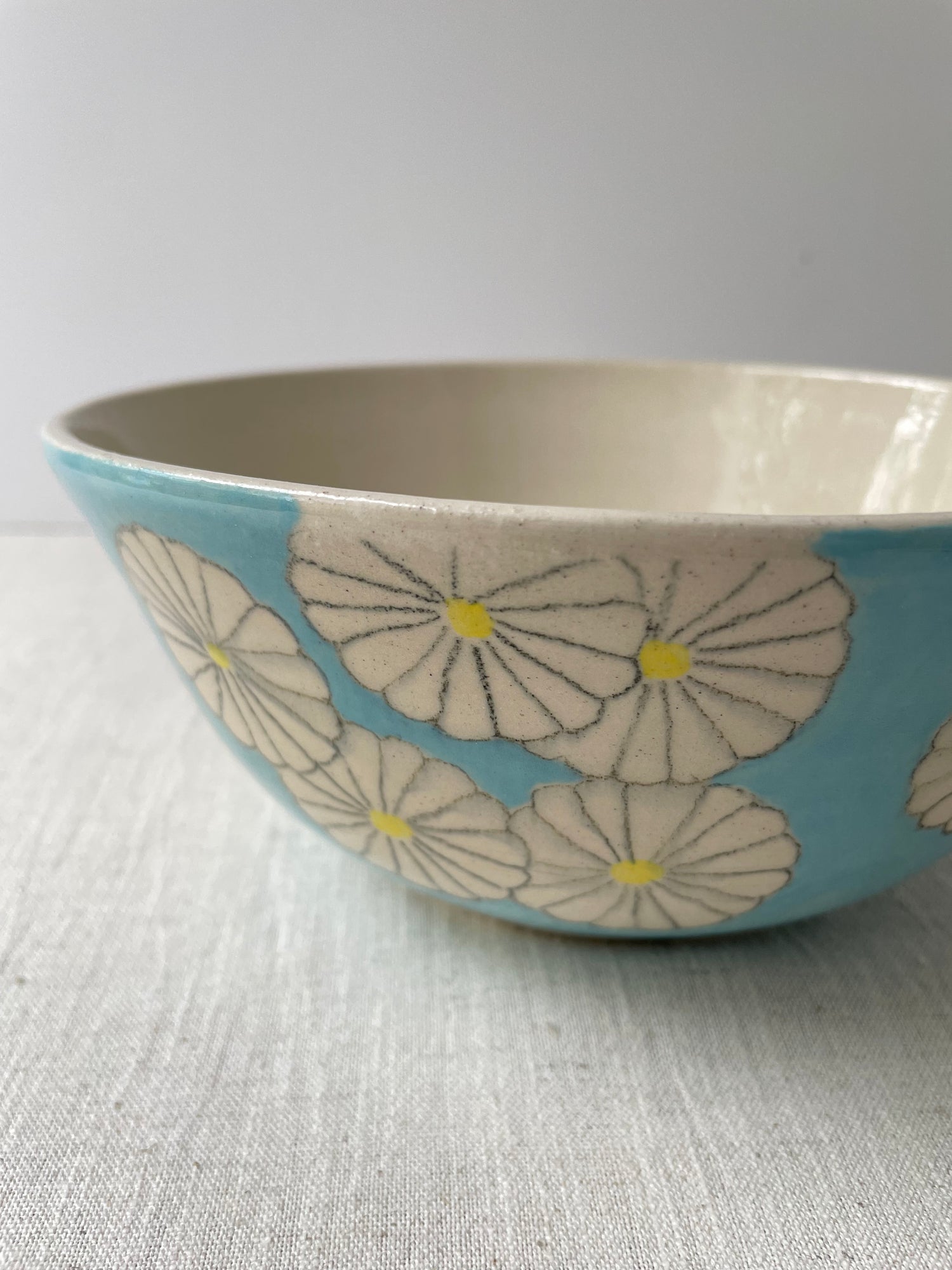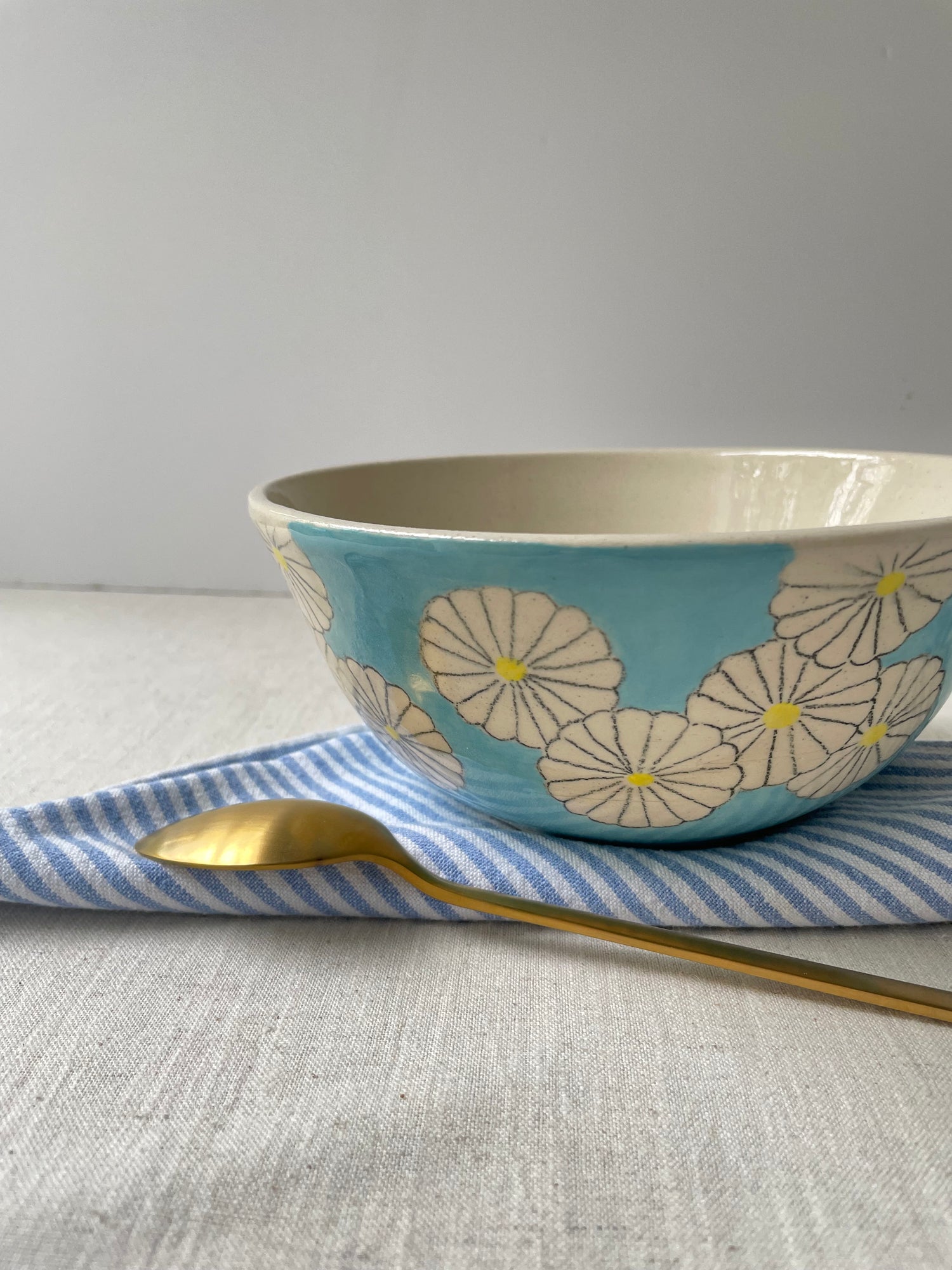 After first firing this stoneware bowl in an electric kiln, I drew each flower in a repeating pattern and painted underglazes on the exterior. The painted pattern gets set with a second firing in the kiln. Finally, I used a glossy clear glaze for a smooth finish before its final glaze firing.