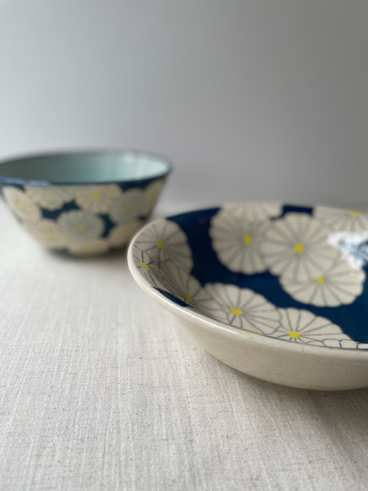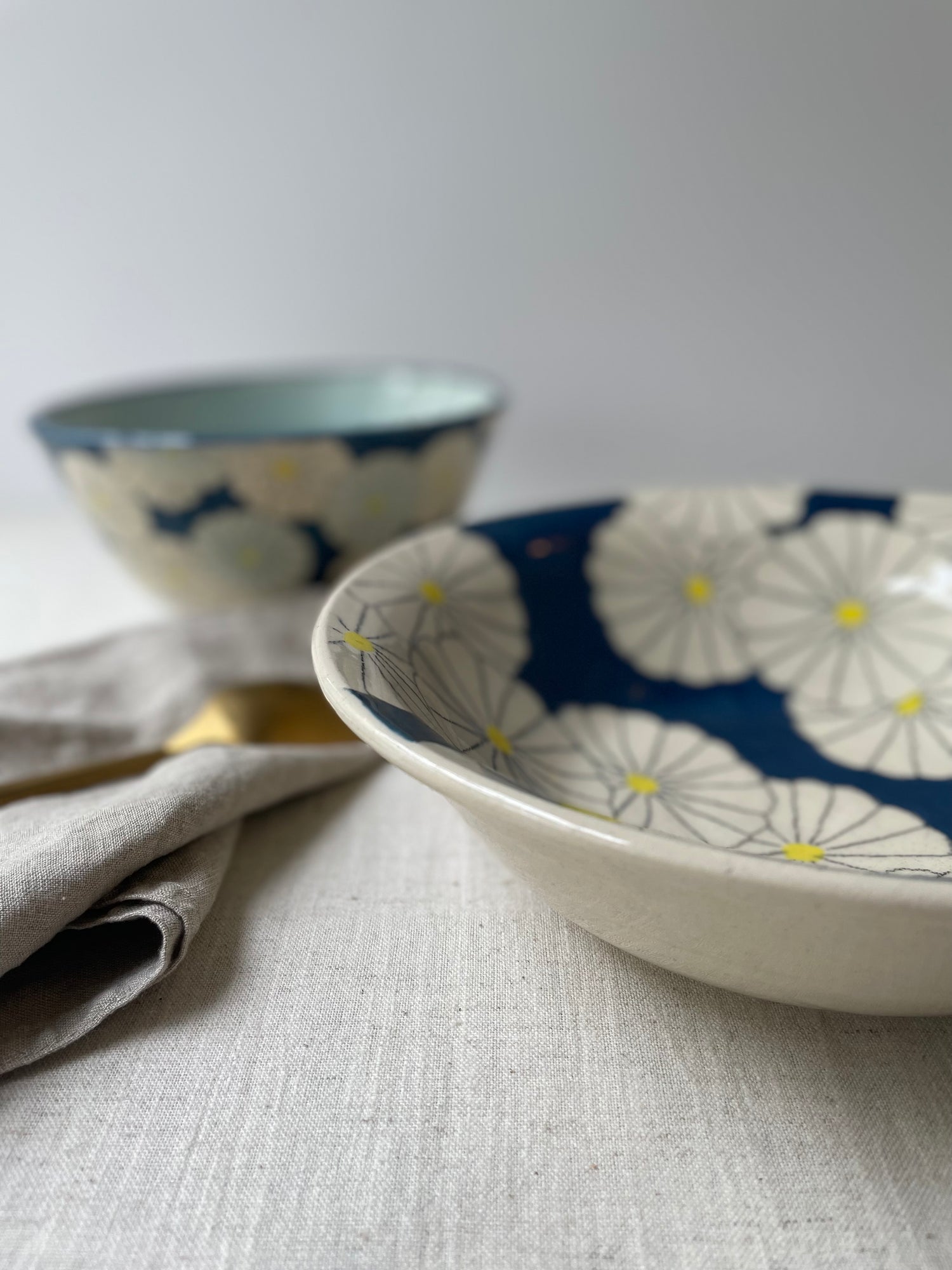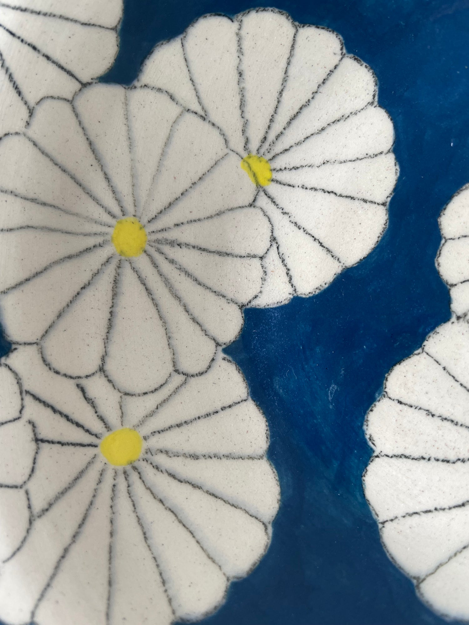 After firing this stoneware bowl in an electric kiln, I drew each flower in a repeating pattern and painted underglazes on the interior. The painted pattern gets set with a second firing in the kiln. Finally, I used a glossy clear glaze for a smooth finish before its final glaze firing.