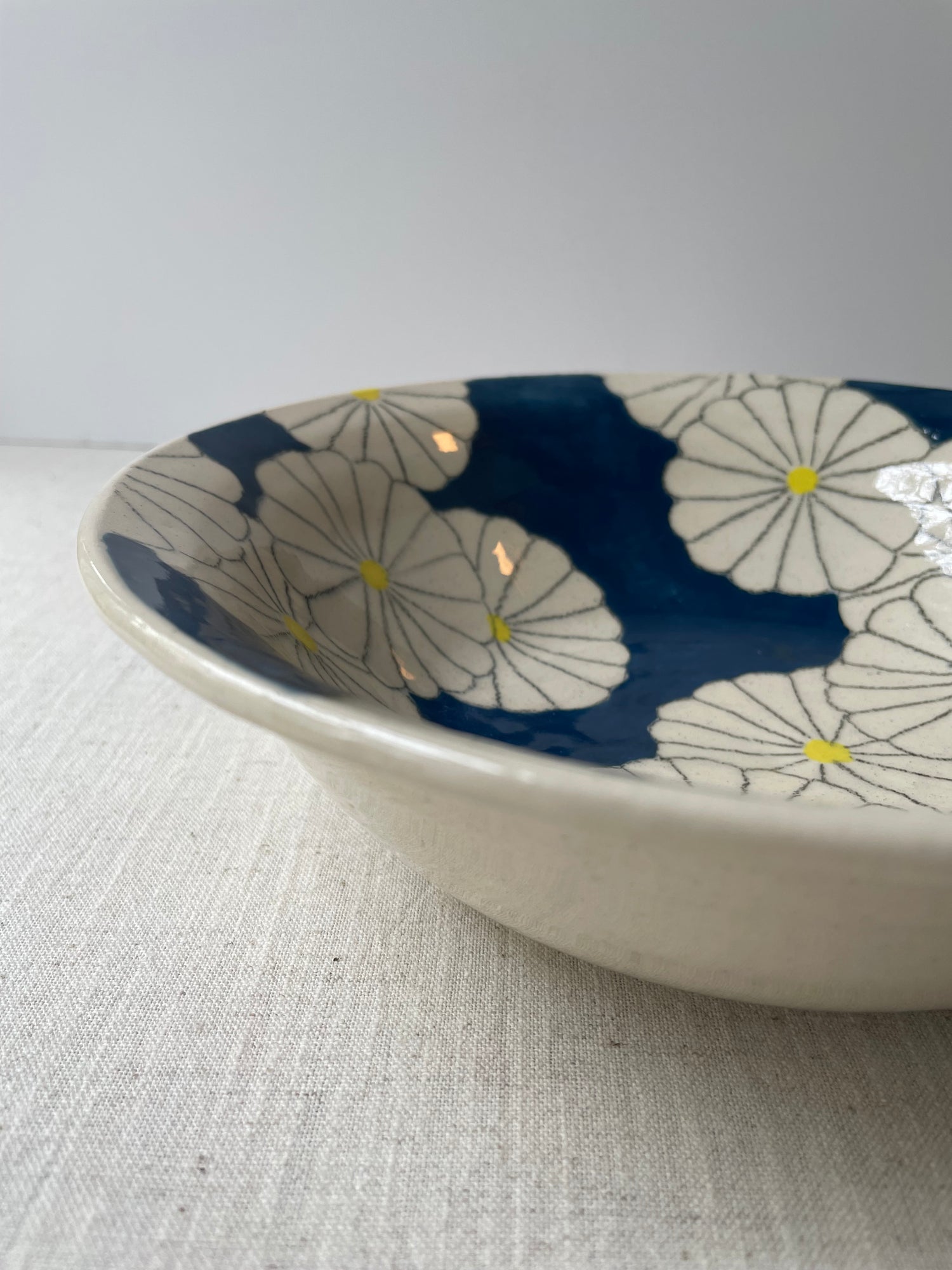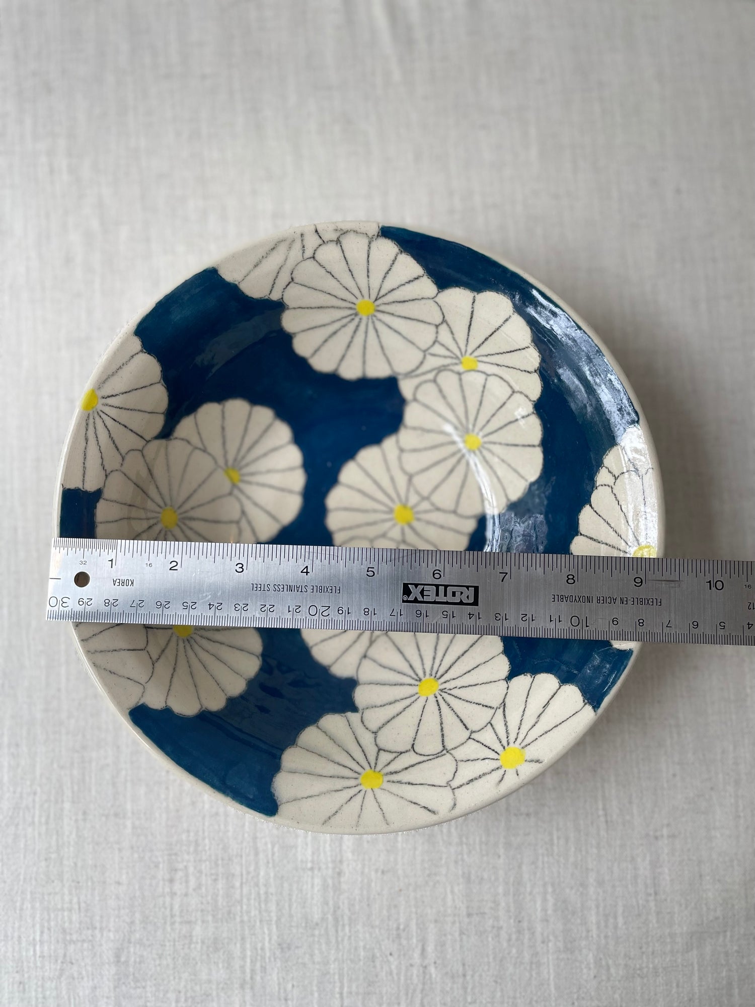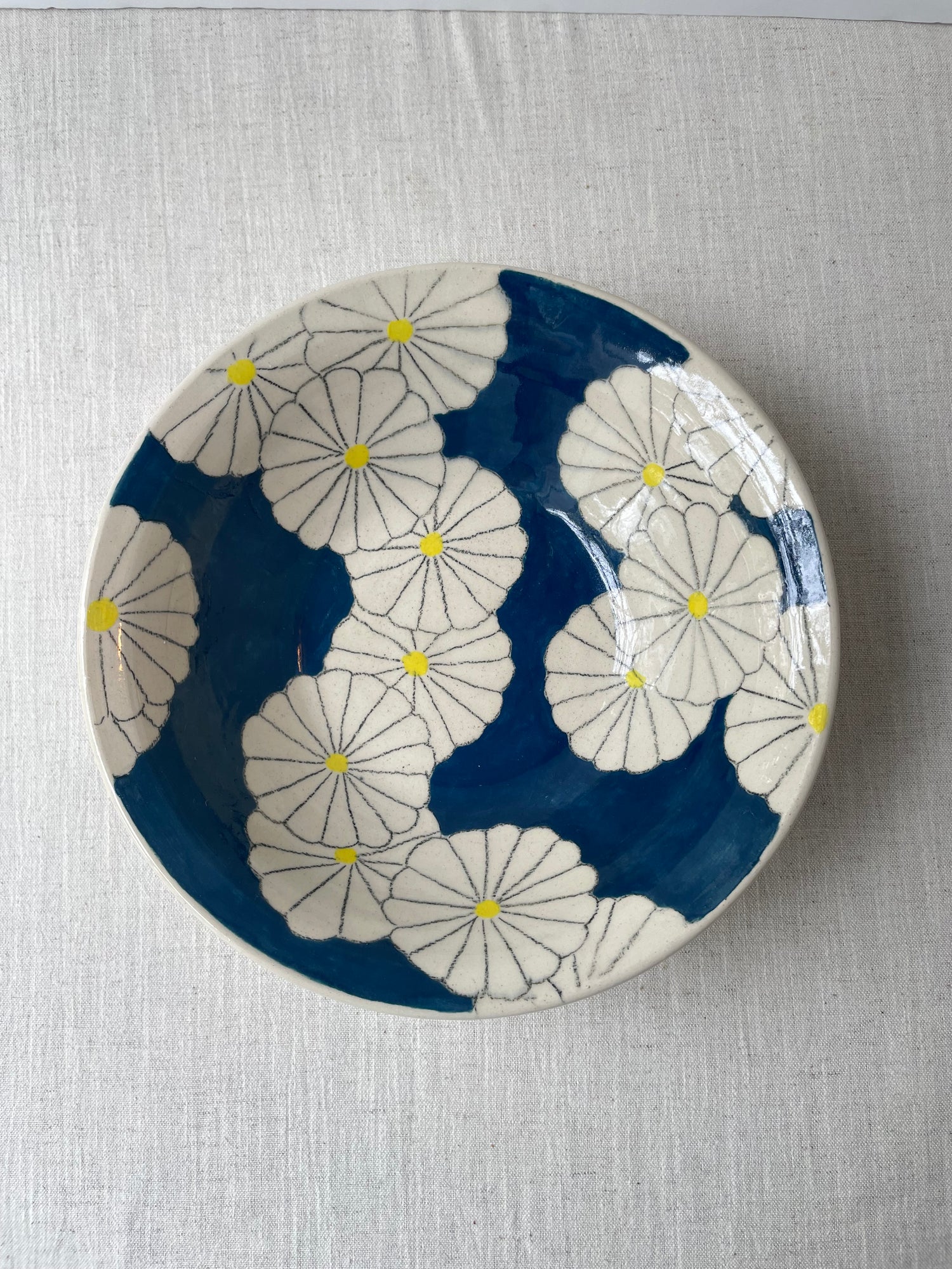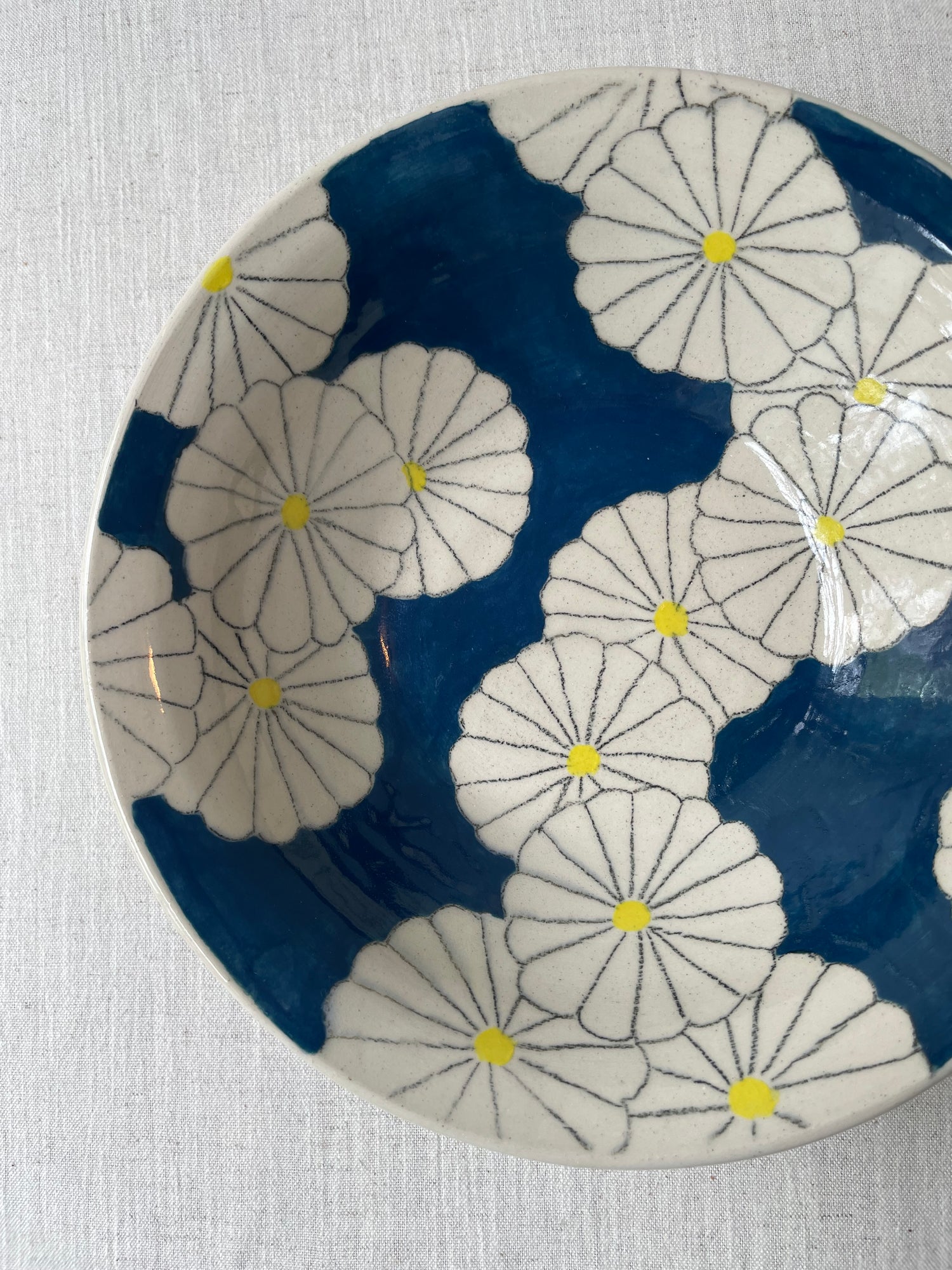 After firing this stoneware bowl in an electric kiln, I drew each flower in a repeating pattern and painted underglazes on the interior. The painted pattern gets set with a second firing in the kiln. Finally, I used a glossy clear glaze for a smooth finish before its final glaze firing.