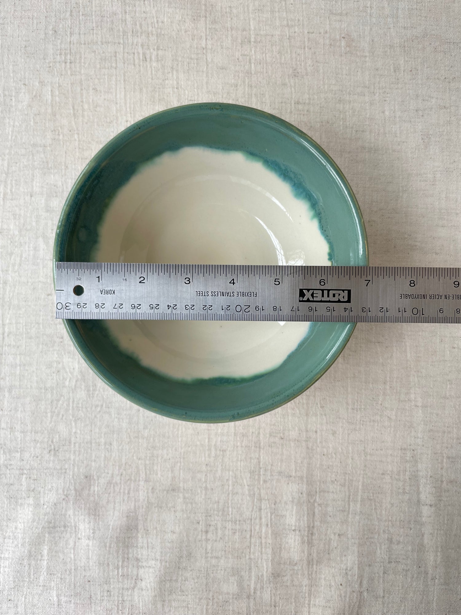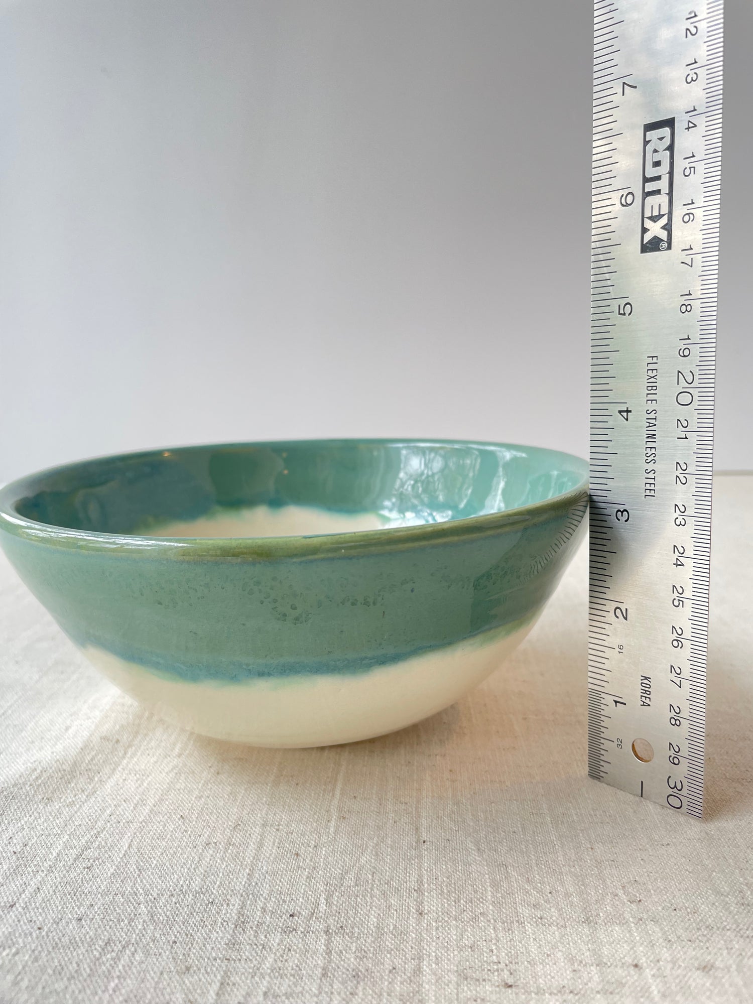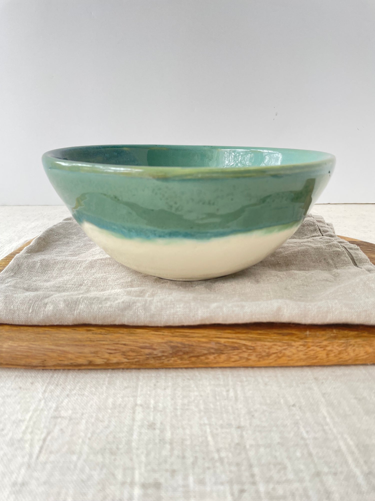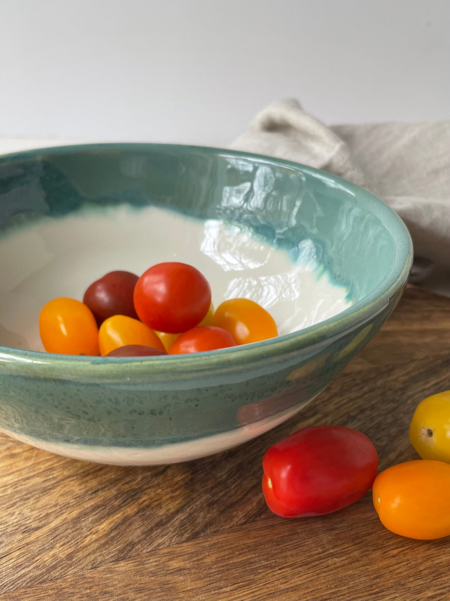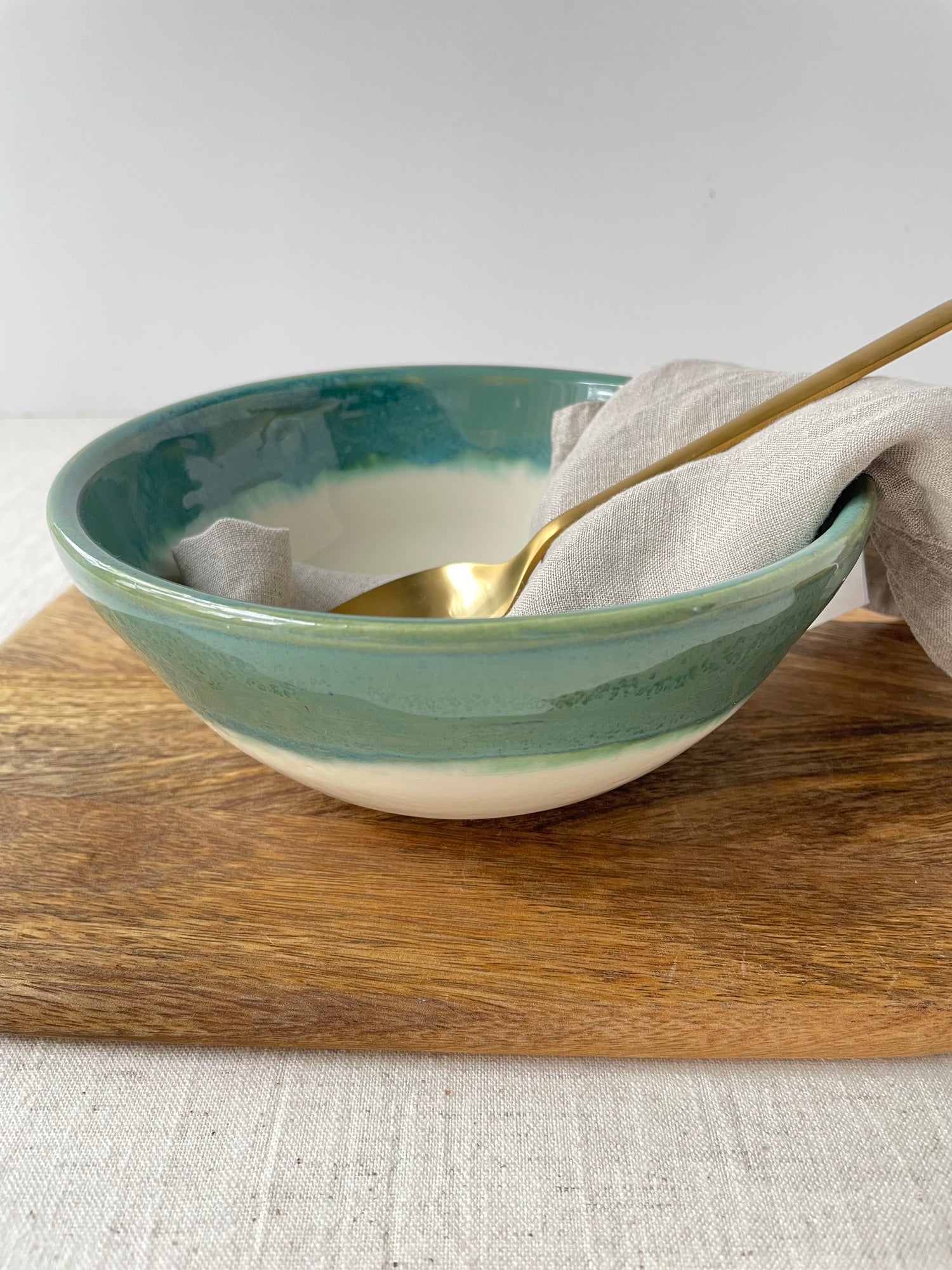 The wheel-thrown bowl is hand painted with a variegated emerald-green and clear glazes that are fired in the kiln for durability.Â