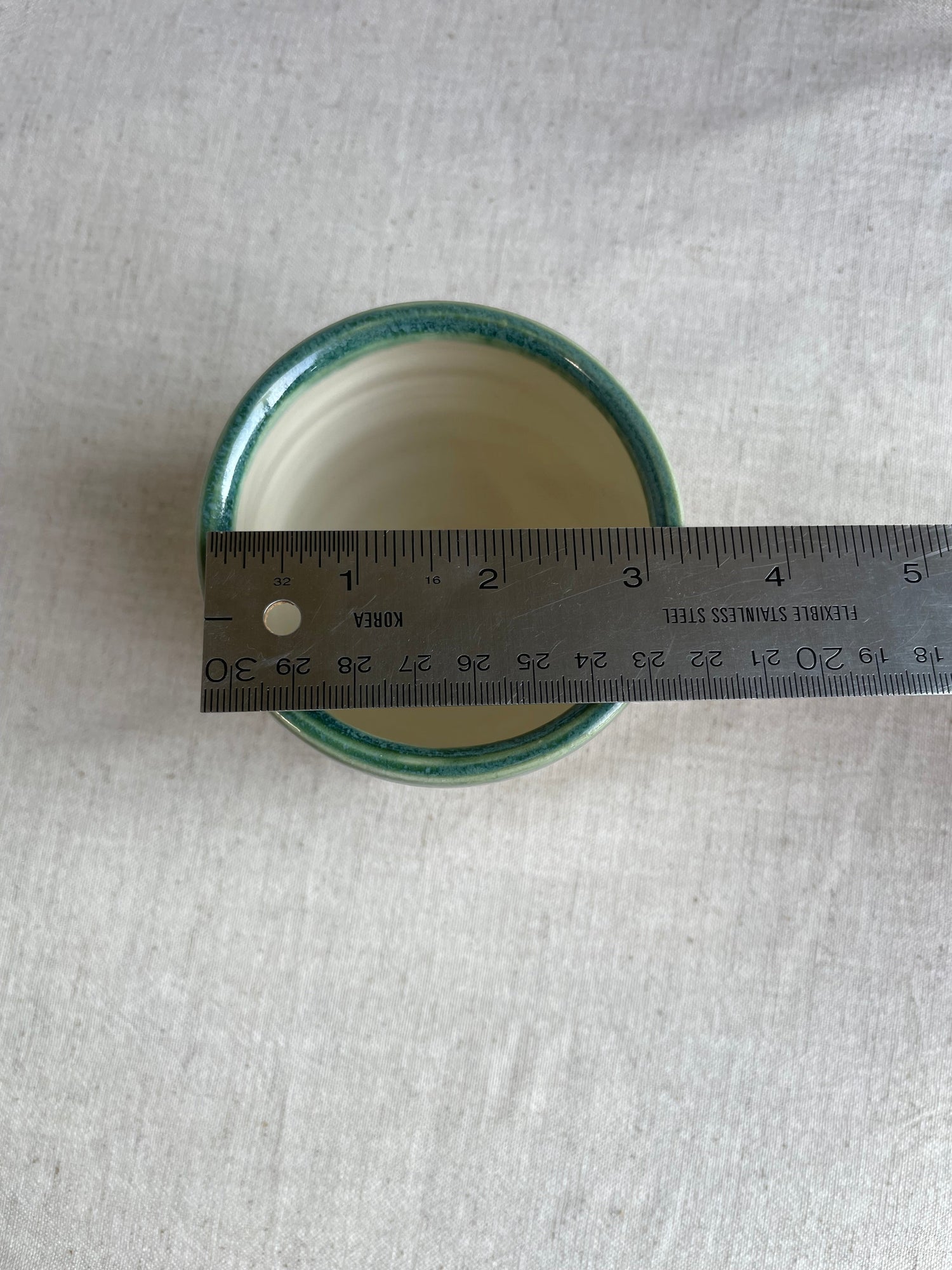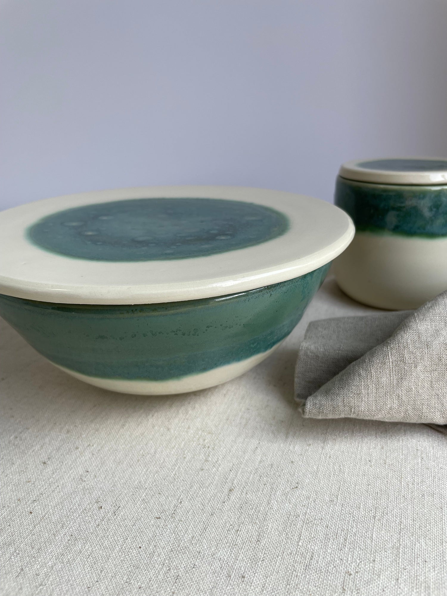 The wheel-thrown bowl set is hand painted with variegated green glazes that range through emerald and sage, that are fired in the kiln for durability.Â