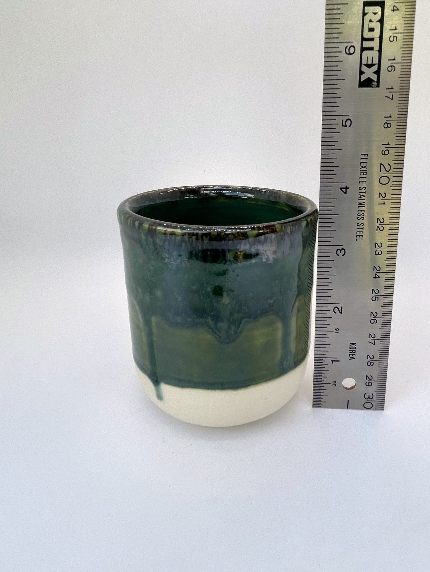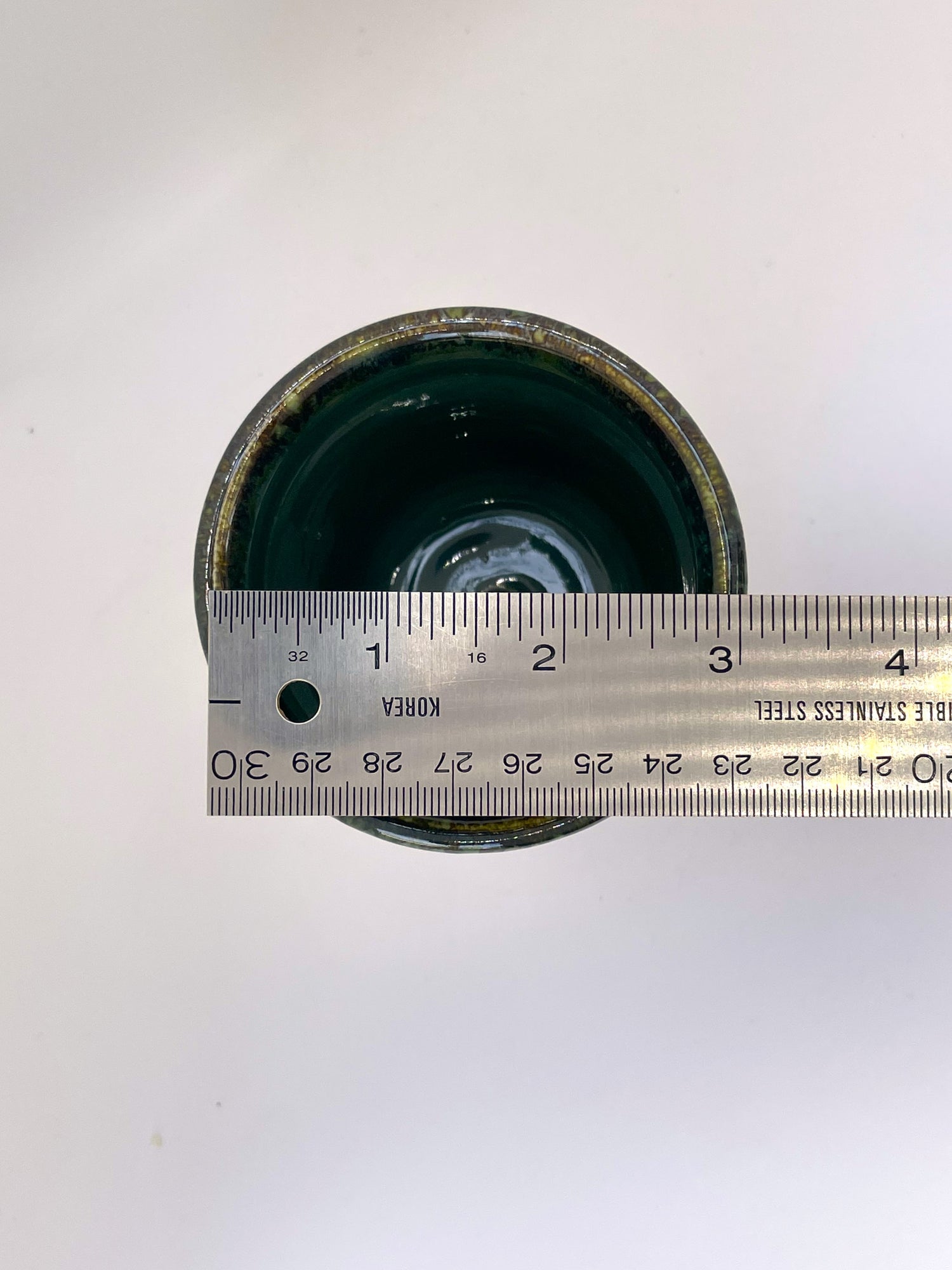 These items are thrown and trimmed on the wheel, after which I cut a drainage hole. After a first firing in an electric kiln, I glazed them with coordinating evergreen and olive glazes to vitrify the surface and add shine. Next, I overlapped a muted bronze-flecked brown on the rim to echo natural plant tones and fired them for the final time.