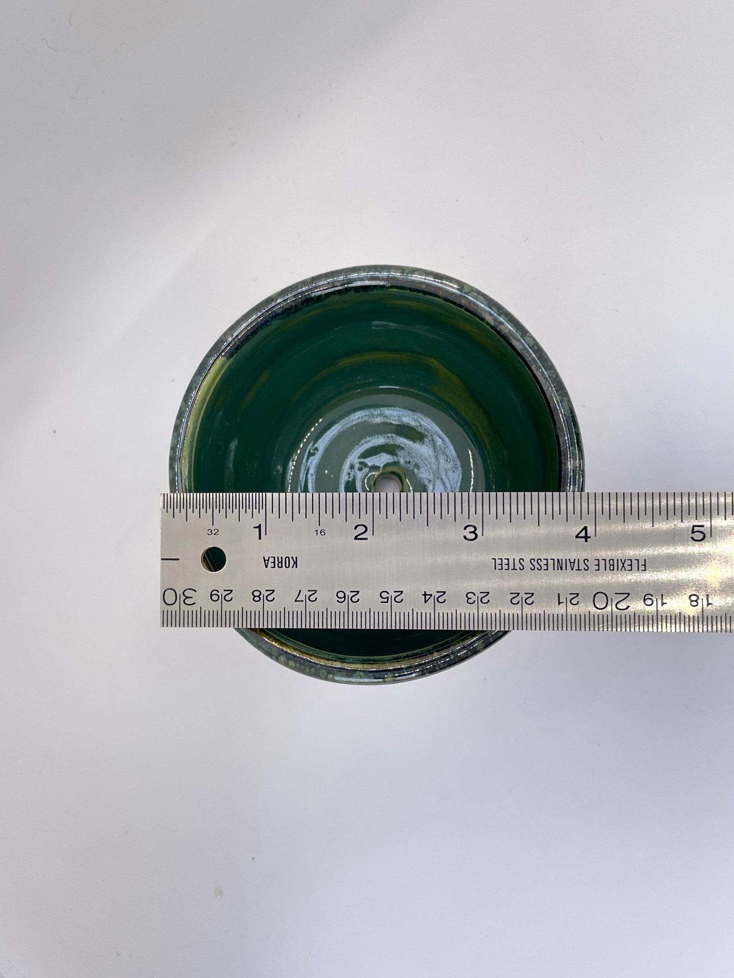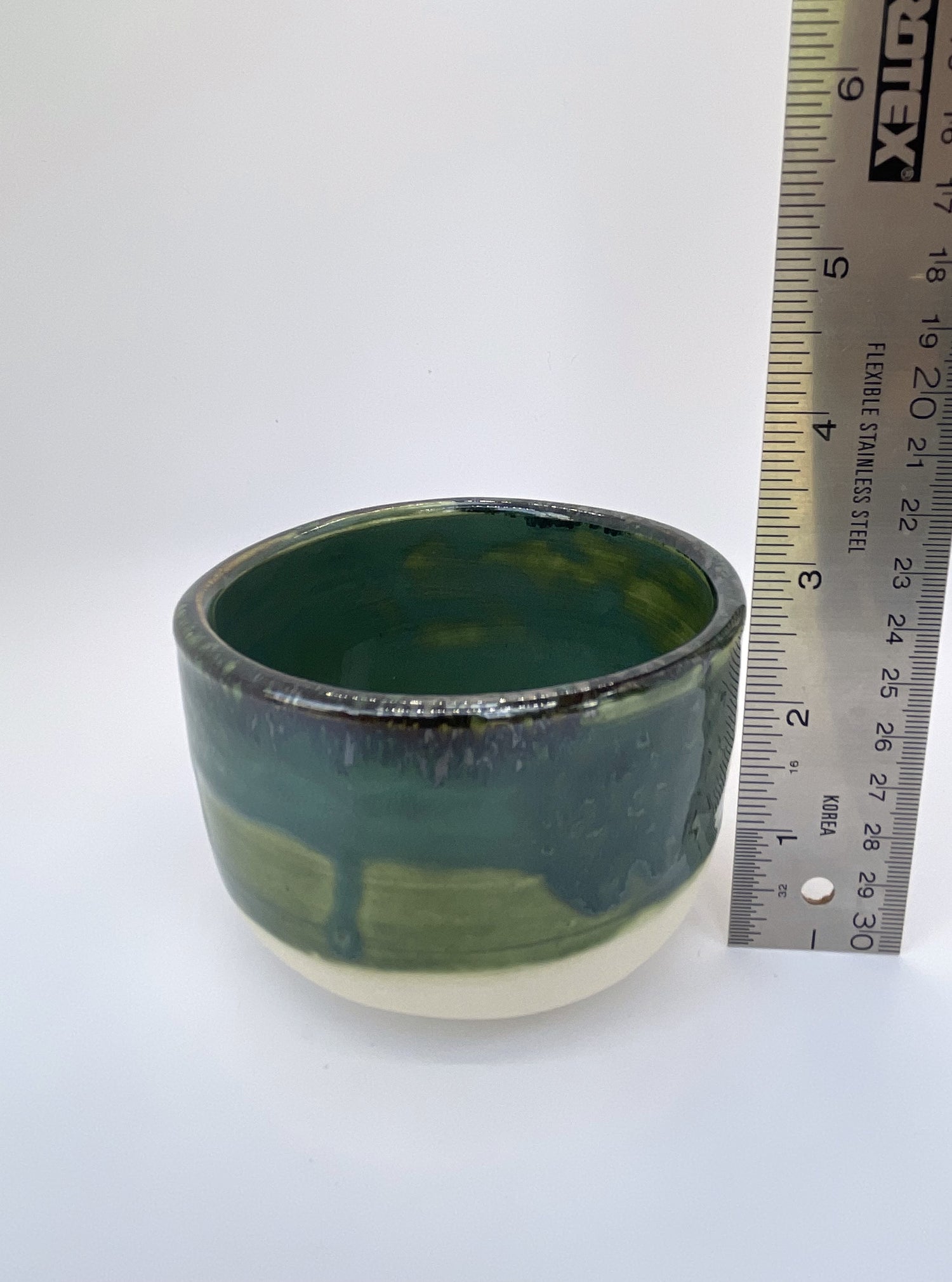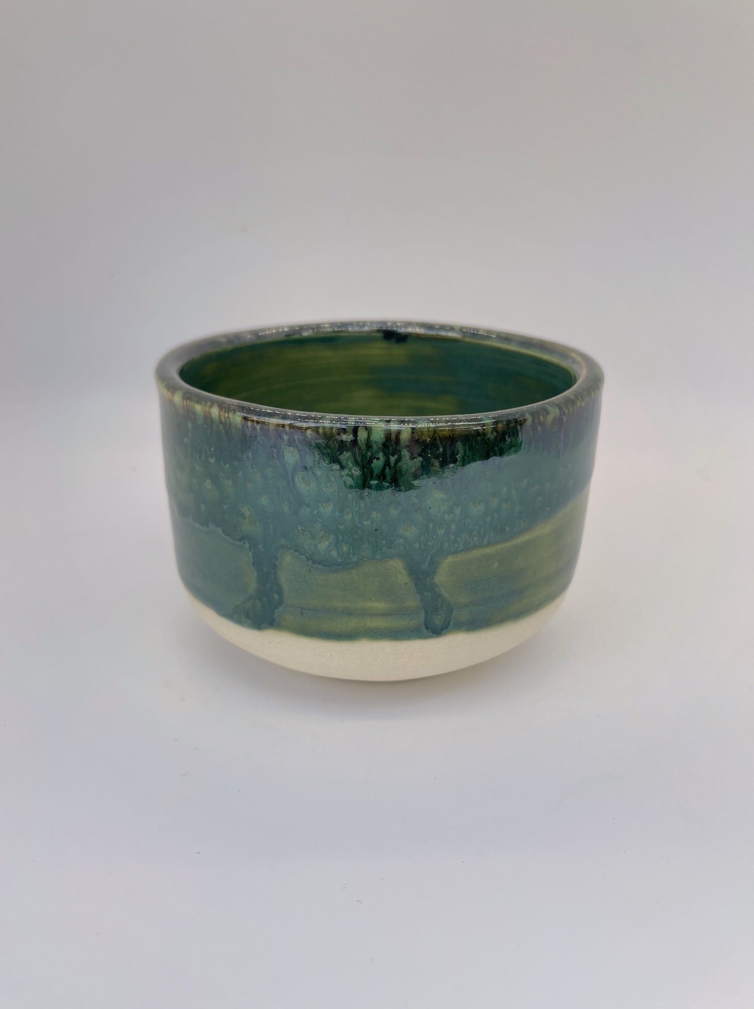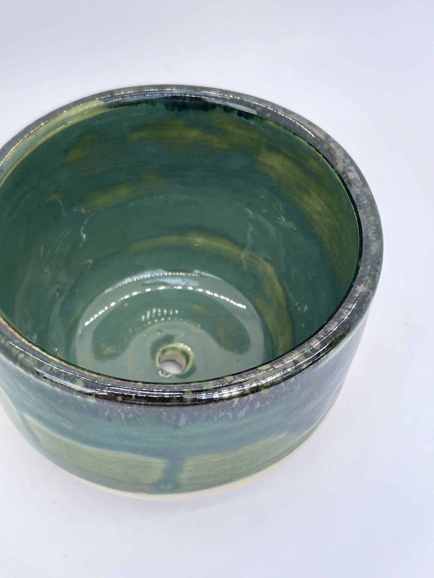 These items are thrown and trimmed on the wheel, after which I cut a drainage hole. After a first firing in an electric kiln, I glazed them with coordinating emerald and olive glazes to vitrify the surface and add shine. Next, I overlapped a muted bronze-flecked brown on the rim to echo natural plant tones and fired them for the final time.