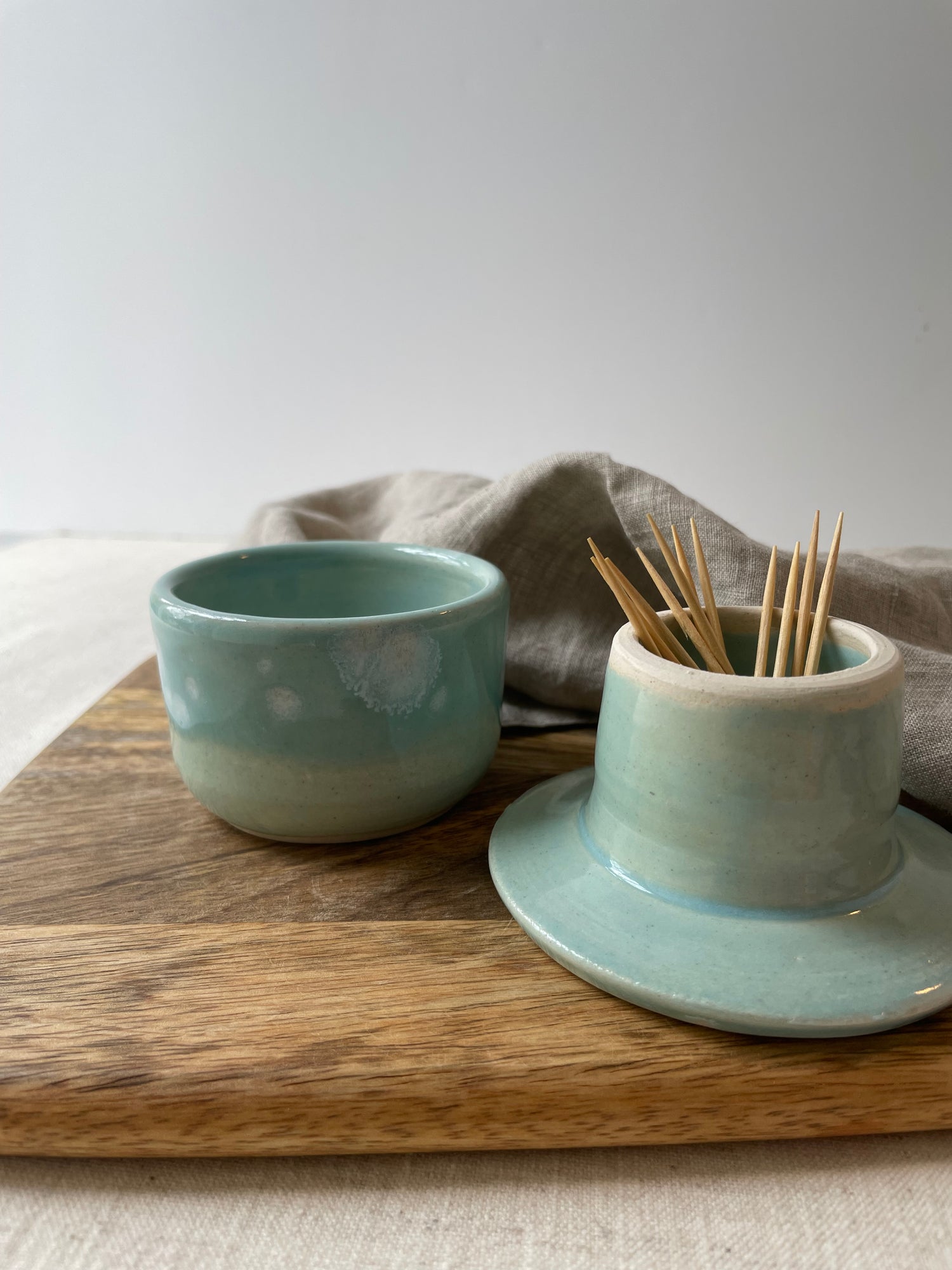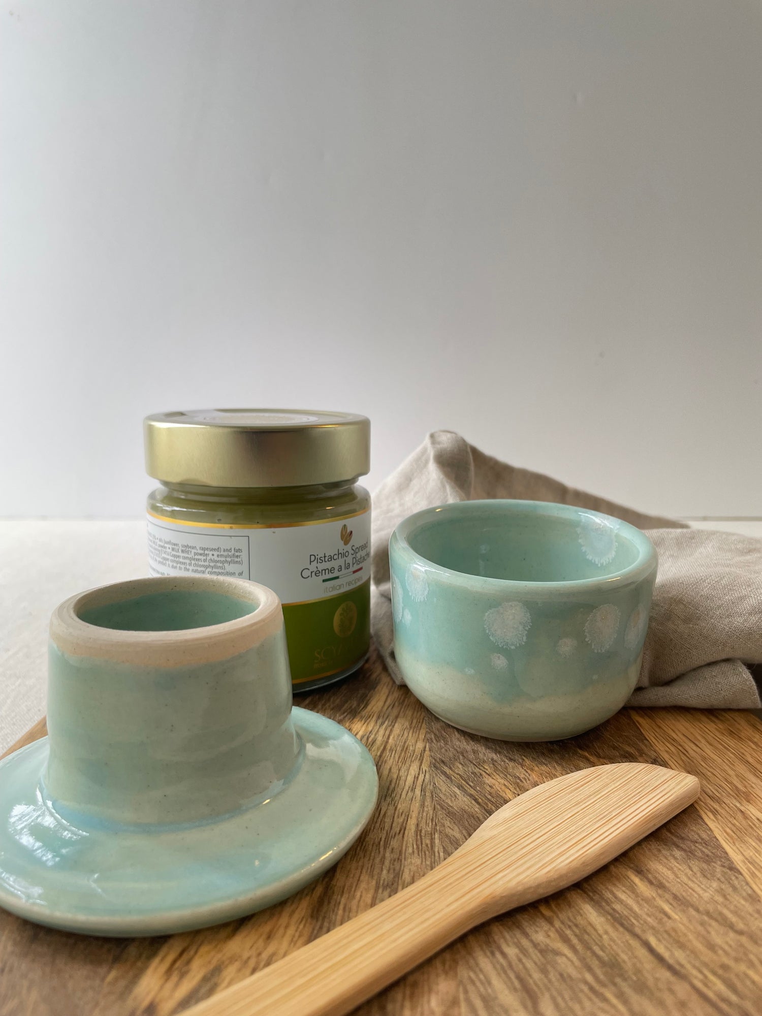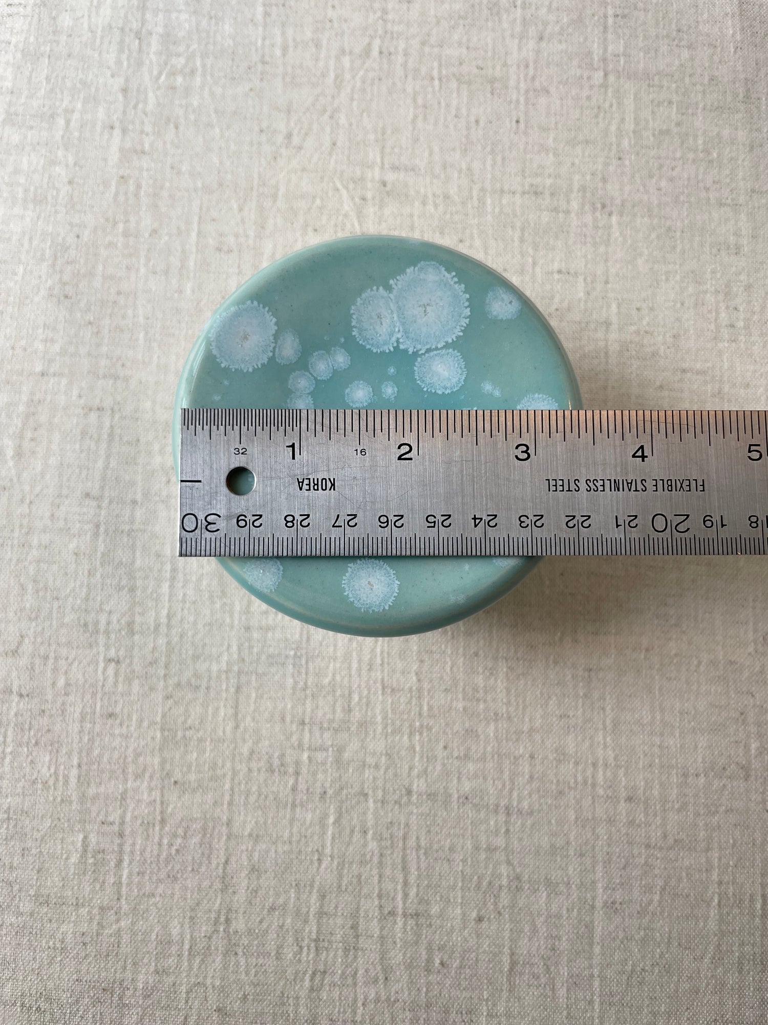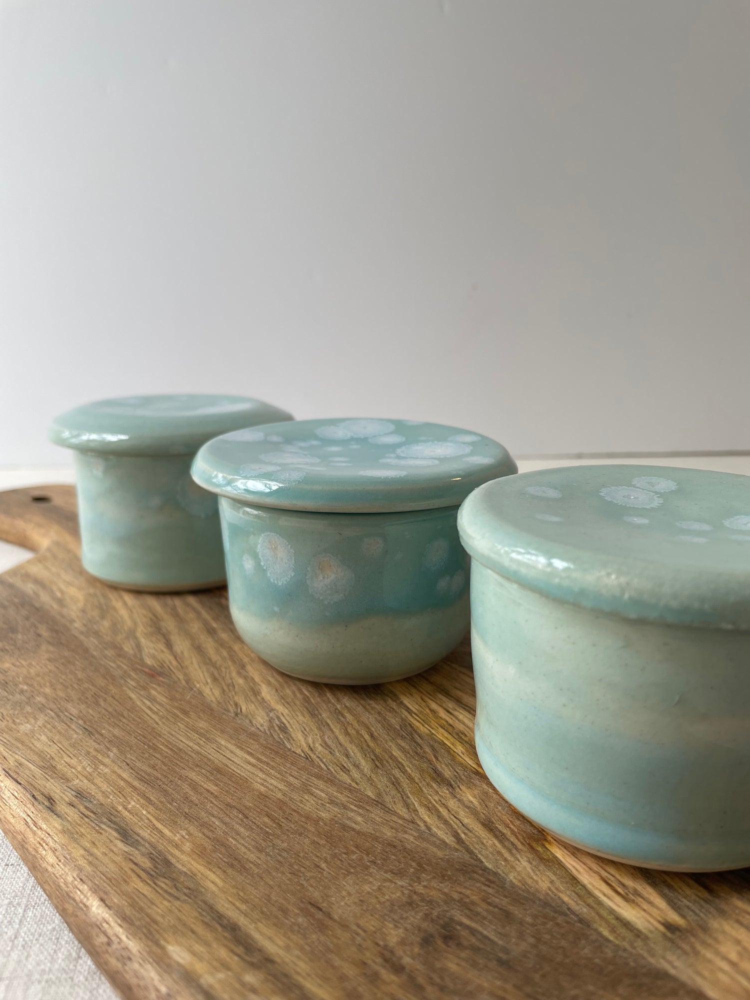 This butter keeper is thrown on the wheel in two parts, with careful measuring to ensure the lid fits into the base. The translucent turquoise glaze is highlighted with crystal bursts.Â