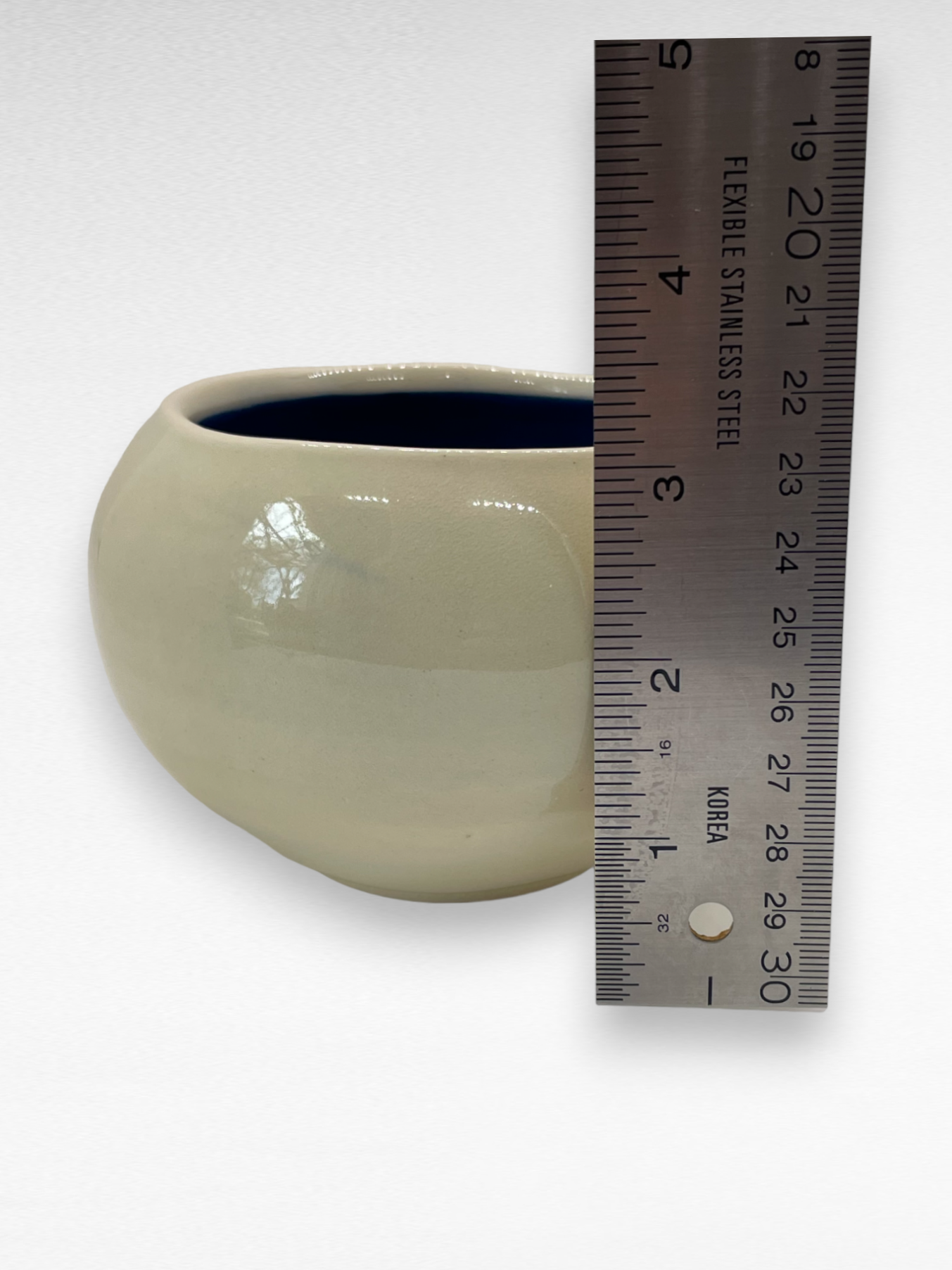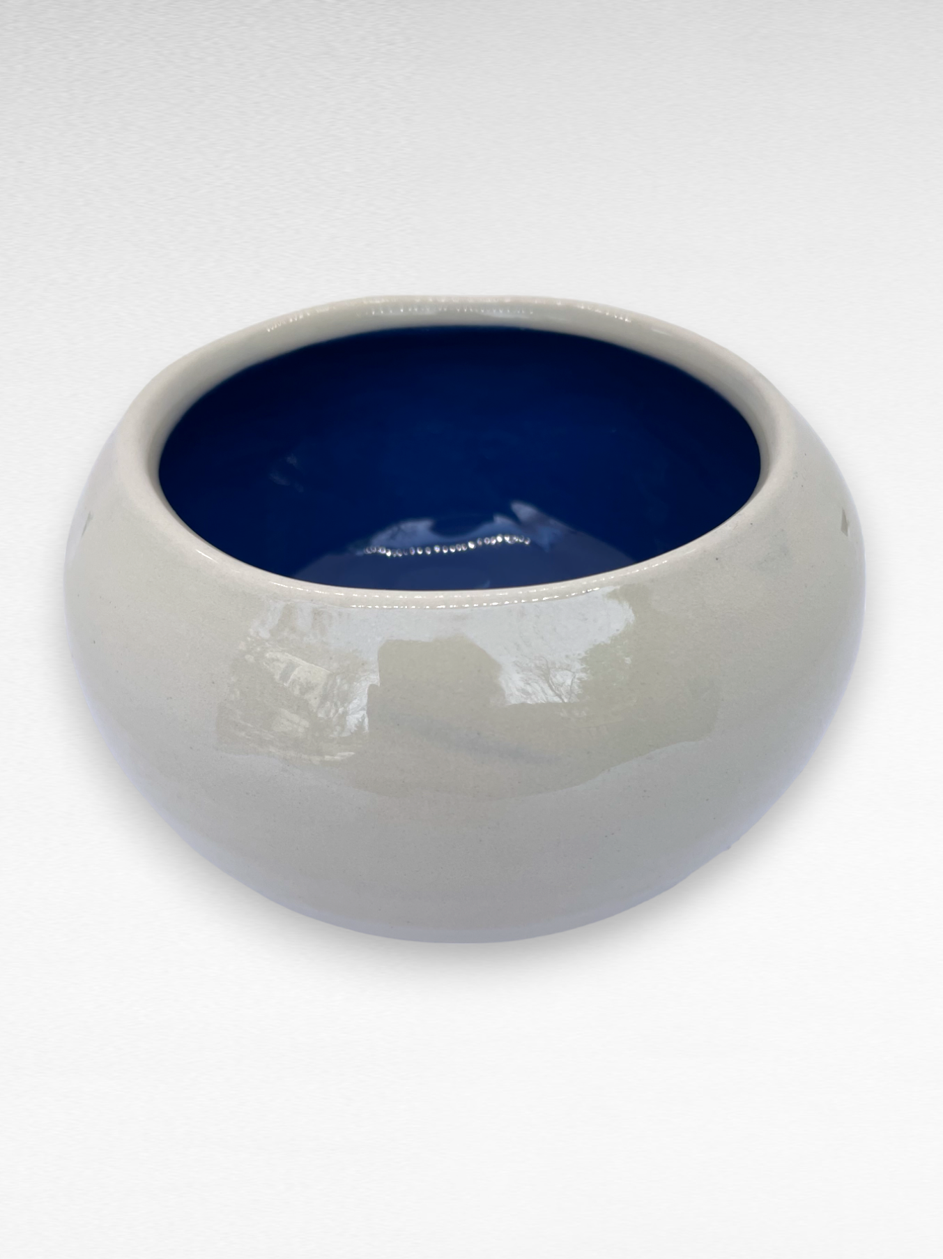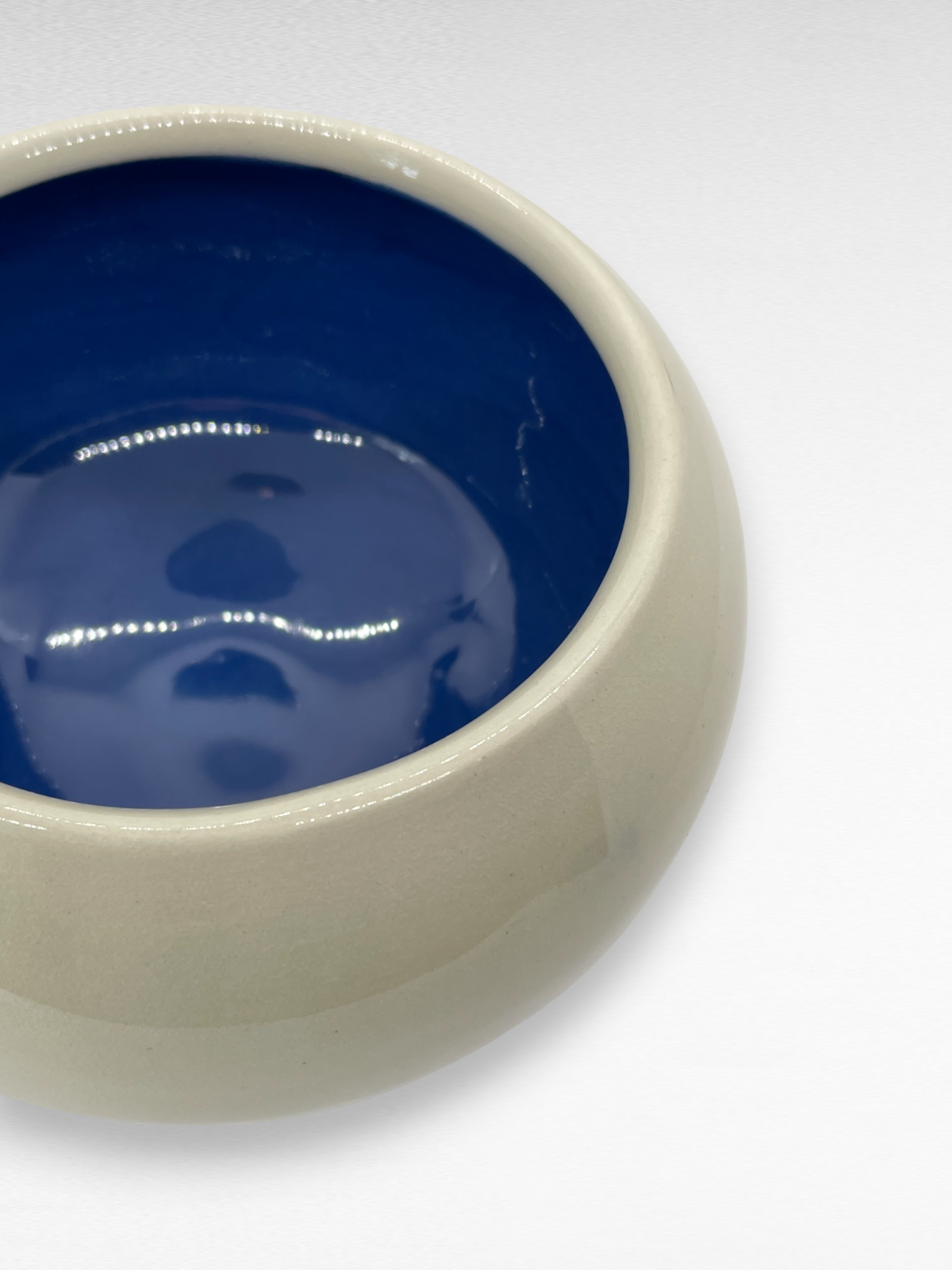 After throwing this globe-shaped bowl on the wheel, I painted several layers of slip (liquid clay) hand-tinted a custom cobalt shade. Once dried and fired in the kiln, I dipped the bowl in a clear glaze for a shiny durable finish.Â