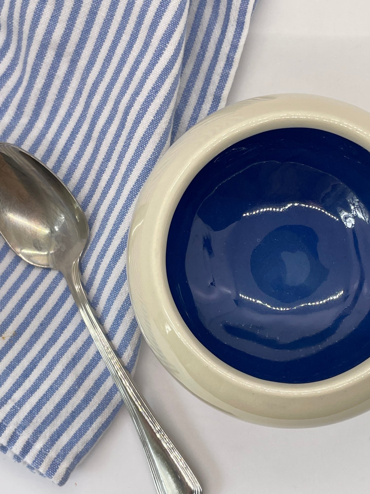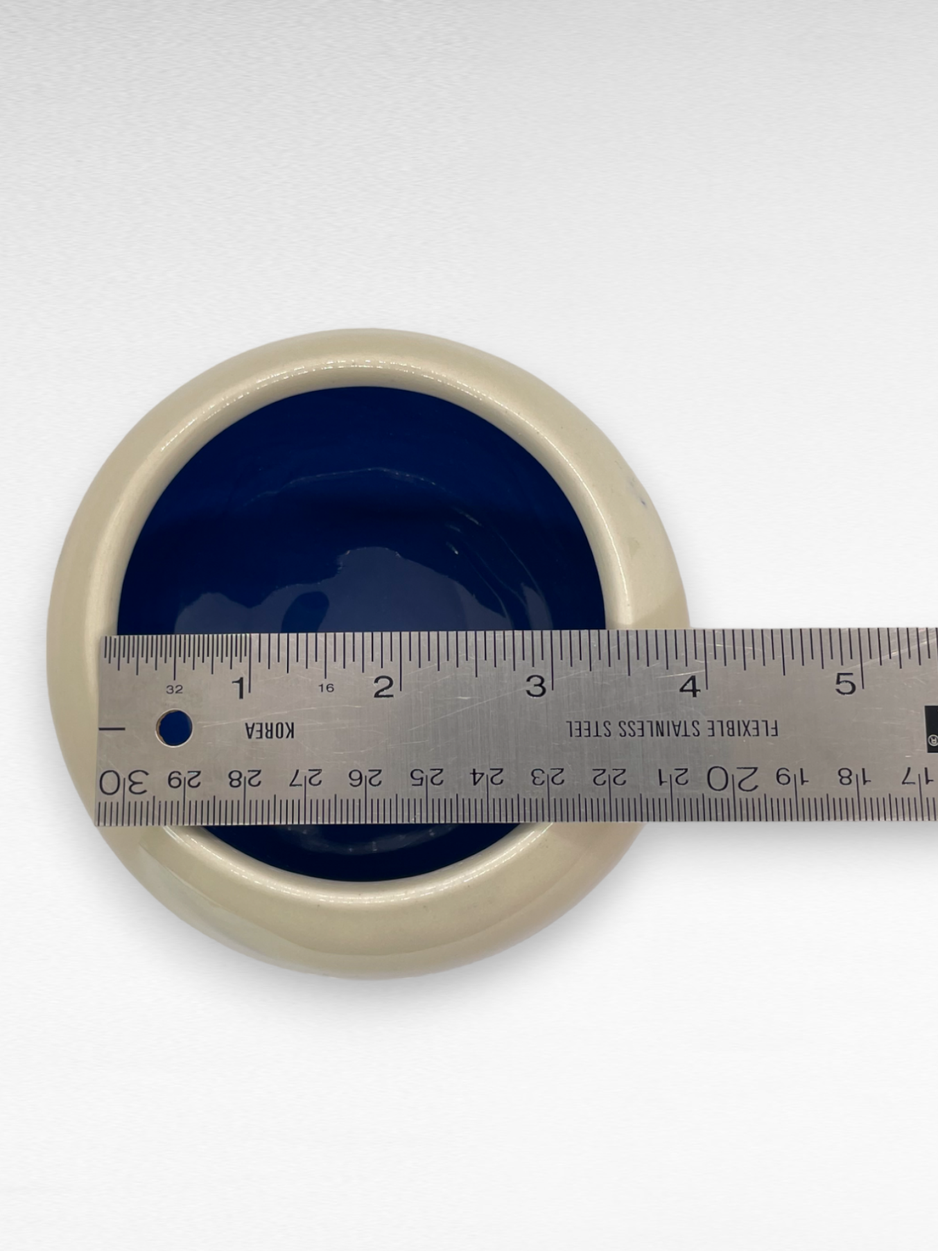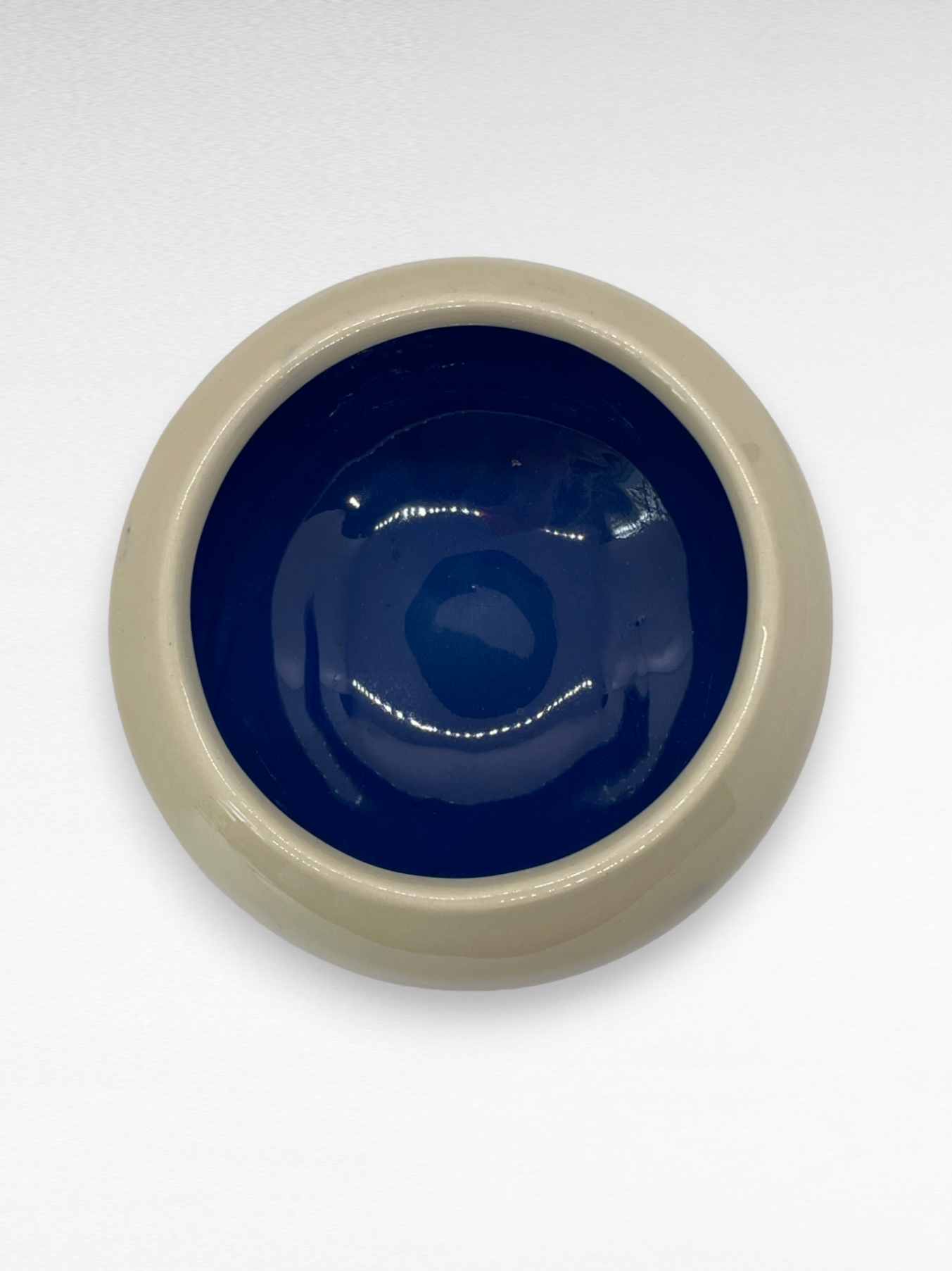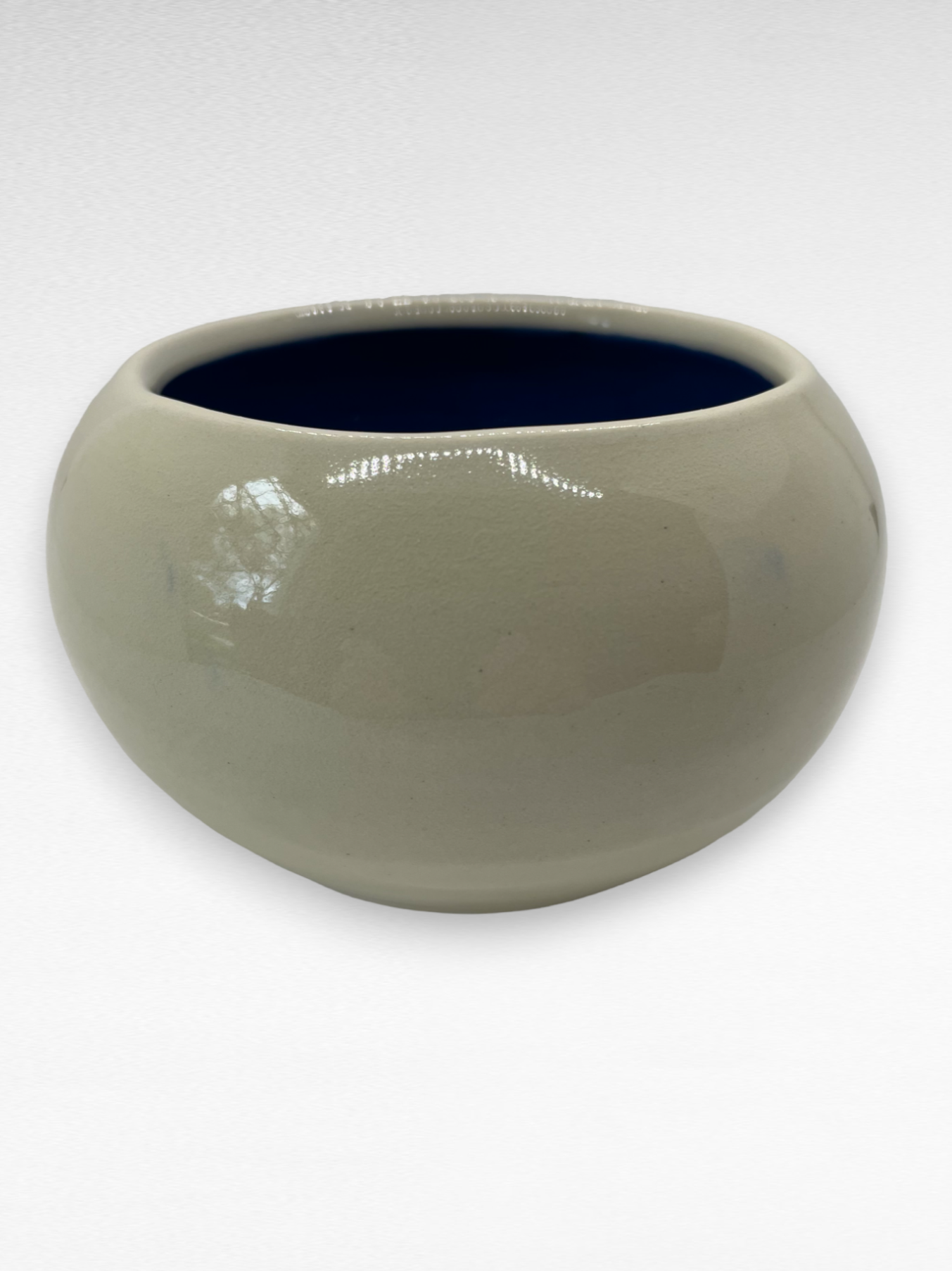 After throwing this globe-shaped bowl on the wheel, I painted several layers of slip (liquid clay) hand-tinted a custom cobalt shade. Once dried and fired in the kiln, I dipped the bowl in a clear glaze for a shiny durable finish.Â