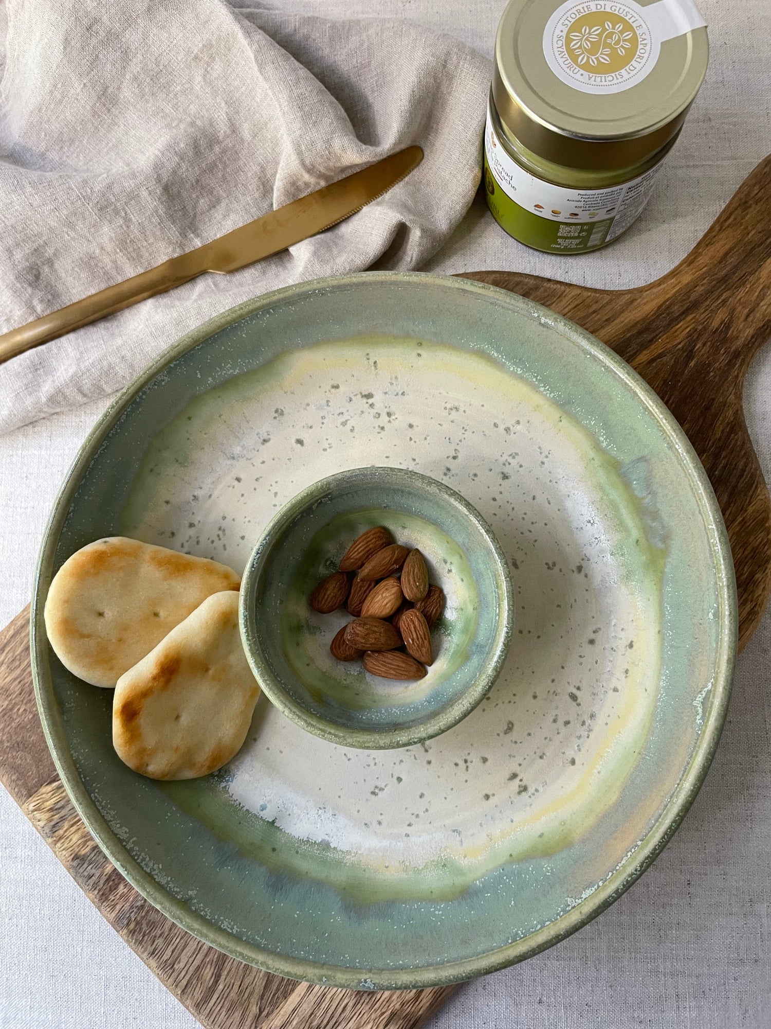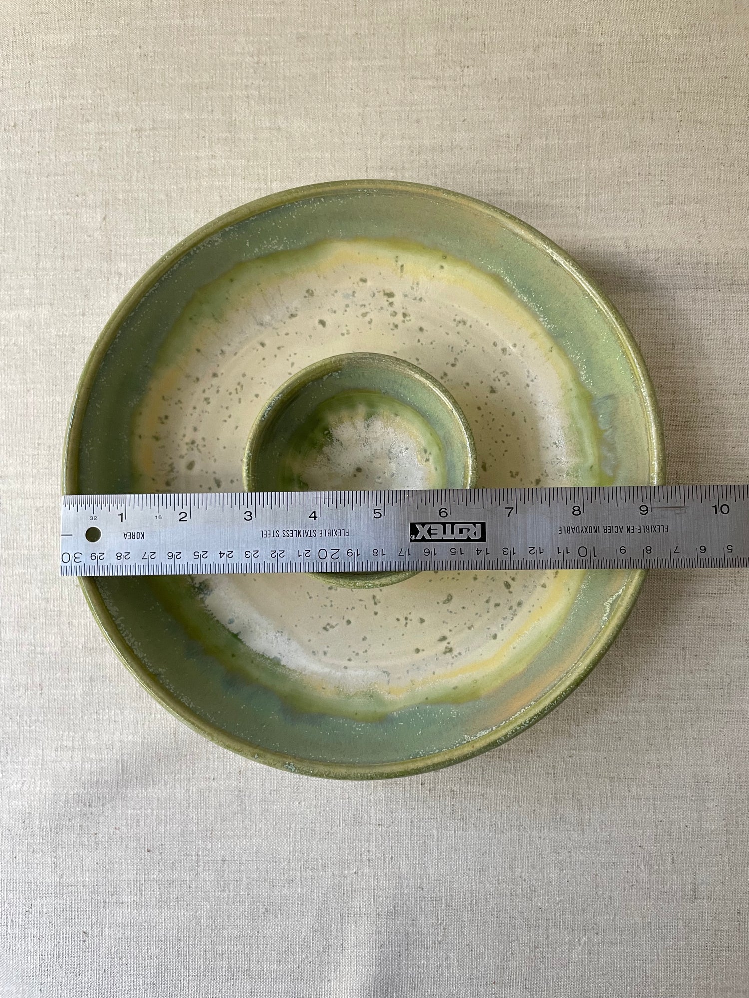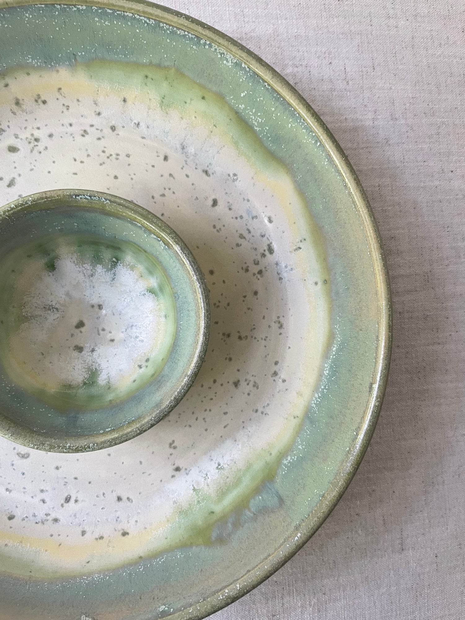 Stoneware clay gives this bowl its strength and durability. After throwing this item as one piece on the wheel, I used a creamy green speckled glaze as a base and applied an iridescent green on the rims.