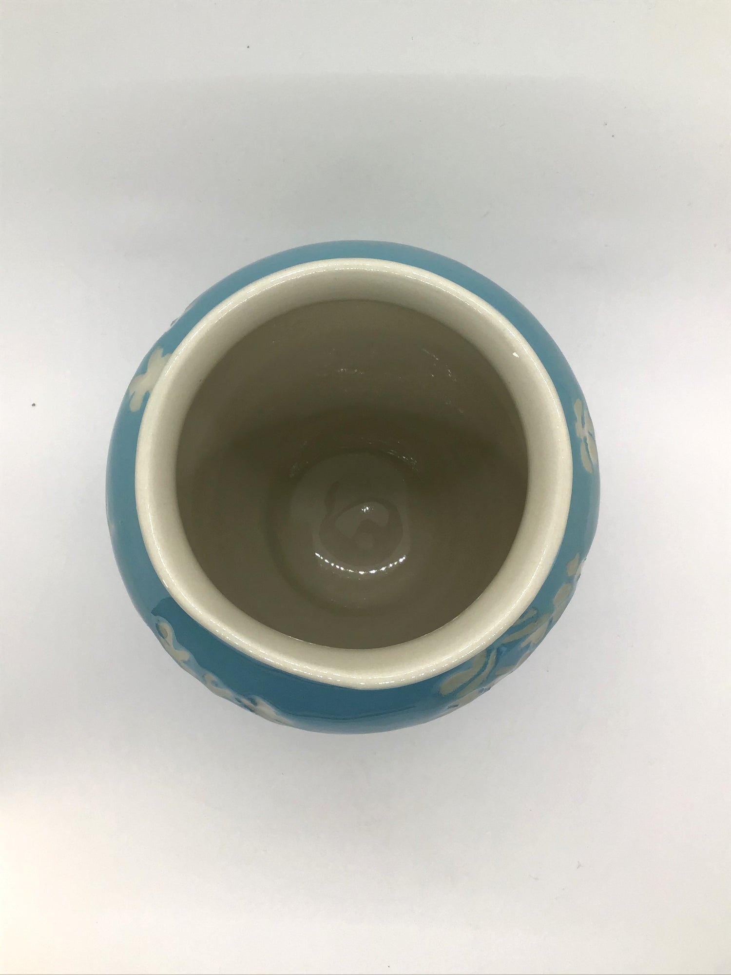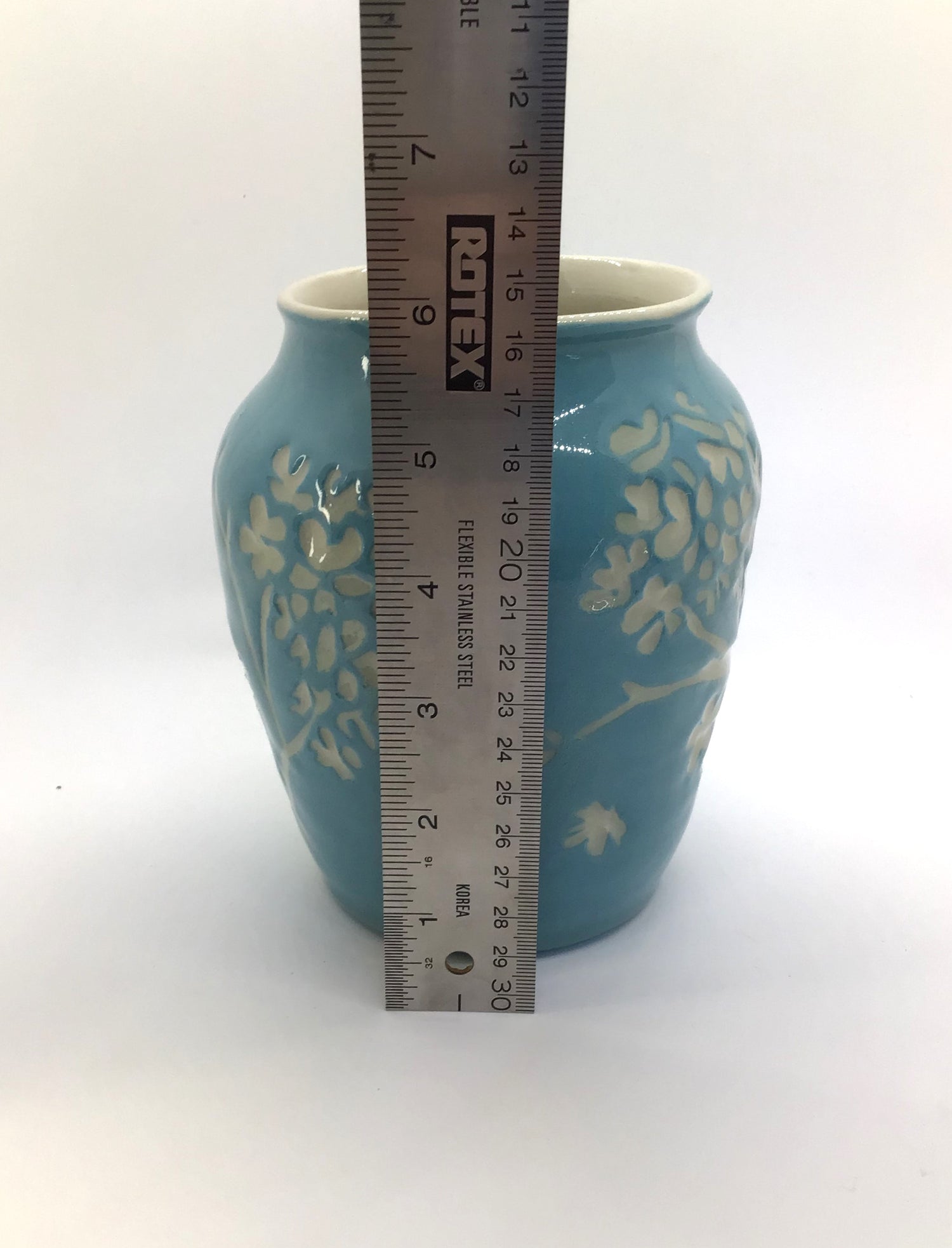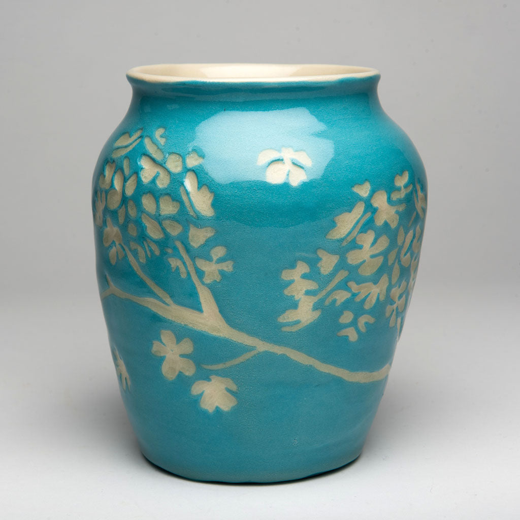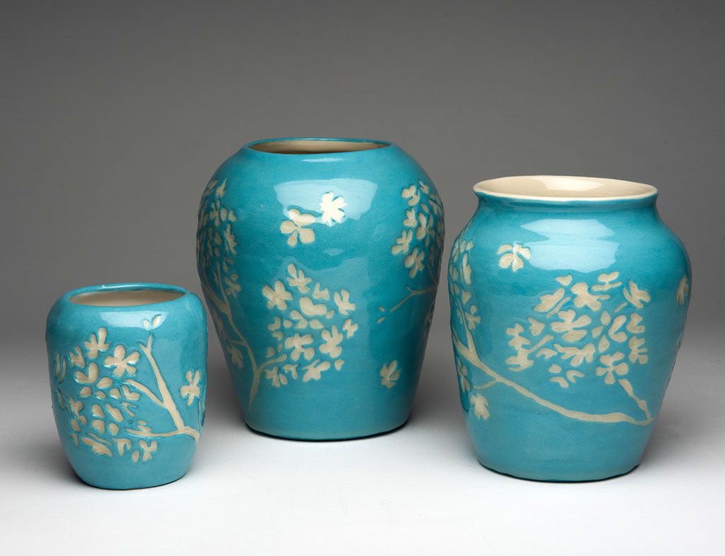This striking large decorative vase makes an elegant and functional accent piece that adds a modern natural touch to home decor. For this handmade ceramic vase, I threw the form on the wheel and hand-painted the surface with several coats of slip (liquid clay) in a custom-tinted sky-blue shade. I then carved hydrangea blossoms using a technique known as sgraffito. The handcrafted textured blue vase has a shiny clear glaze for durability and gloss.