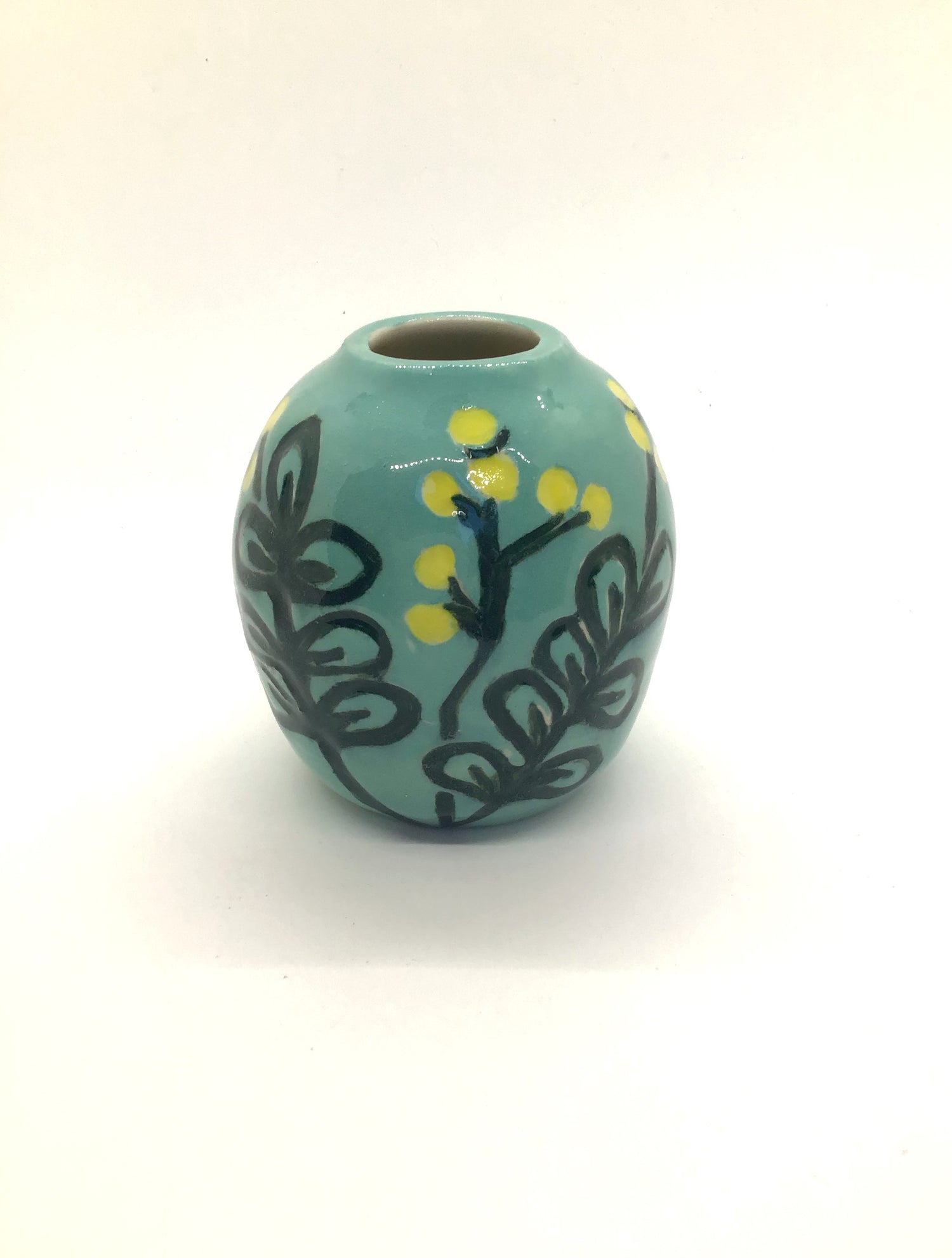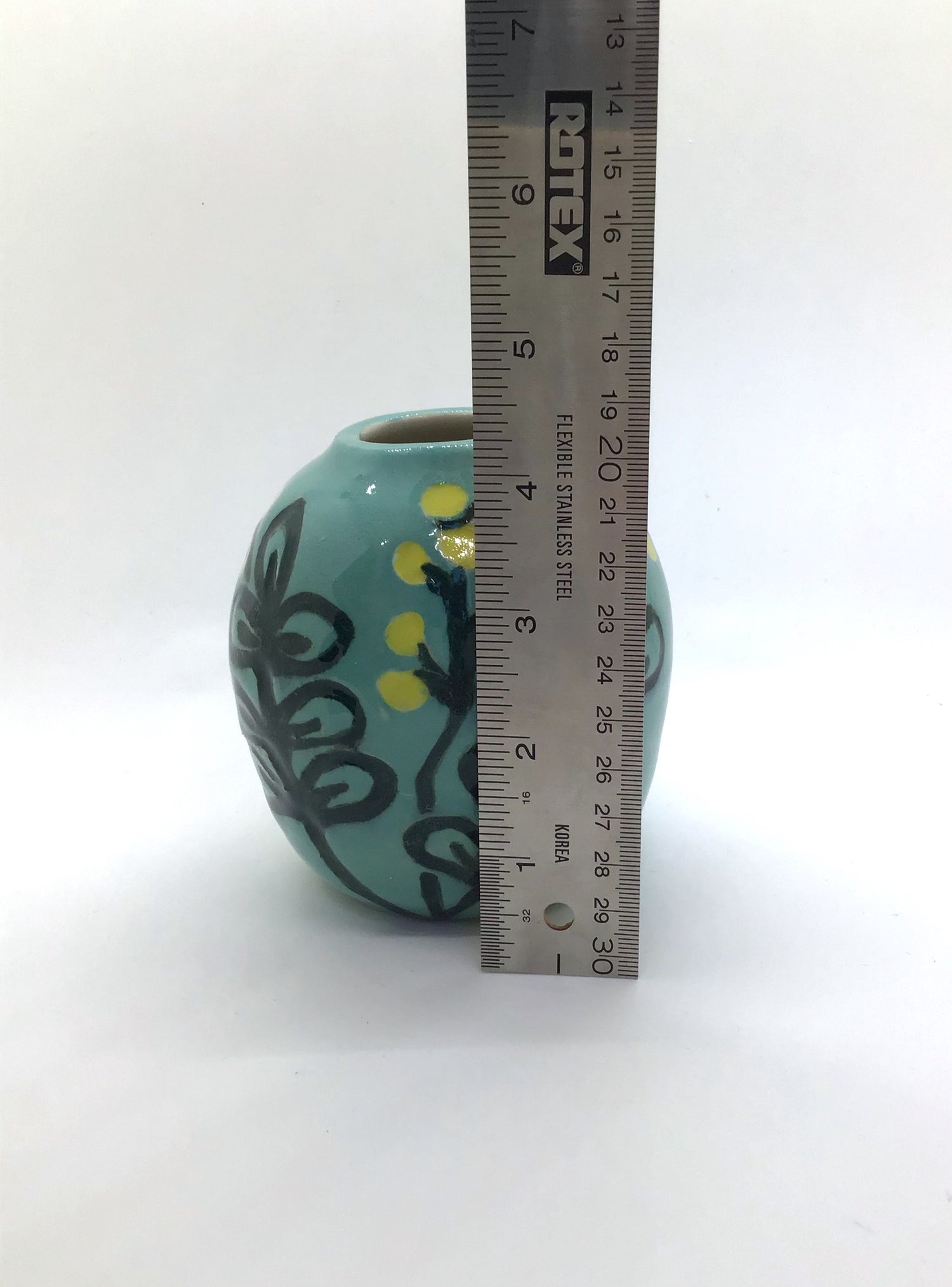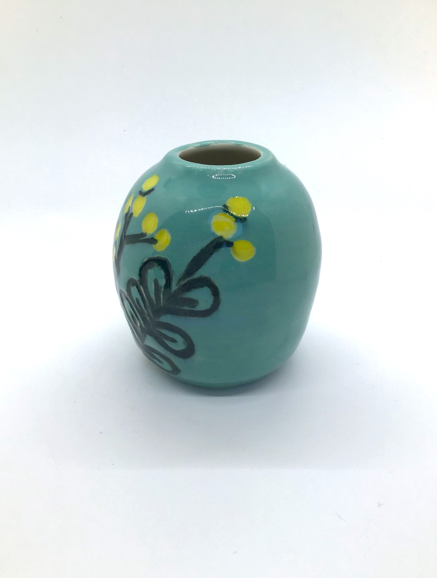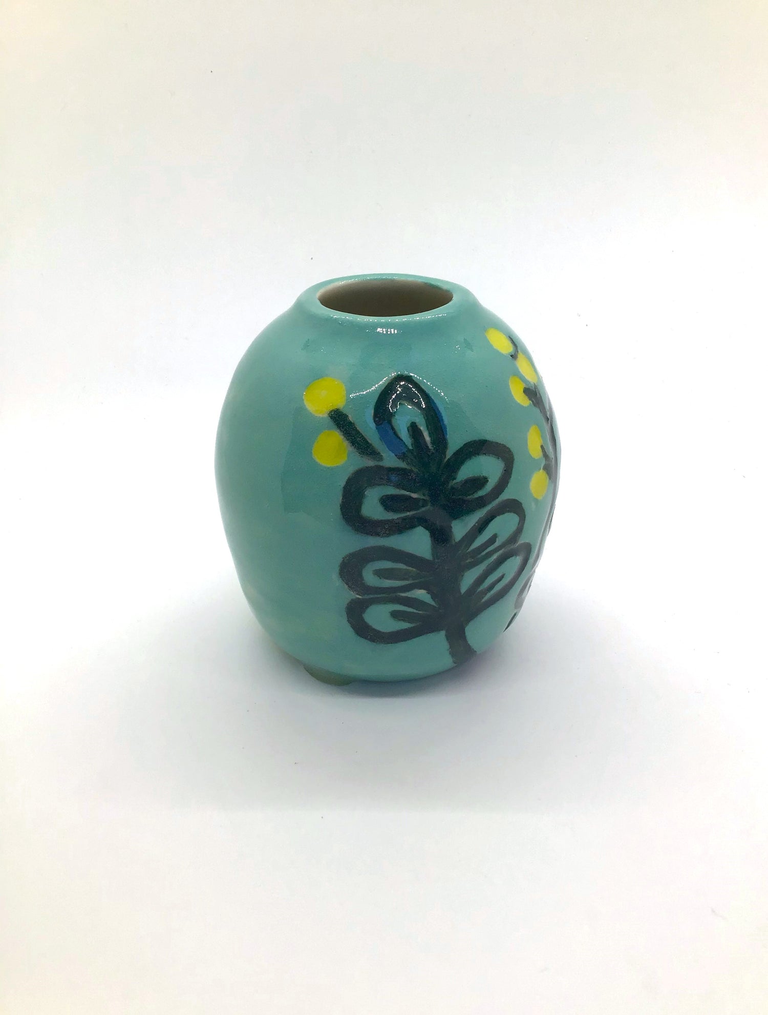 This blue ceramic bud vase makes a charming and functional accent piece that adds a modern whimsical touch to home decor. For this handmade ceramic vase, I threw the form on the wheel and hand-painted the surface with several coats of slip (liquid clay) in a custom-tinted sky-blue shade. I then carved it using a technique known as sgraffito and painted the buds and leaves with underglaze. The handcrafted textured colourful vase has a shiny clear glaze for durability and gloss.