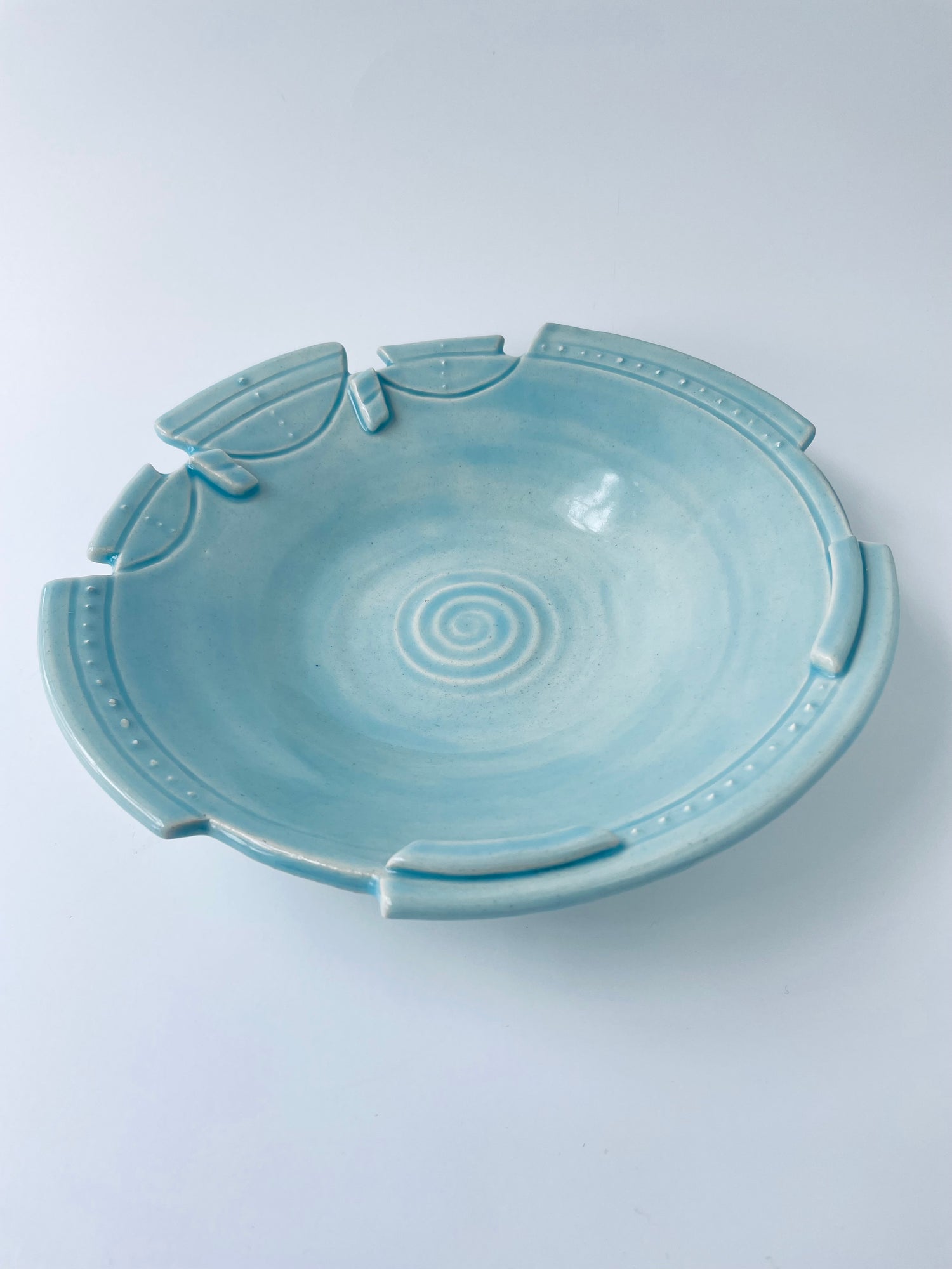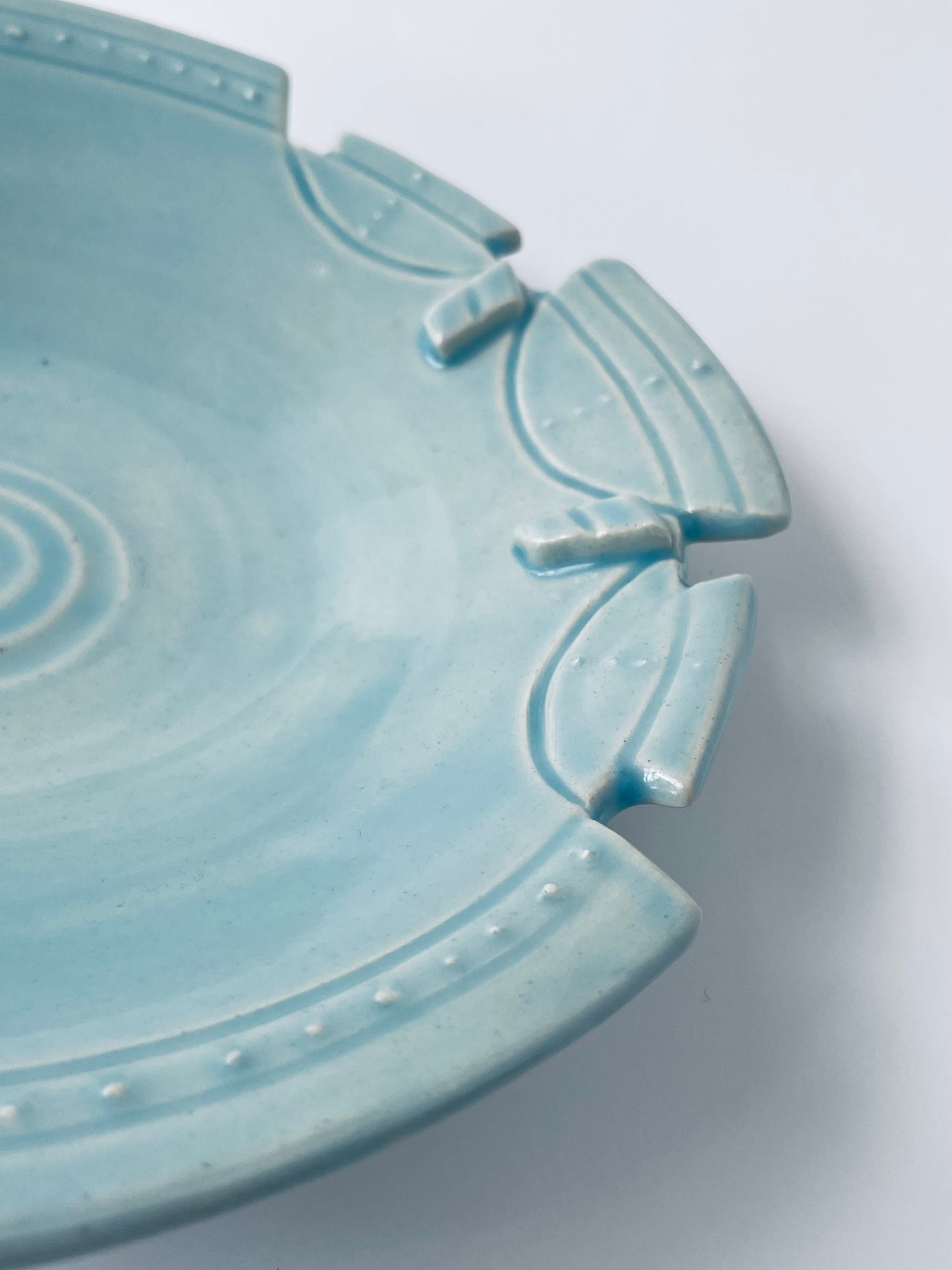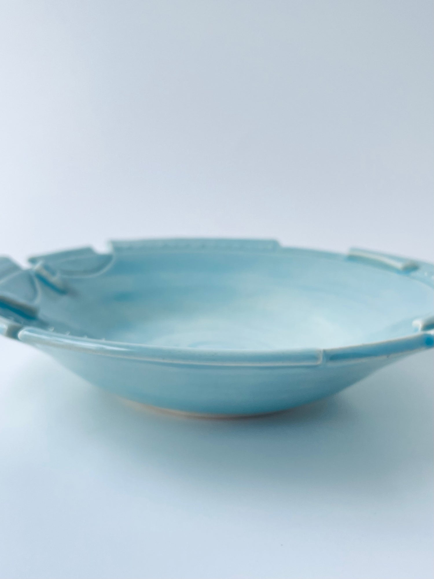 Sculptural geometrics characterize this altered-rim decorative bowl. The striking one-of-a-kind piece features a carved rim, sgraffito, and slip-trailing techniques. A translucent sky-blue glaze highlights these textured qualities.