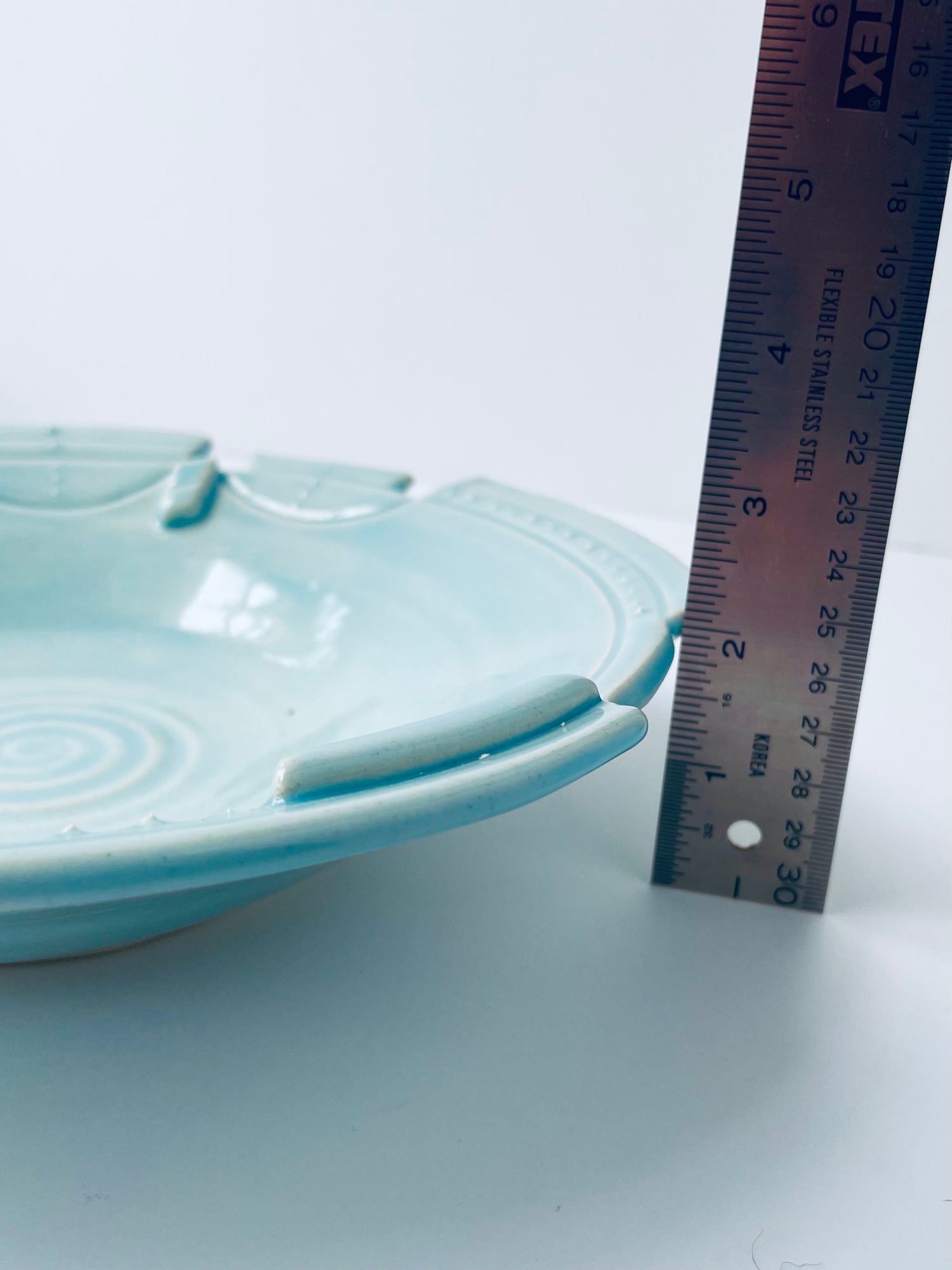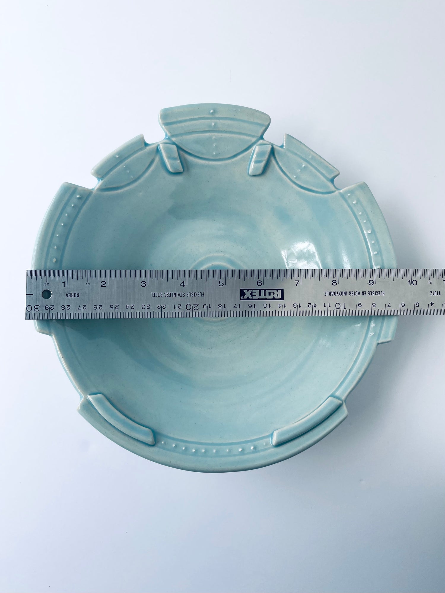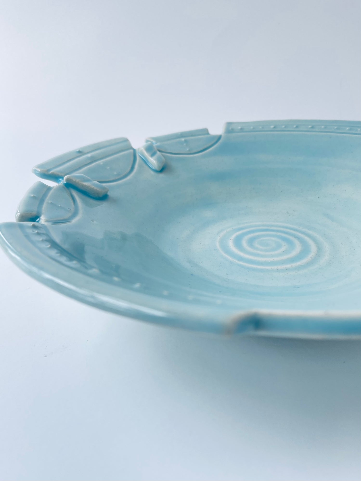 Sculptural geometrics characterize this altered-rim decorative bowl. The striking one-of-a-kind piece features a carved rim, sgraffito, and slip-trailing techniques. A translucent sky-blue glaze highlights these textured qualities.