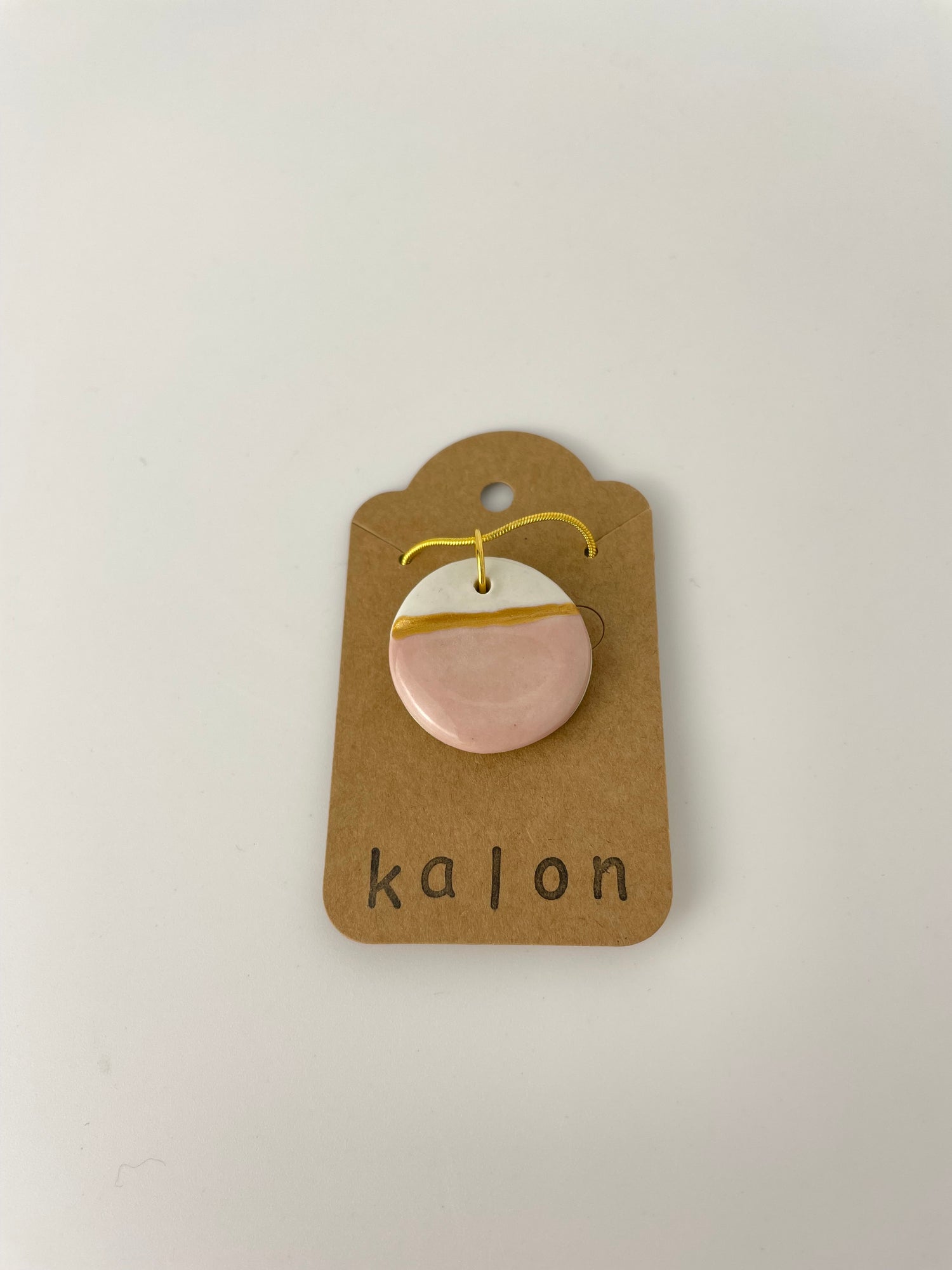 This mid-tone blush-pink glaze exudes warmth and softness without losing saturation, while a thin band of gold-toned porcelain paint adds a modern touch. The necklace includes a 18-inch snake chain in a high-polish gold alloy with a lobster clasp. As the charms are handmade, each is unique; expect individual variations.