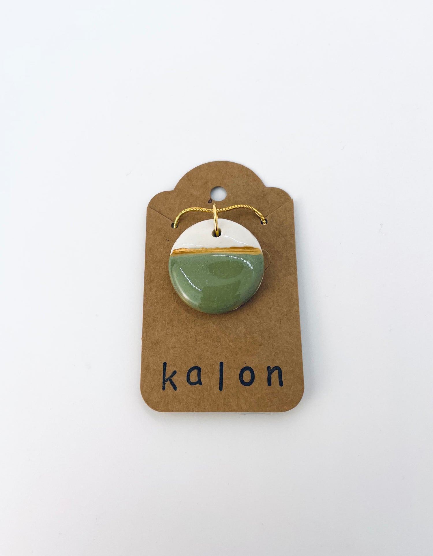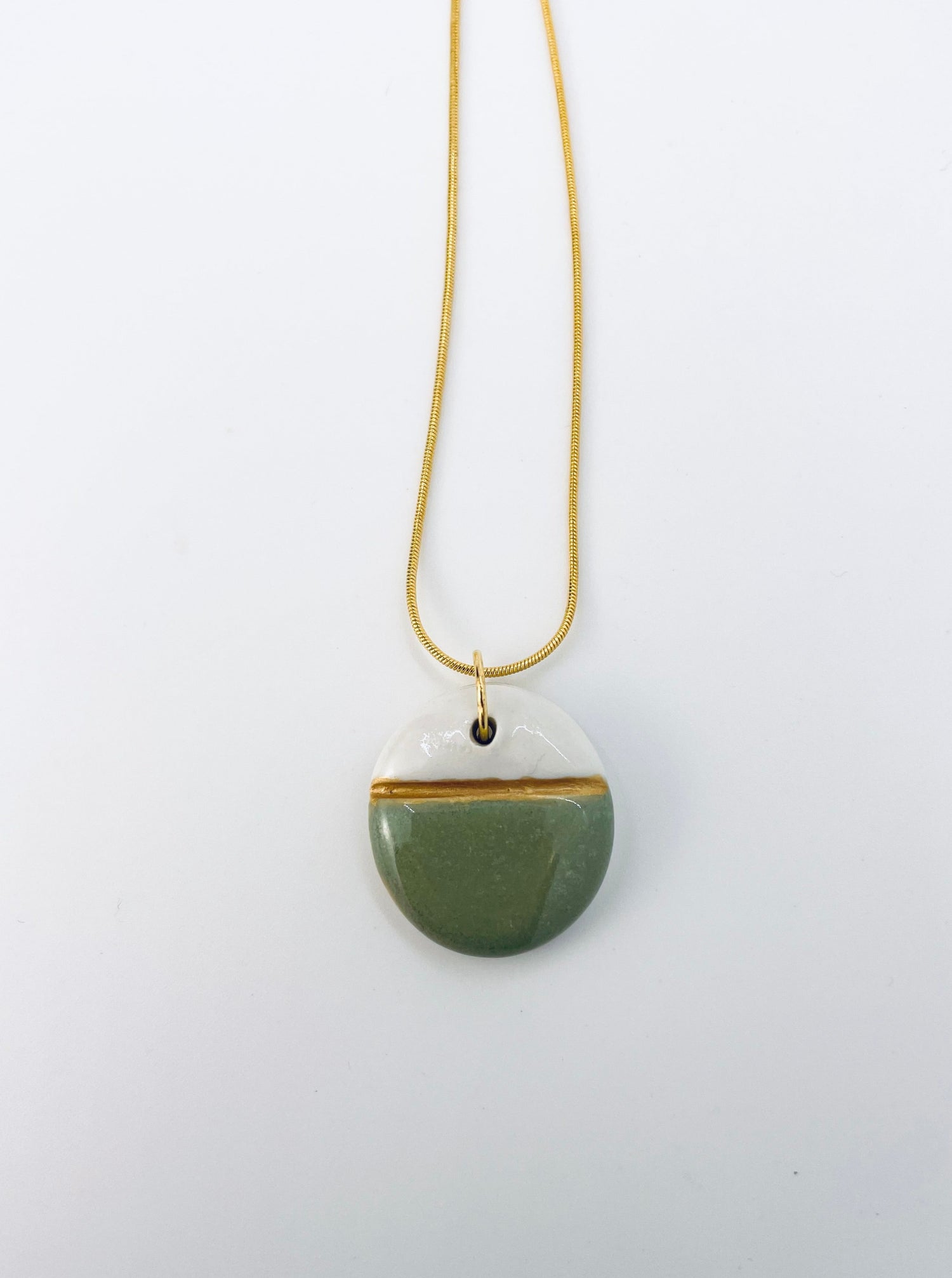This jade-green glaze exudes warmth and softness without losing saturation, while a thin band of gold-toned porcelain paint adds a modern touch. The necklace includes a 18-inch snake chain in a high-polish gold alloy with a lobster clasp. As the charms are handmade, each is unique; expect individual variations.