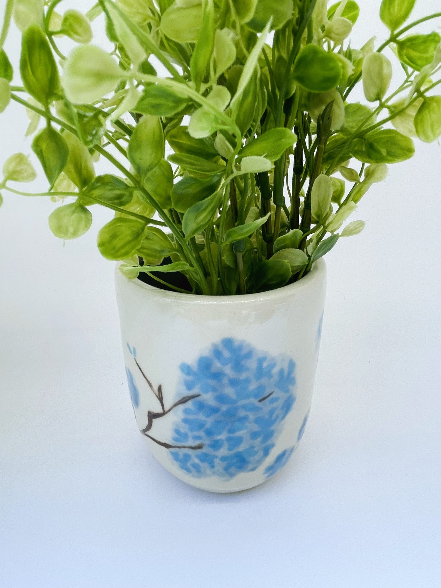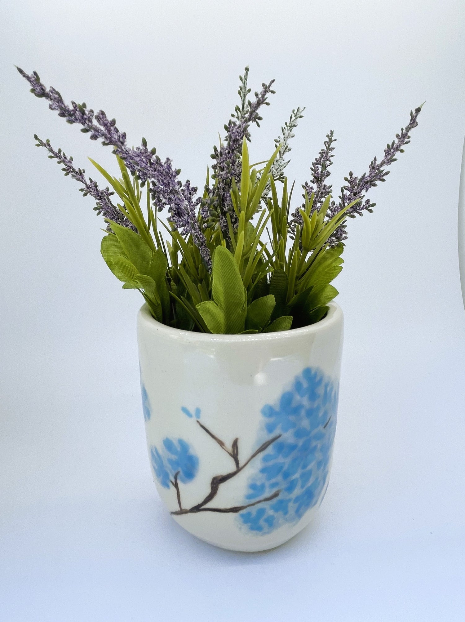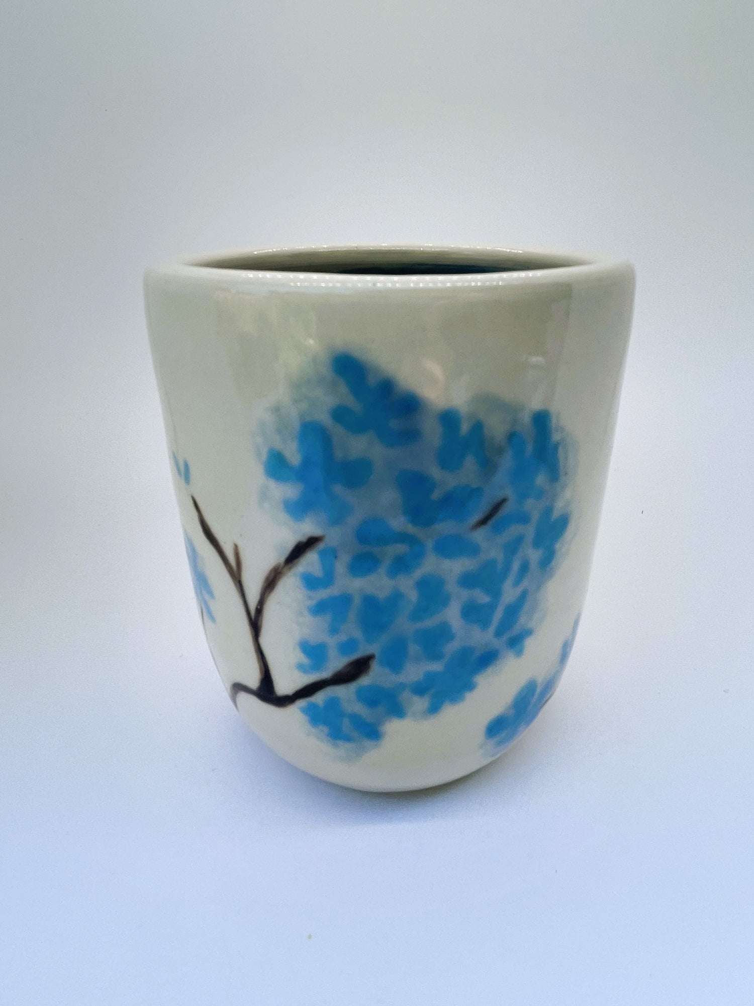 I threw this ceramic vase on the wheel in durable stoneware, and once it was bisque fired, I hand-painted sky-blue hydrangea petals and brown stems in underglaze before firing it a second time to fuse the pattern to the vase. Finally, I hand-painted a translucent light-blue glaze in the interior and sponged on the same glaze over the petals for a diffused romantic effect. It awaits your favourite flowers!