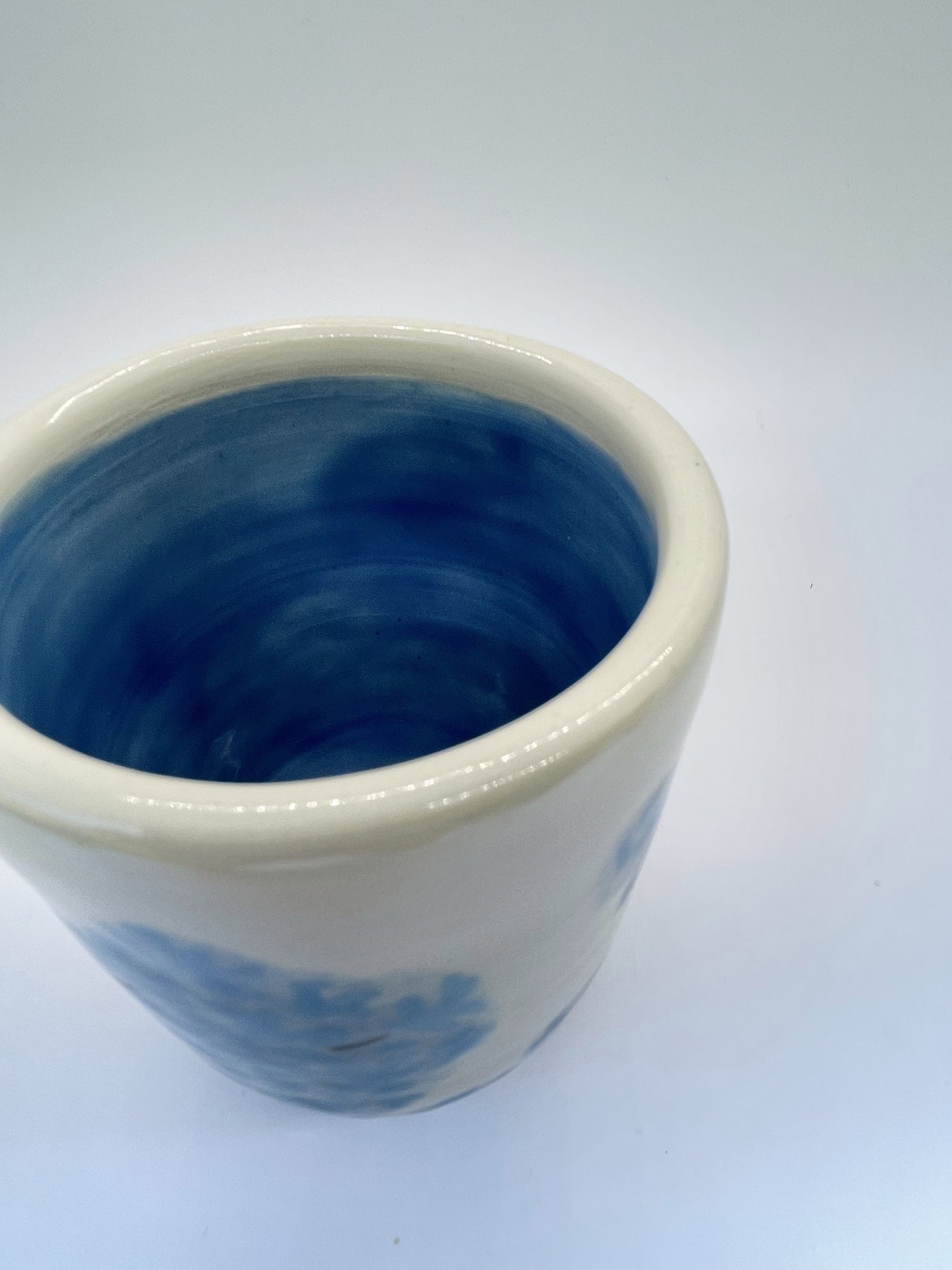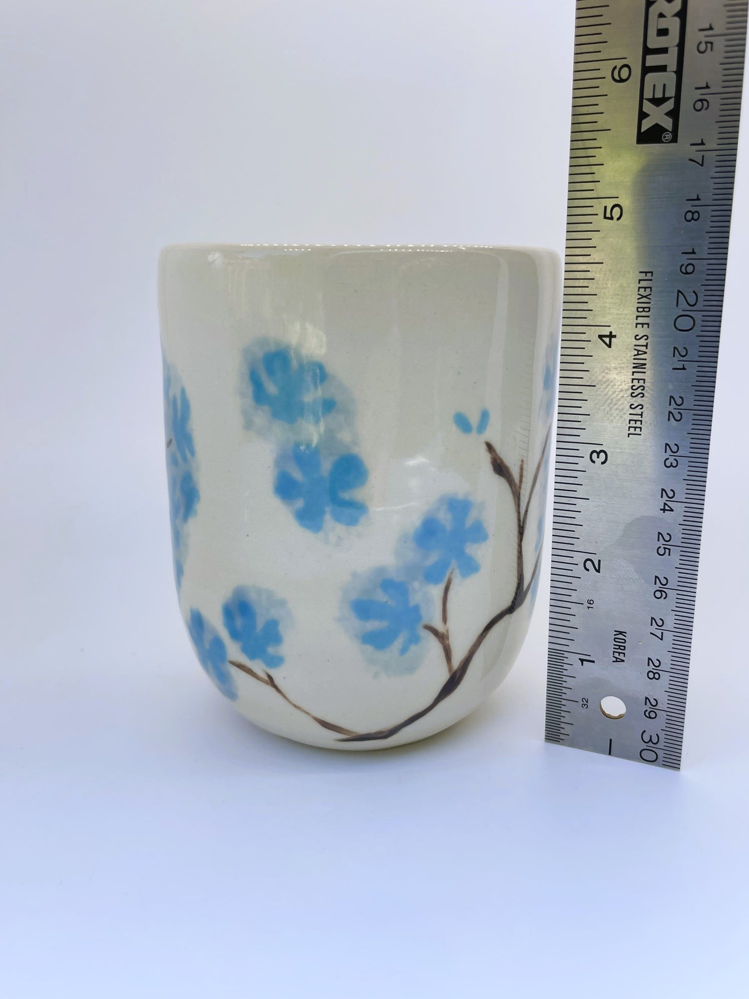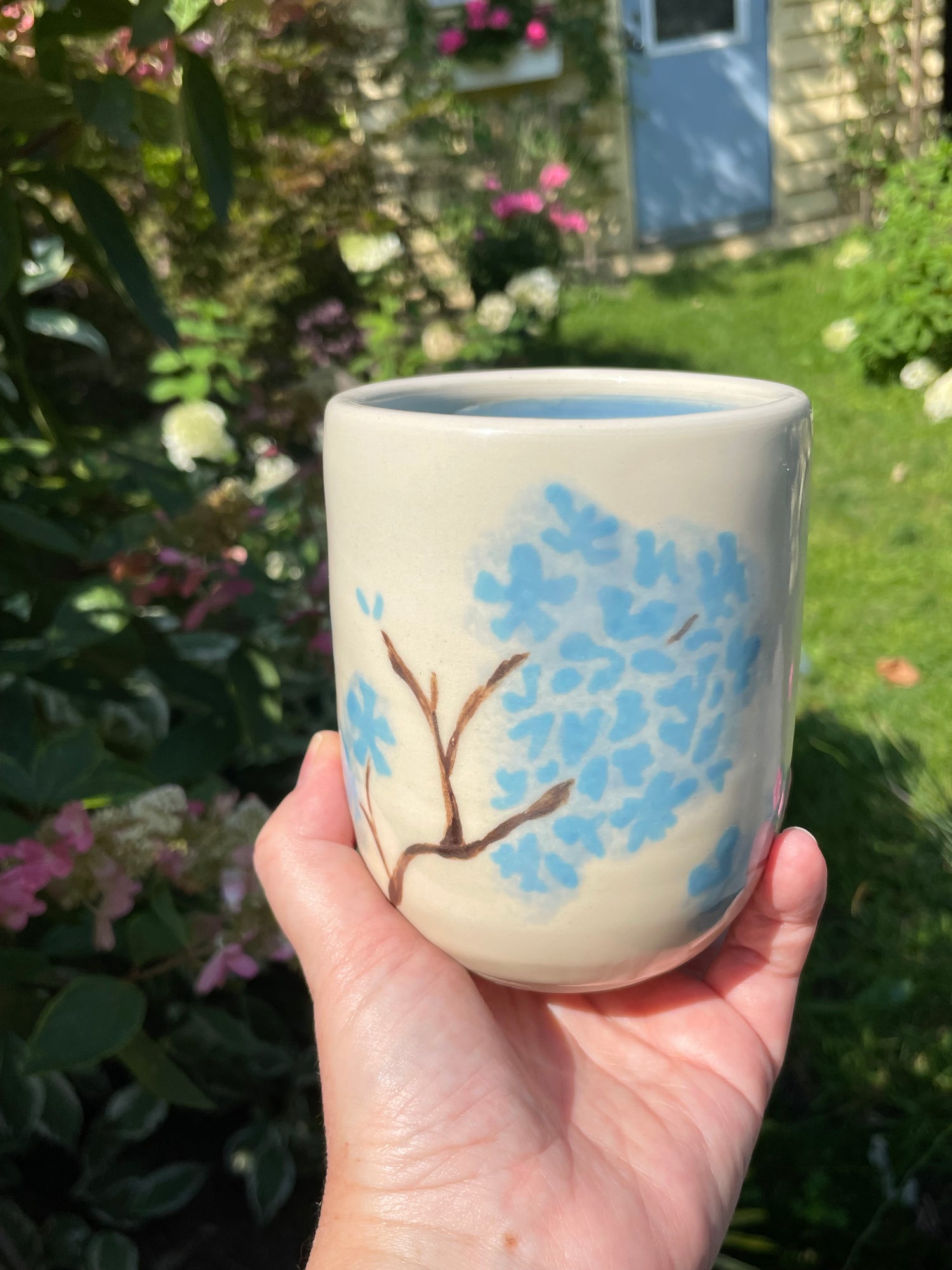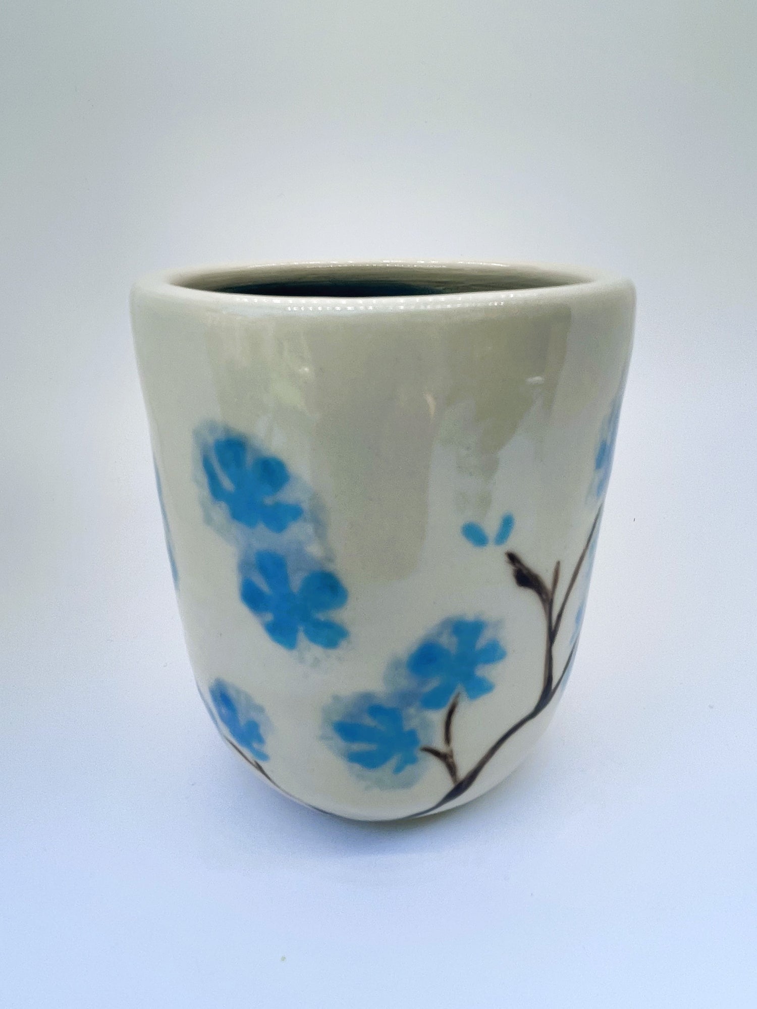I threw this ceramic vase on the wheel in durable stoneware, and once it was bisque fired, I hand-painted sky-blue hydrangea petals and brown stems in underglaze before firing it a second time to fuse the pattern to the vase. Finally, I hand-painted a translucent light-blue glaze in the interior and sponged on the same glaze over the petals for a diffused romantic effect. It awaits your favourite flowers!