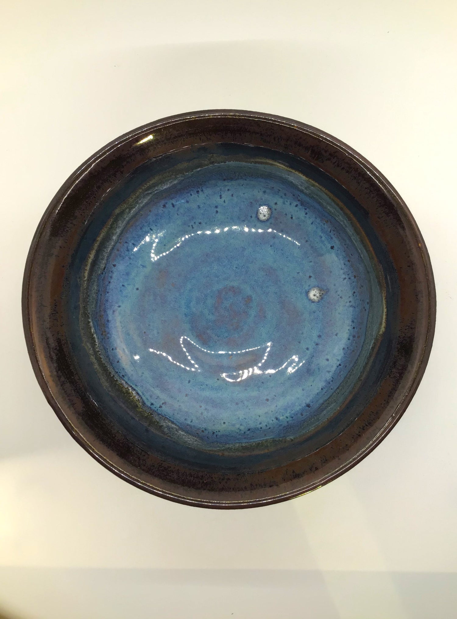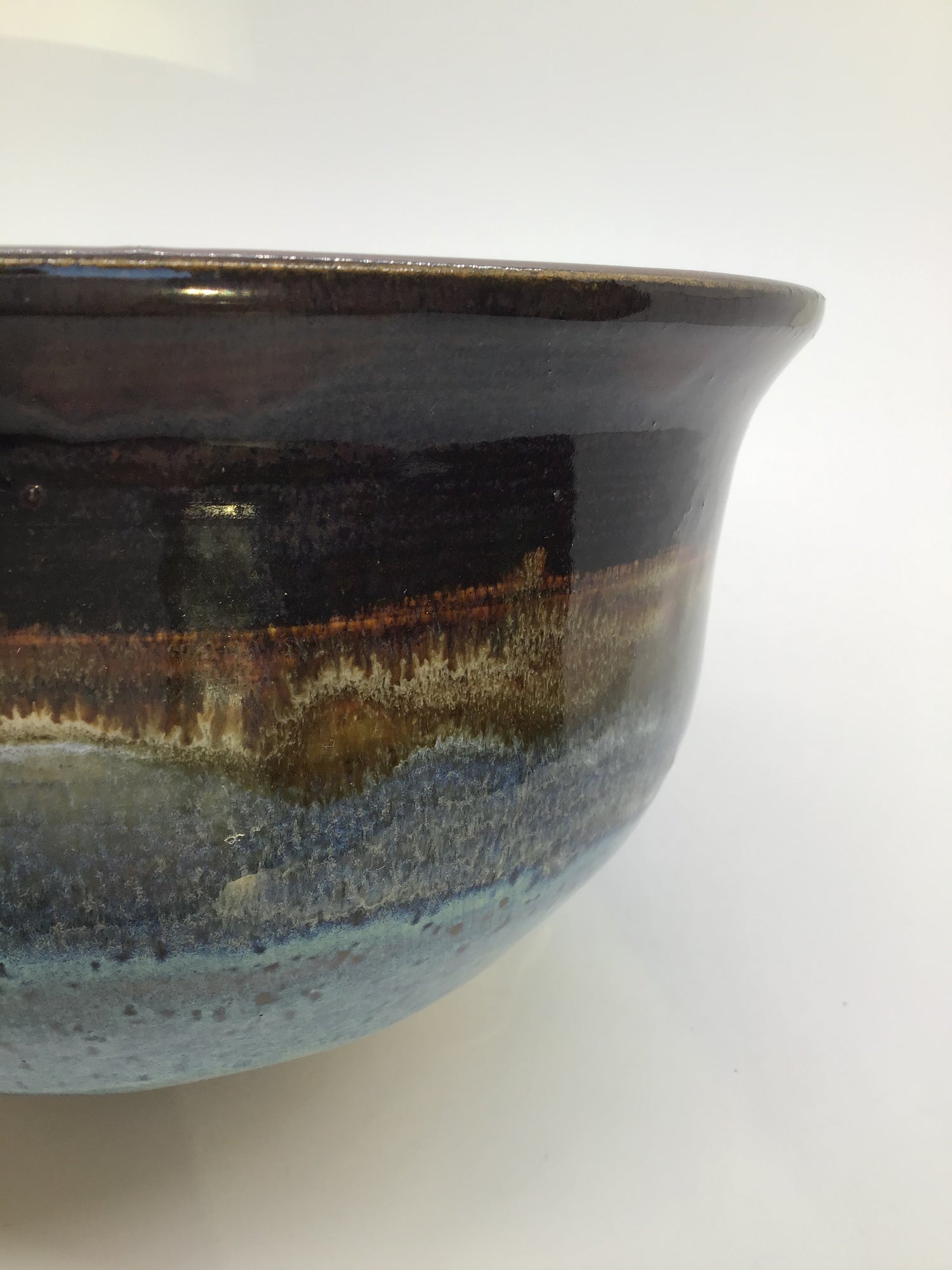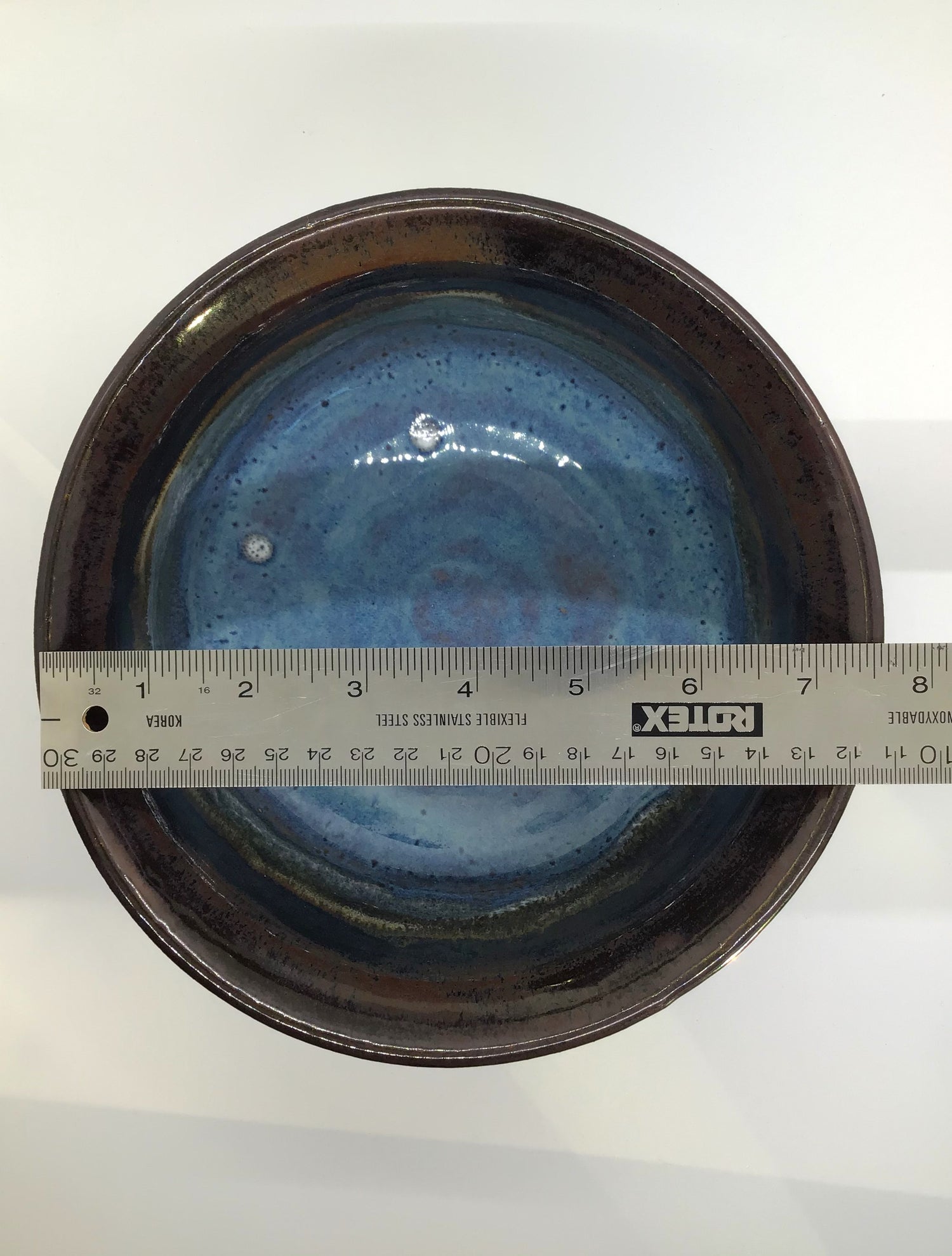 Dark and dramatic variegated tones suggest a roiling ocean tide on this unique pottery bowl. To achieve this effect, I brushed on shades of rutile blue, jasper and white glazes in overlapping layers. While decorative, the gently rimmed bowl is completely functional. Use it as a fruit bowl in your kitchen, or to serve salads, pastas and generous side dishes for large families or gatherings. Or simply enjoy it as a striking home-decor accessory.