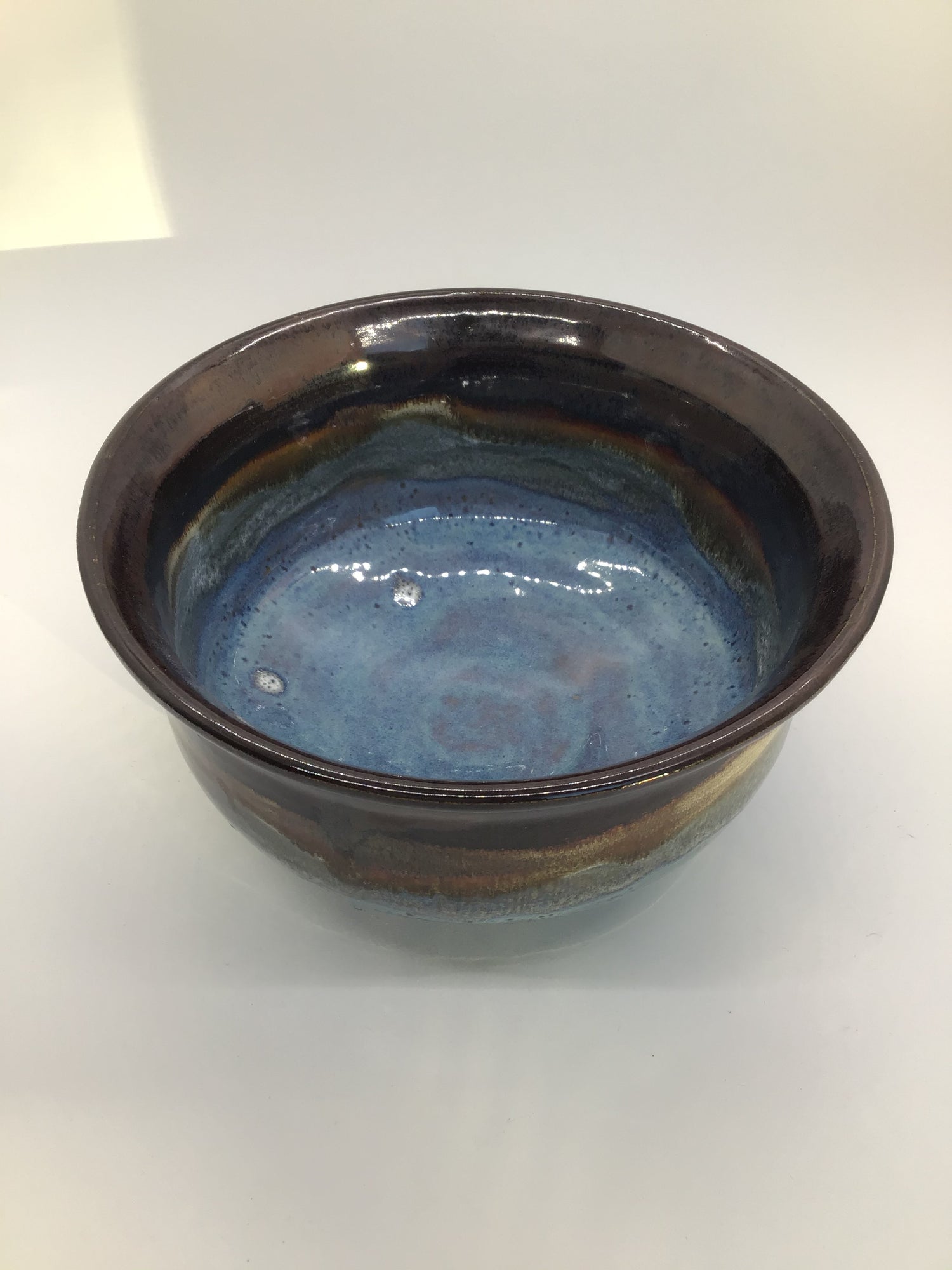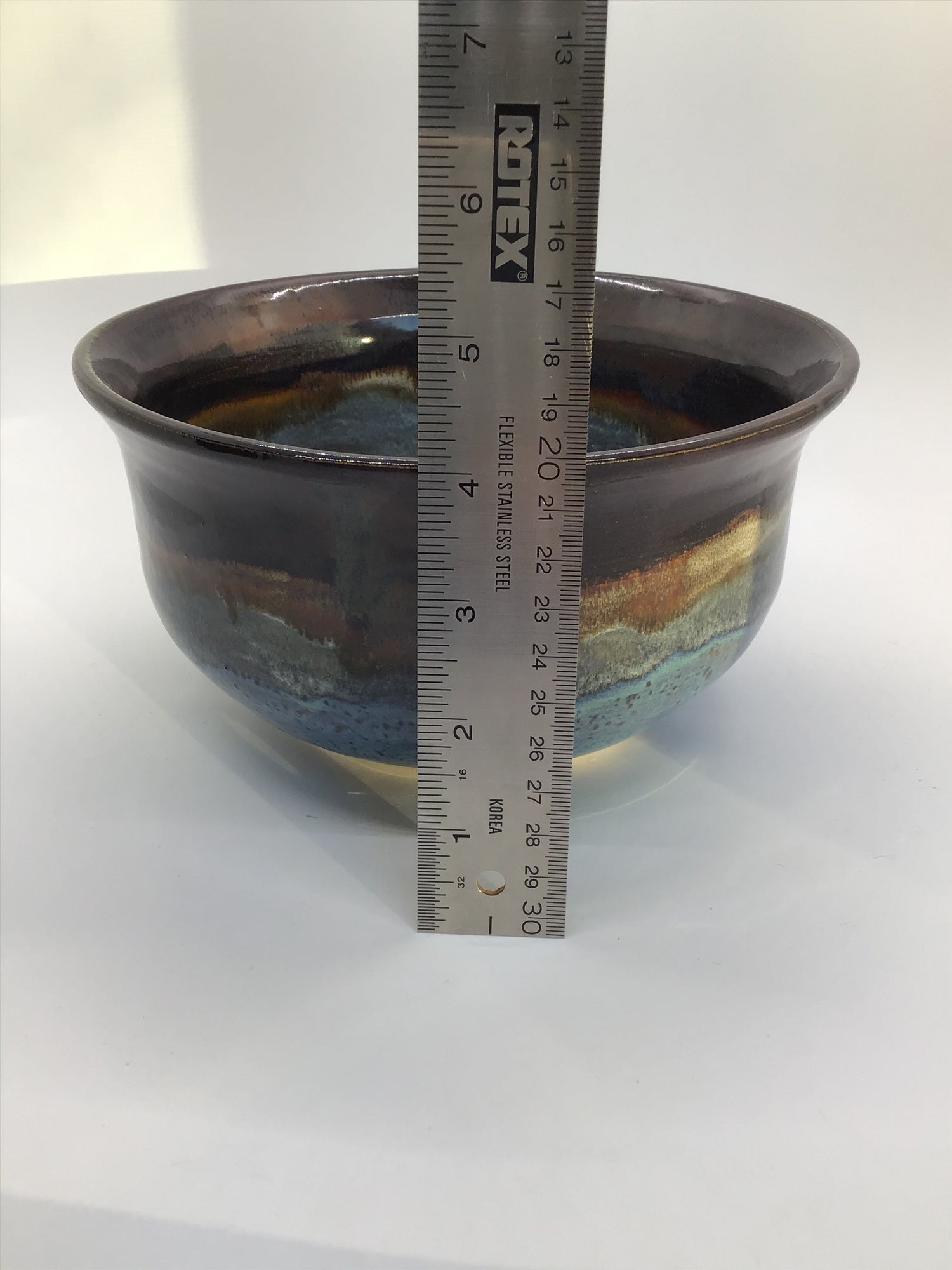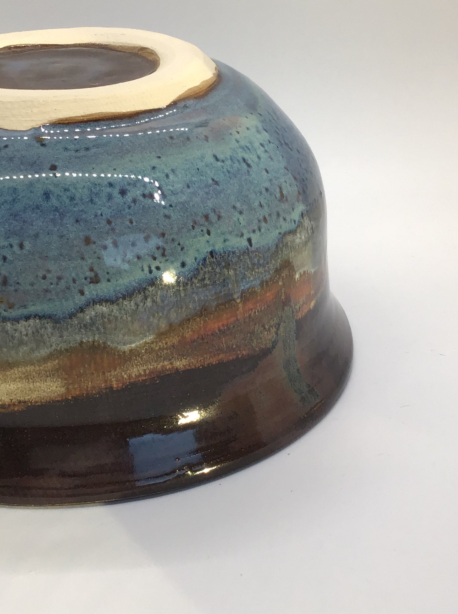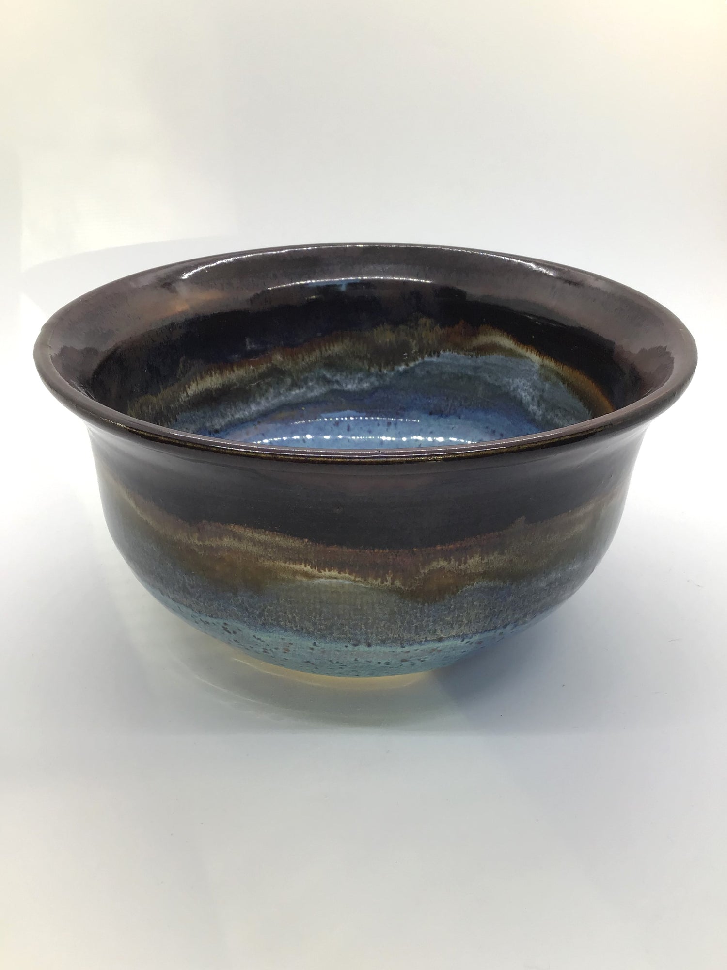 Dark and dramatic variegated tones suggest a roiling ocean tide on this unique pottery bowl. To achieve this effect, I brushed on shades of rutile blue, jasper and white glazes in overlapping layers. While decorative, the gently rimmed bowl is completely functional. Use it as a fruit bowl in your kitchen, or to serve salads, pastas and generous side dishes for large families or gatherings. Or simply enjoy it as a striking home-decor accessory.