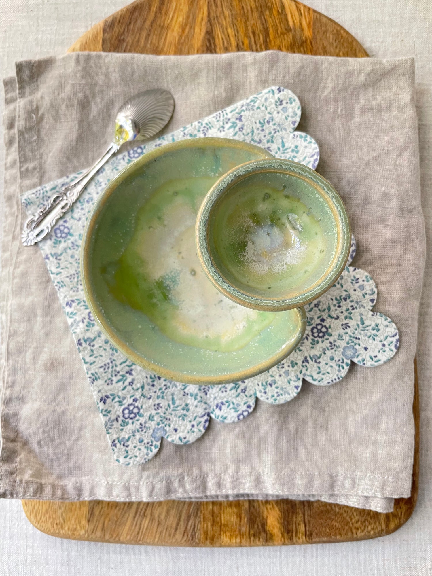 For the Folded Edge olive bowl style, the small bowl is attached onto the folded edge of the main bowl. This combo starts with a bowl thrown on the wheel, and the smaller bowl thrown off the hump (a big lump of clay from which small items are made in succession). The main bowl and the smaller one are sealed together with slip, a liquid clay.