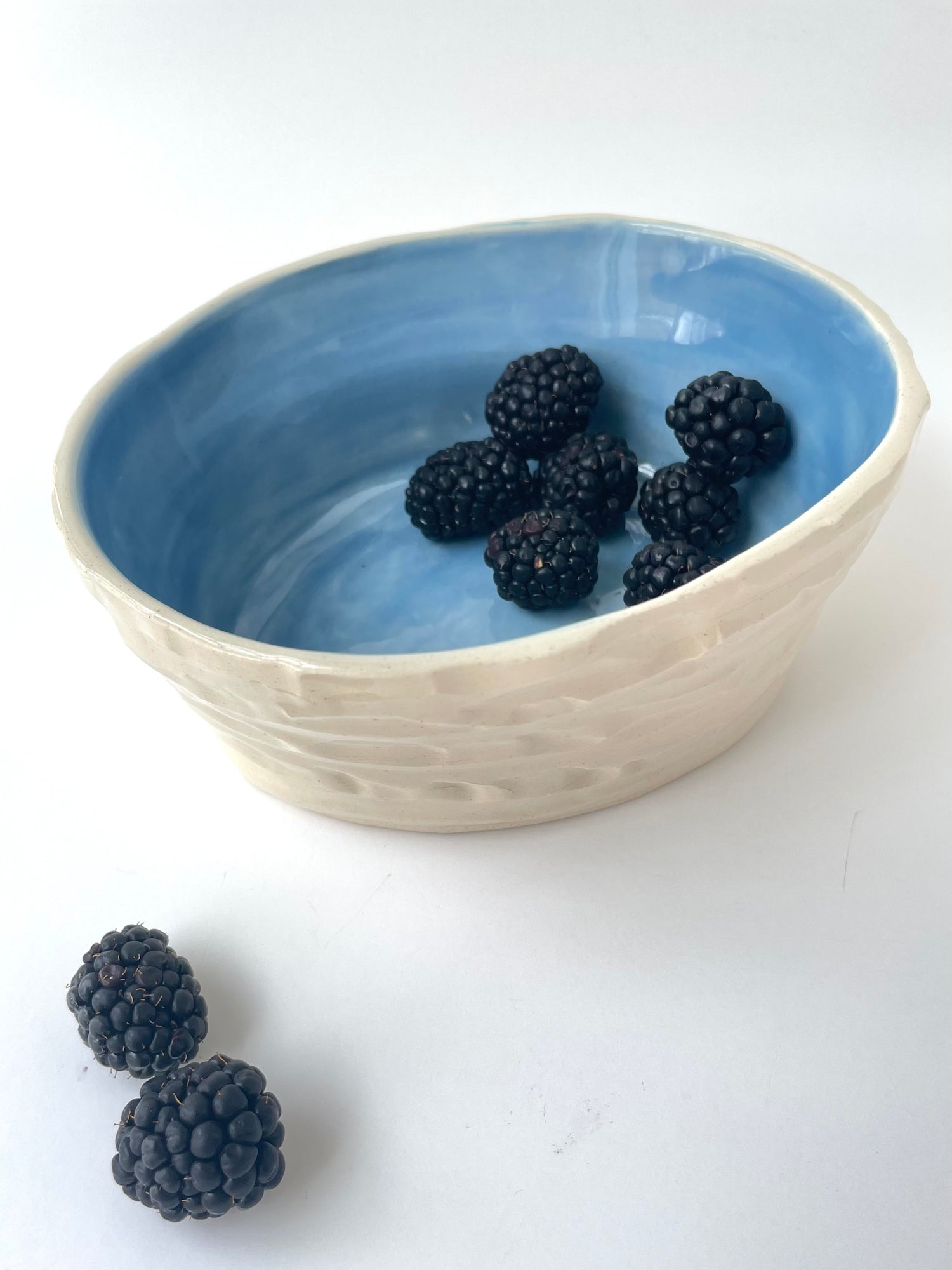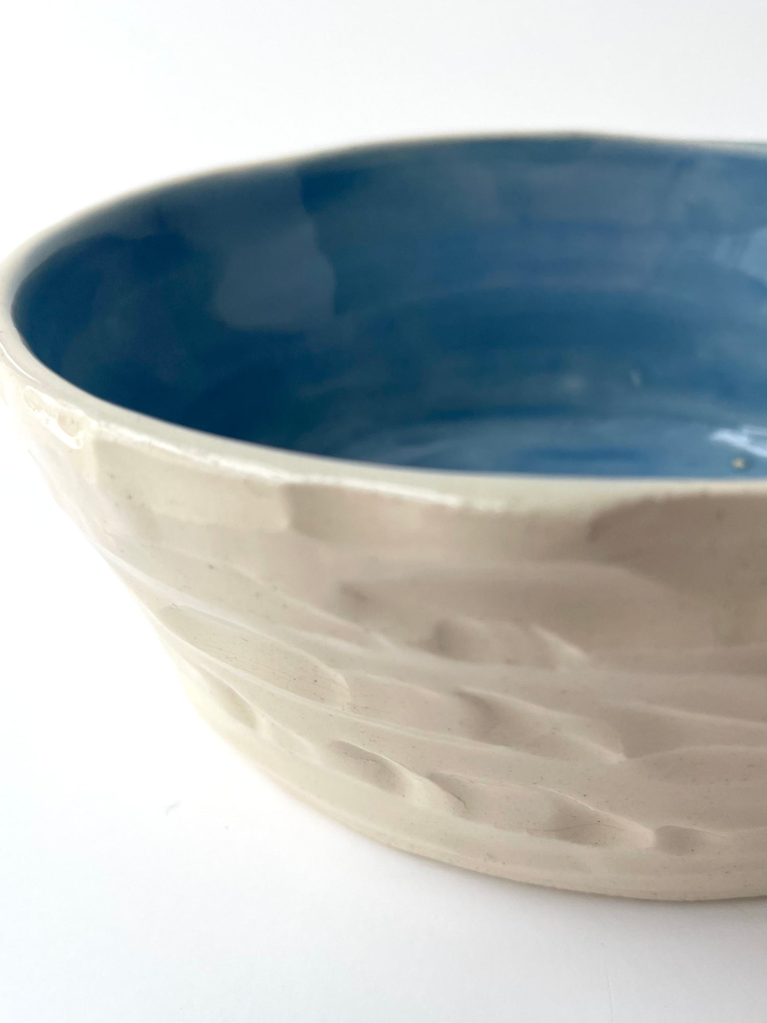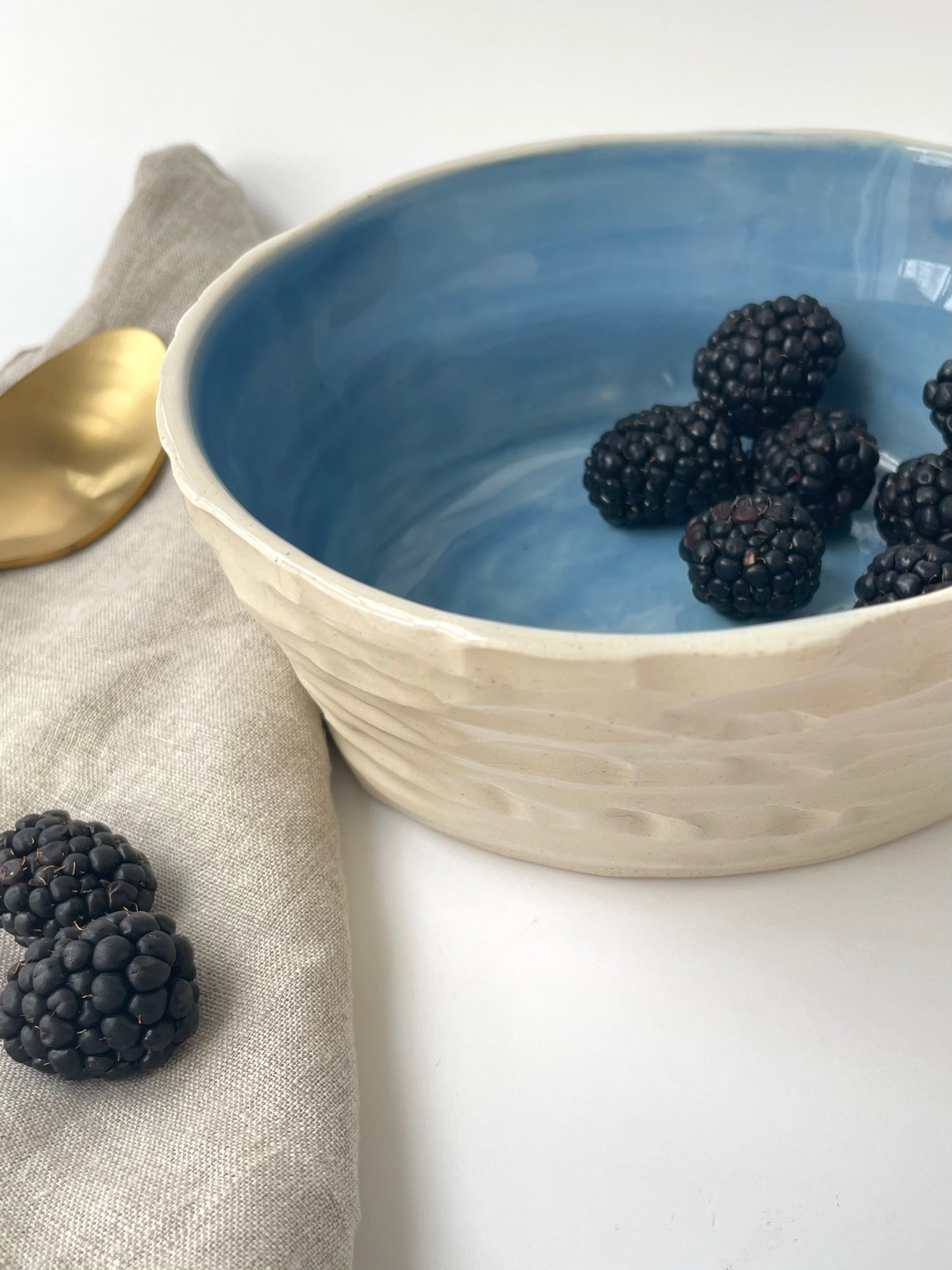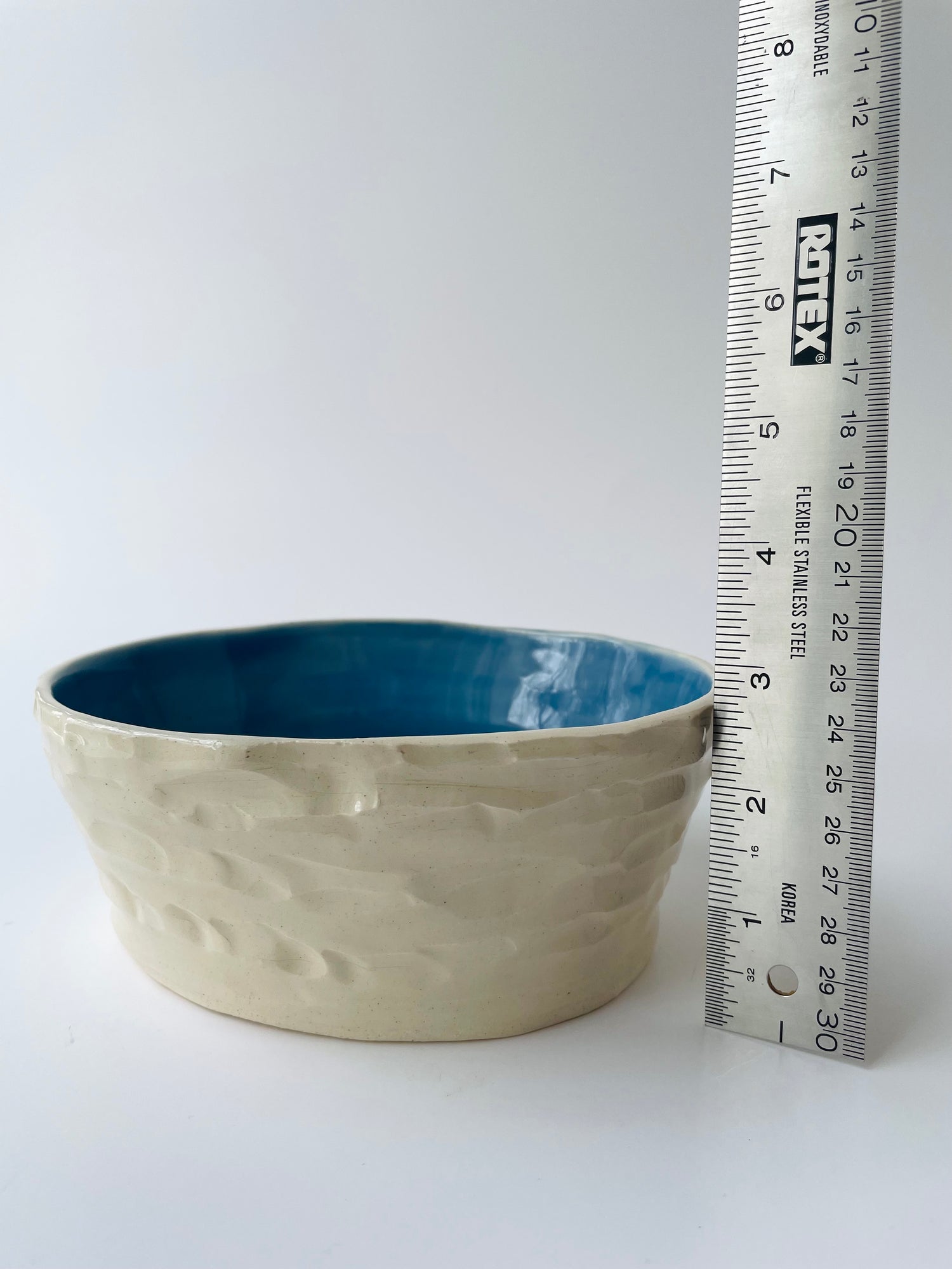 This cuteĀ hand-etched bowl is both decorative and functional. FillĀ this textured blue ceramic bowl with crackers, candy, snacks, cookies, and more. Or simply enjoy it as a home-decor accessory.