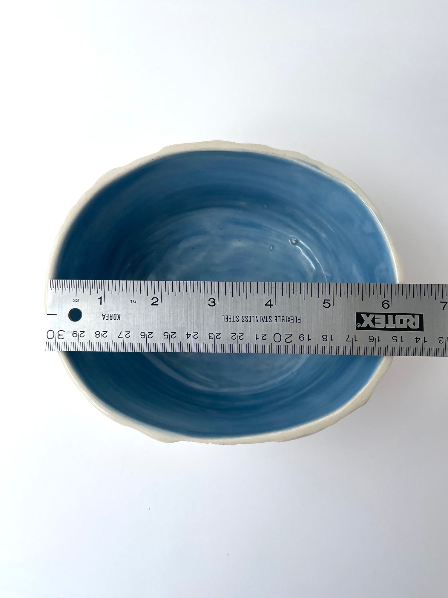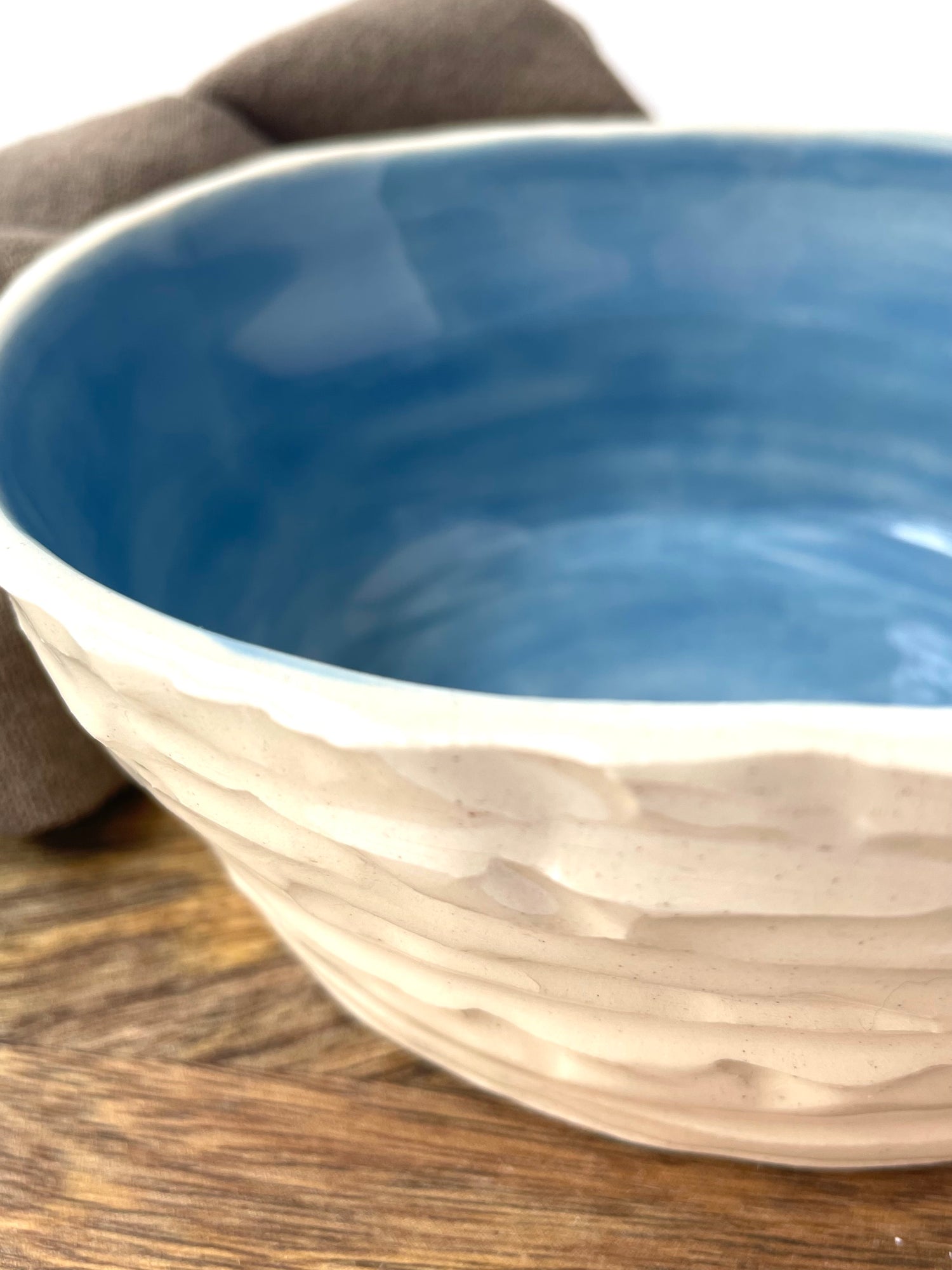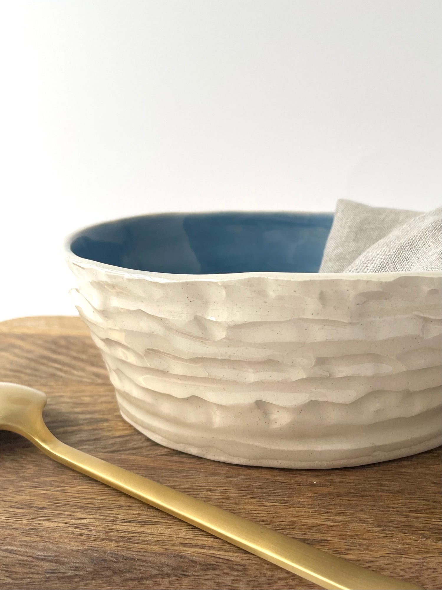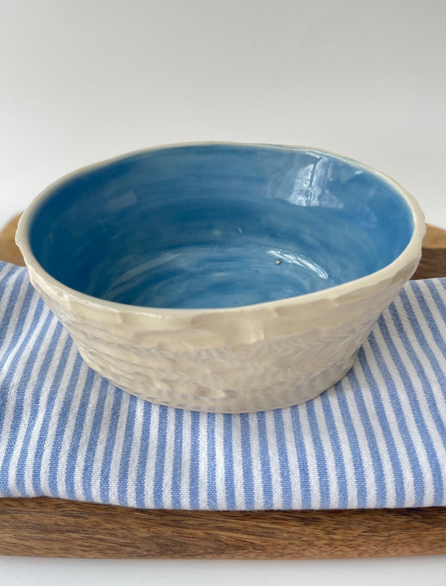 This cuteĀ hand-etched bowl is both decorative and functional. FillĀ this textured blue ceramic bowl with crackers, candy, snacks, cookies, and more. Or simply enjoy it as a home-decor accessory.