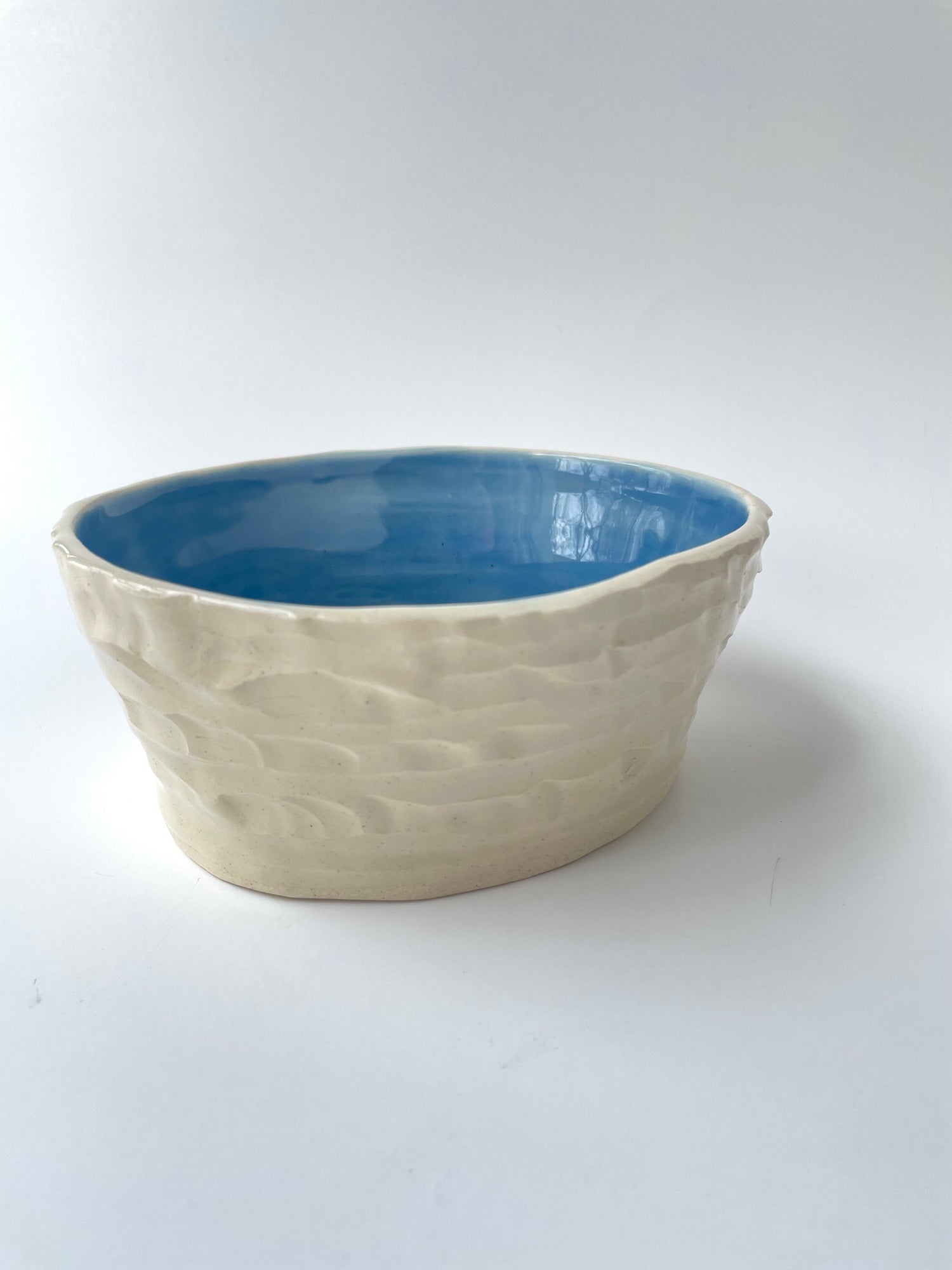 After throwing this bowl on the wheel, I altered the shape to an oval and created texture by carving the exterior. After its first firing, I painted sky-blue glaze for a bright effect, and used a clear glaze to highlight the textured exterior.