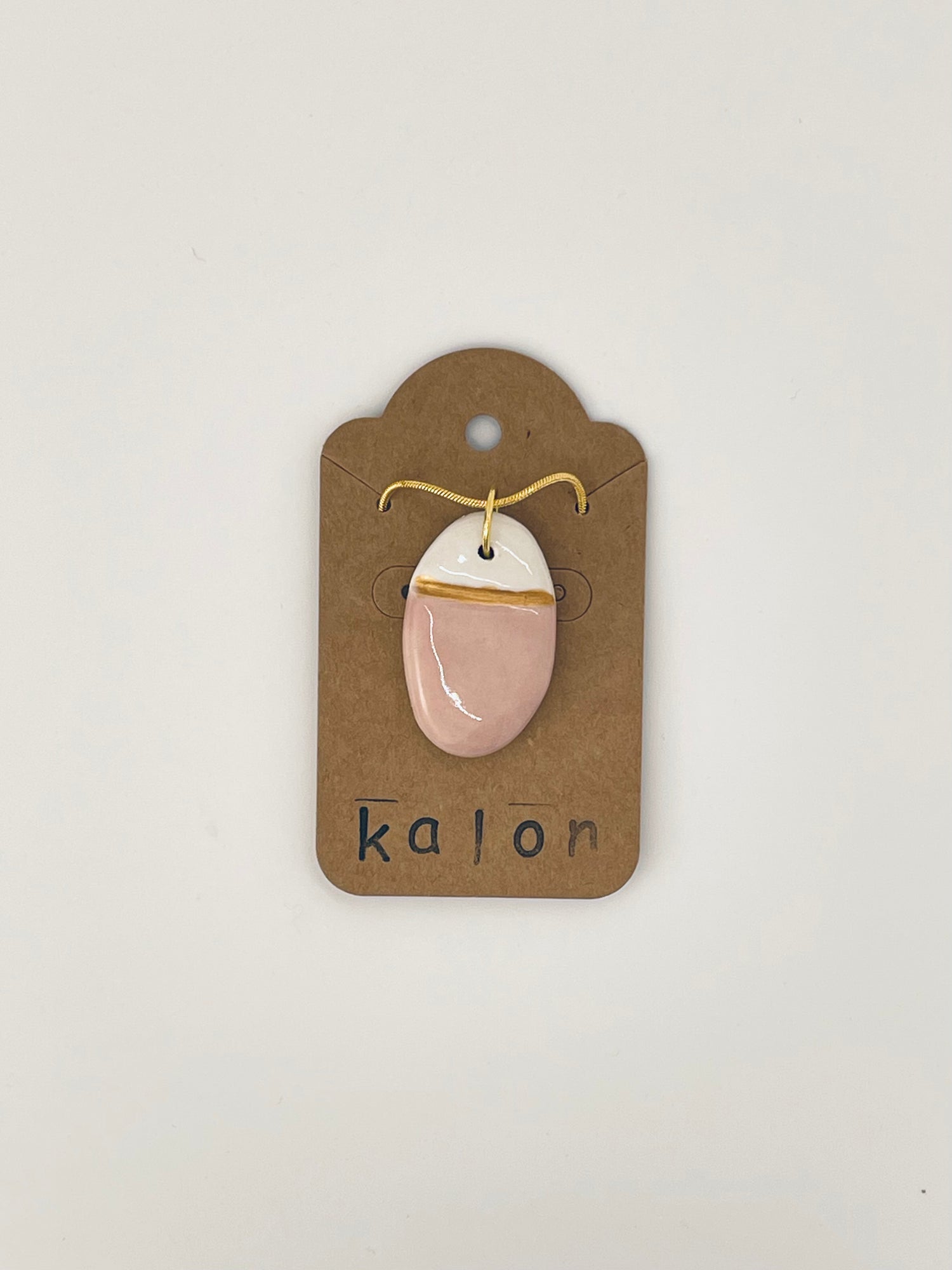 This mid-tone blush-pink glaze exudes warmth and softness without losing saturation, while a thin band of gold-toned porcelain paint adds a modern touch. The necklace includes a 18-inch snake chain in a high-polish gold alloy with a lobster clasp. As the charms are handmade, each is unique; expect individual variations.