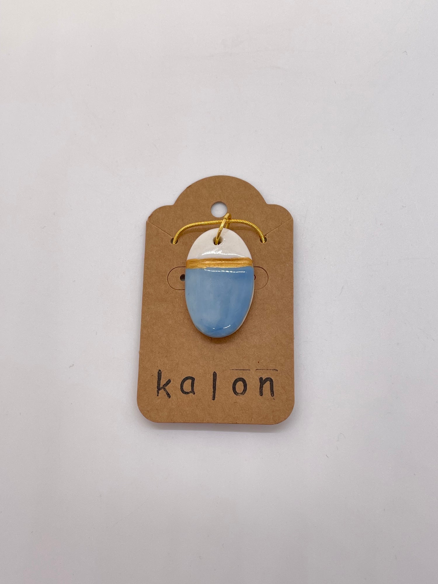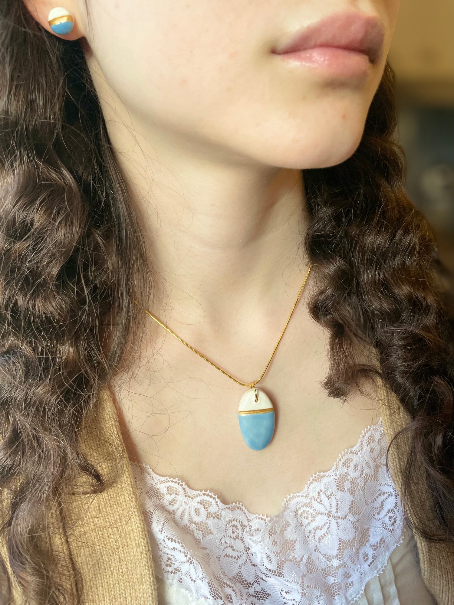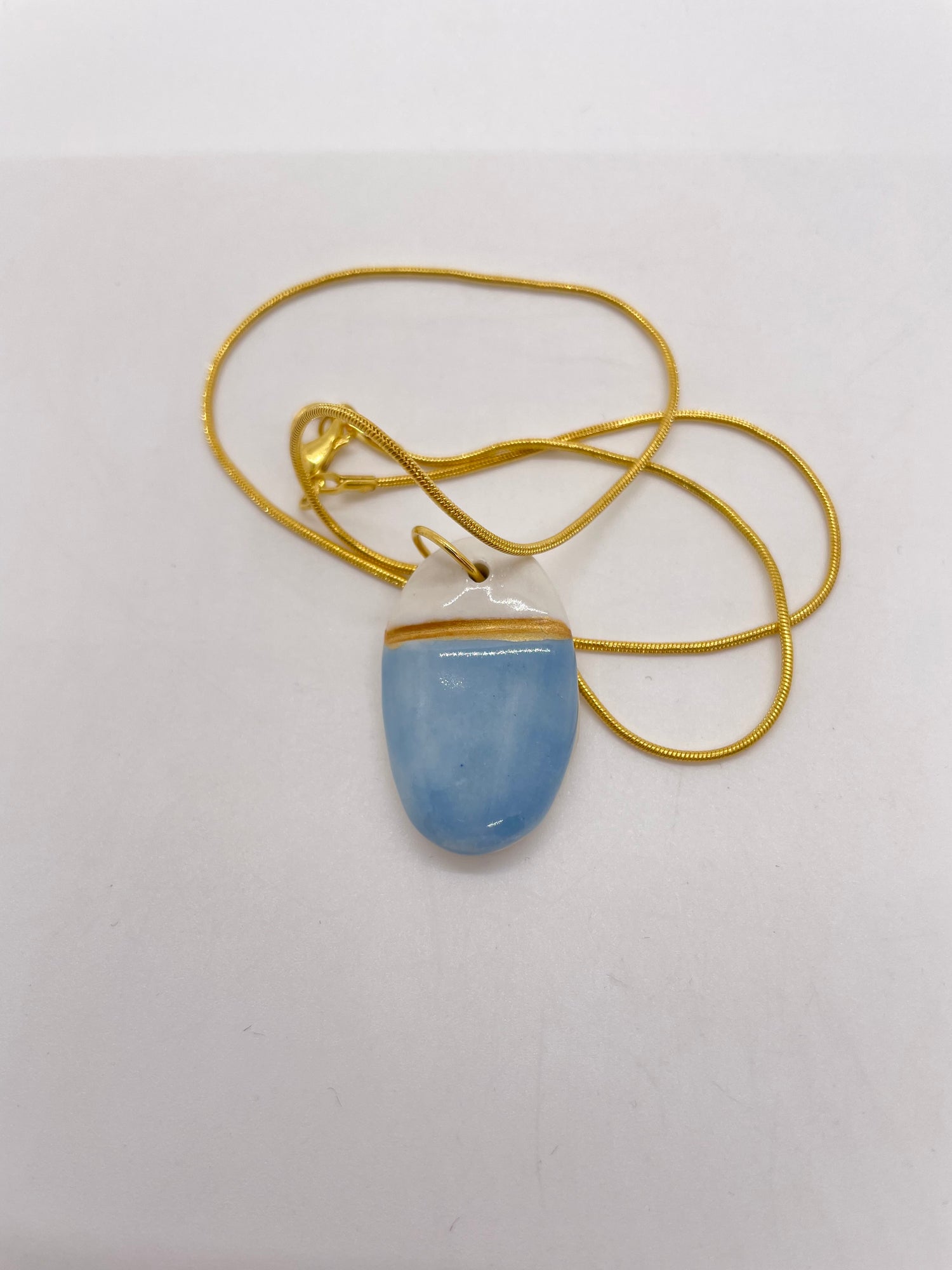 This medium-light-blue glaze exudes warmth and softness without losing saturation, while a thin band of gold-toned porcelain paint adds a modern touch. The necklace includes an 18-inch snake chain in a high-polish gold alloy with a lobster clasp. As the charms are handmade, each is unique; expect individual variations.
