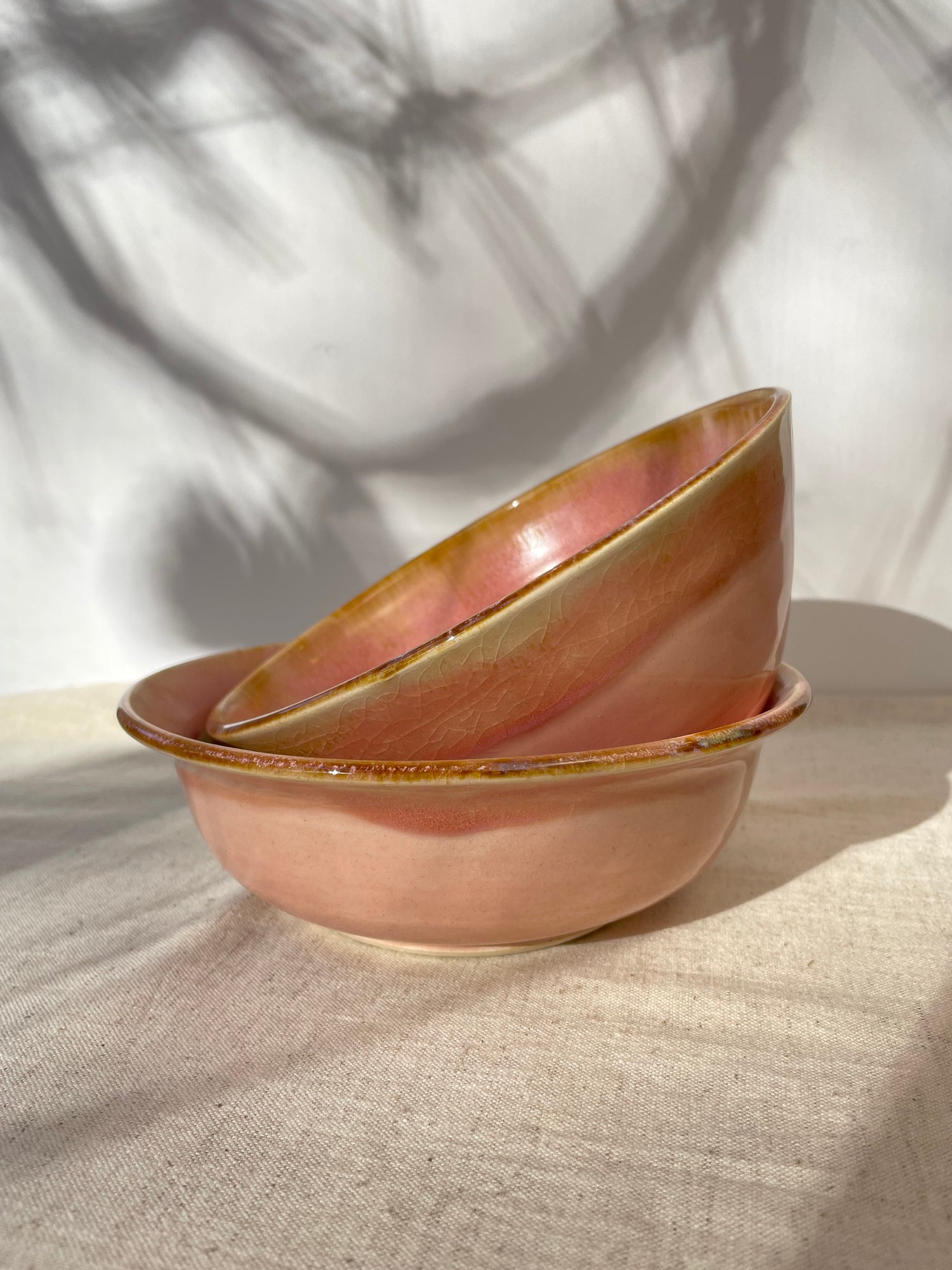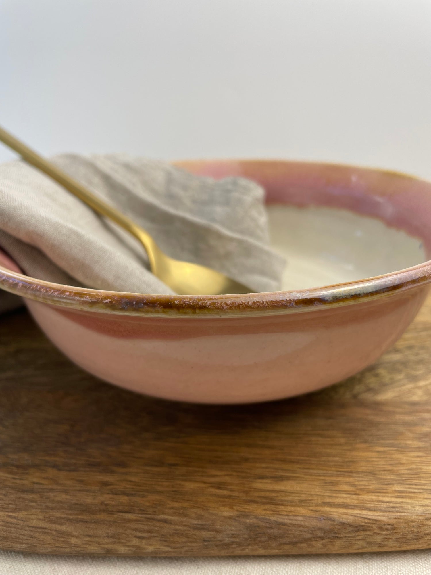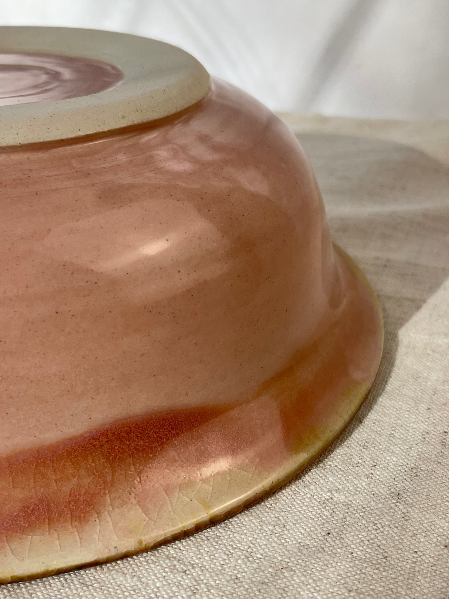 Romantic shades of pink quartz and a touch of topaz grace this elegant bowl. A decorative crackle effect in the glaze results in the overlap of the tones near the rim. While decorative, this graceful bowl can function as a medium-sized serving bowl for side-dishes or a colourful noodle bowl. Or simply enjoy it as a charming home-decor accessory.
