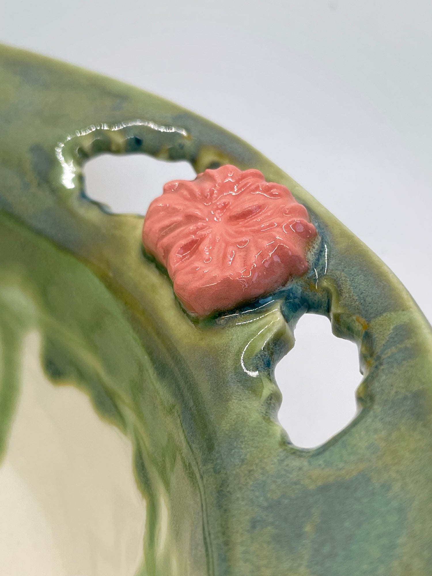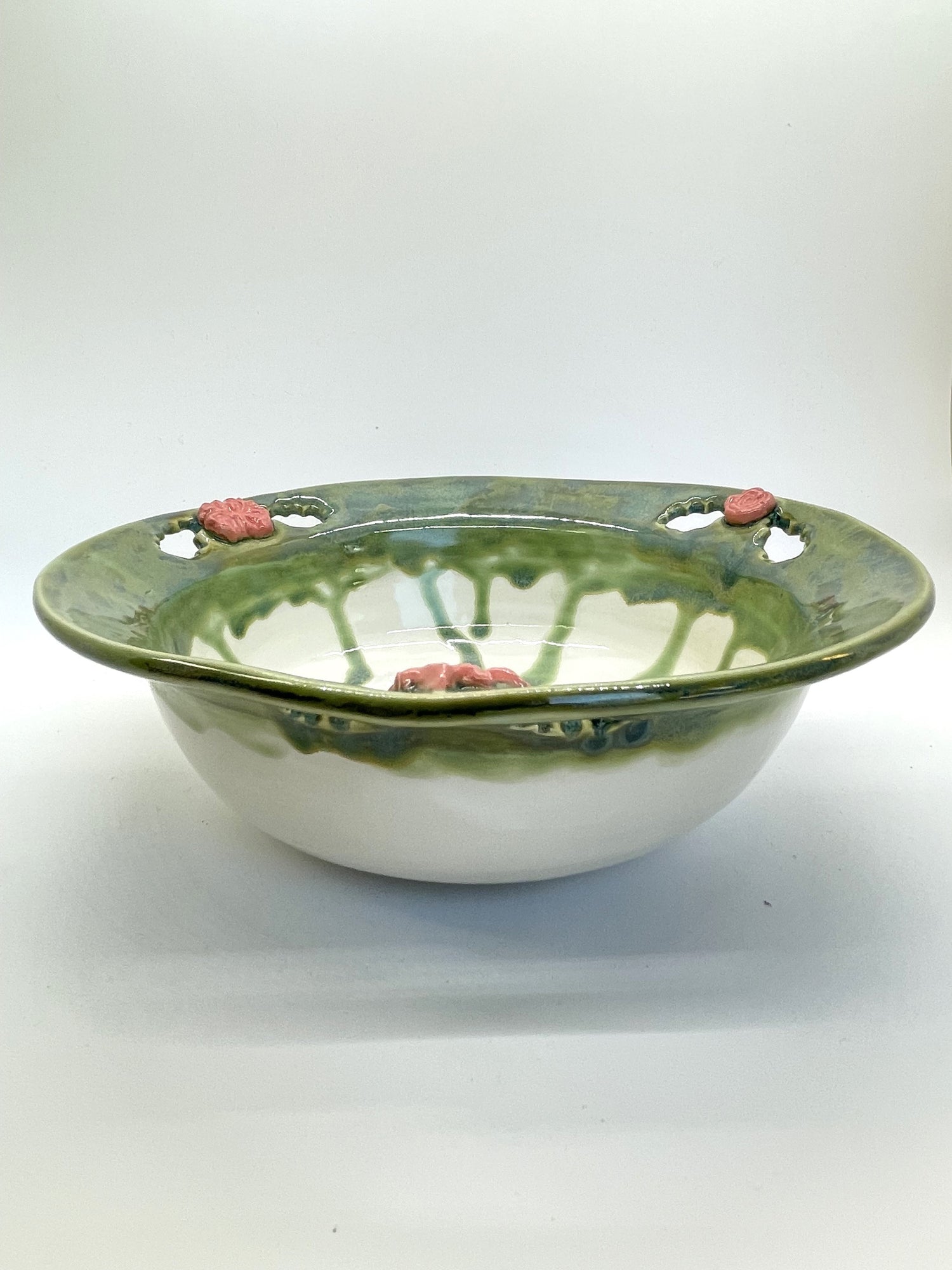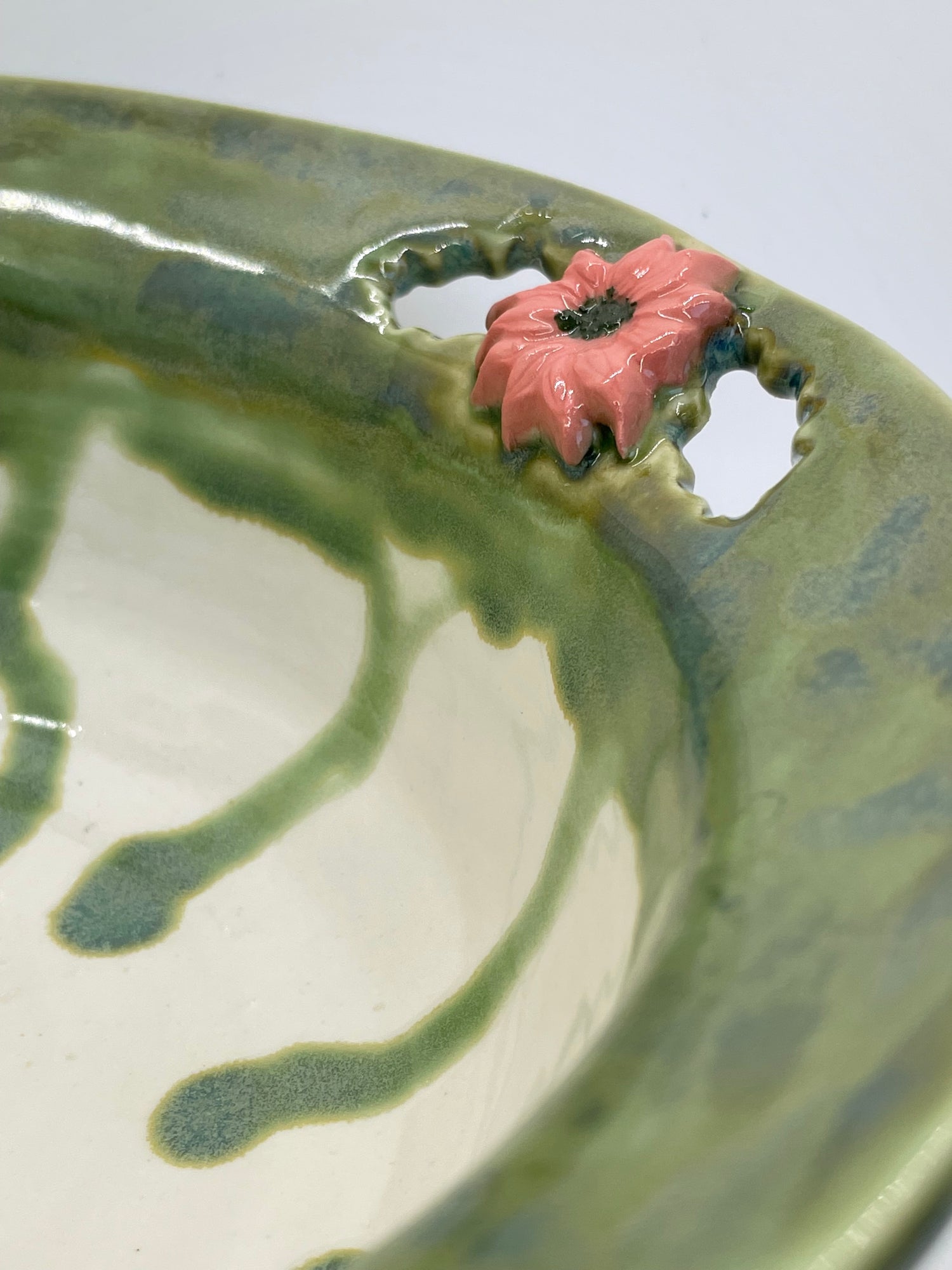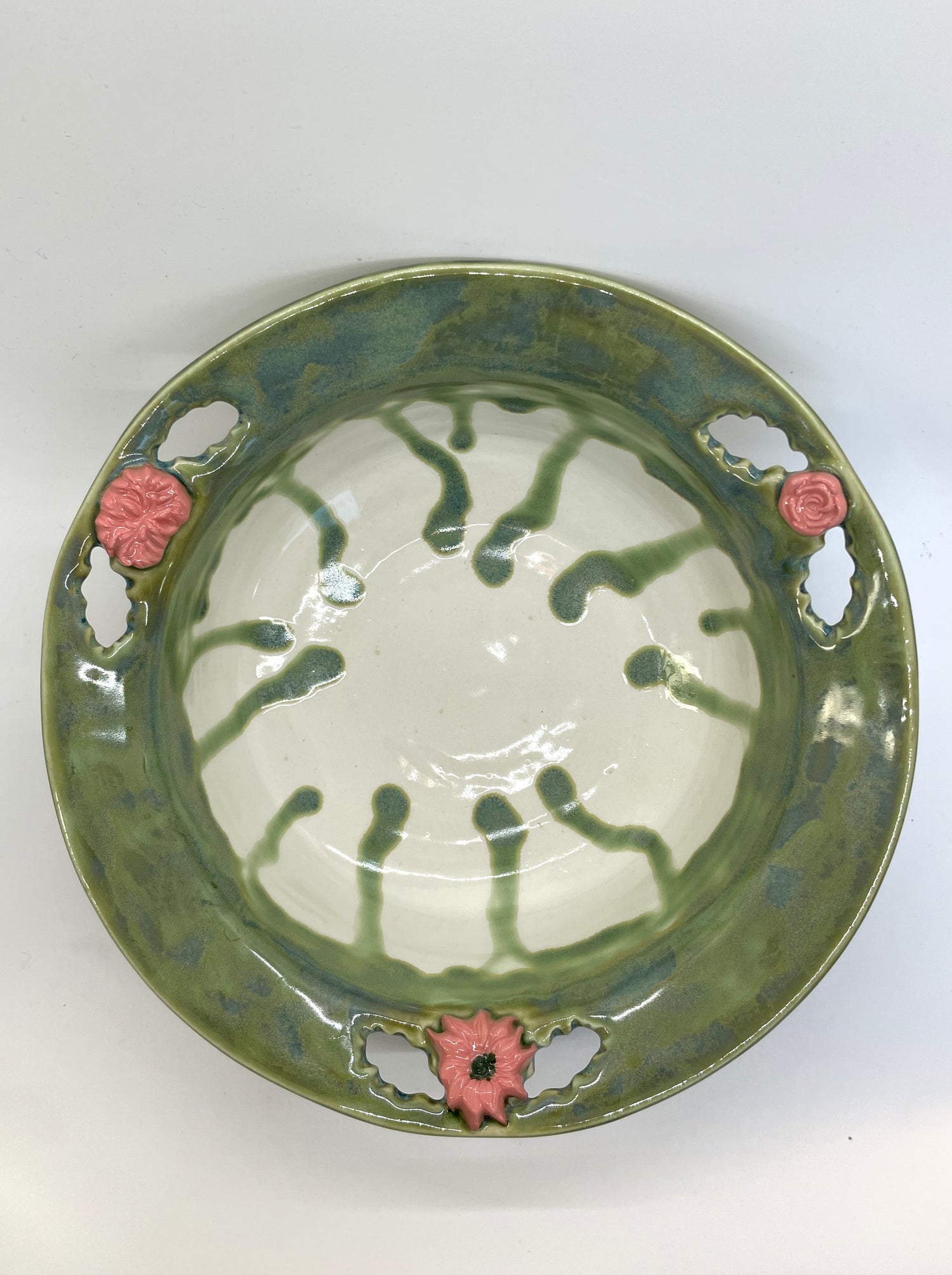 A ring of richly running jade glaze encircles the rim of this unique decorative bowl. A trio of blush pink flowers, each made from a different sprig, and cut-out leaf shapes add pretty touches. While decorative, it's completely functional too. Use it as a fruit bowl in your kitchen, or to serve salads and side dishes for large families or gatherings.
