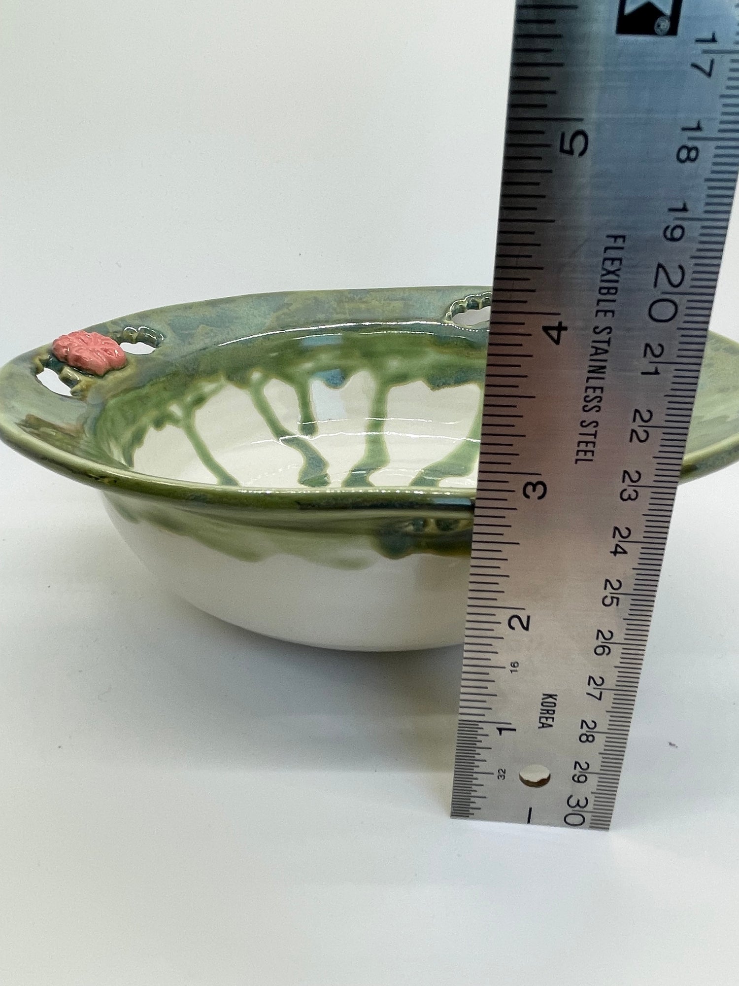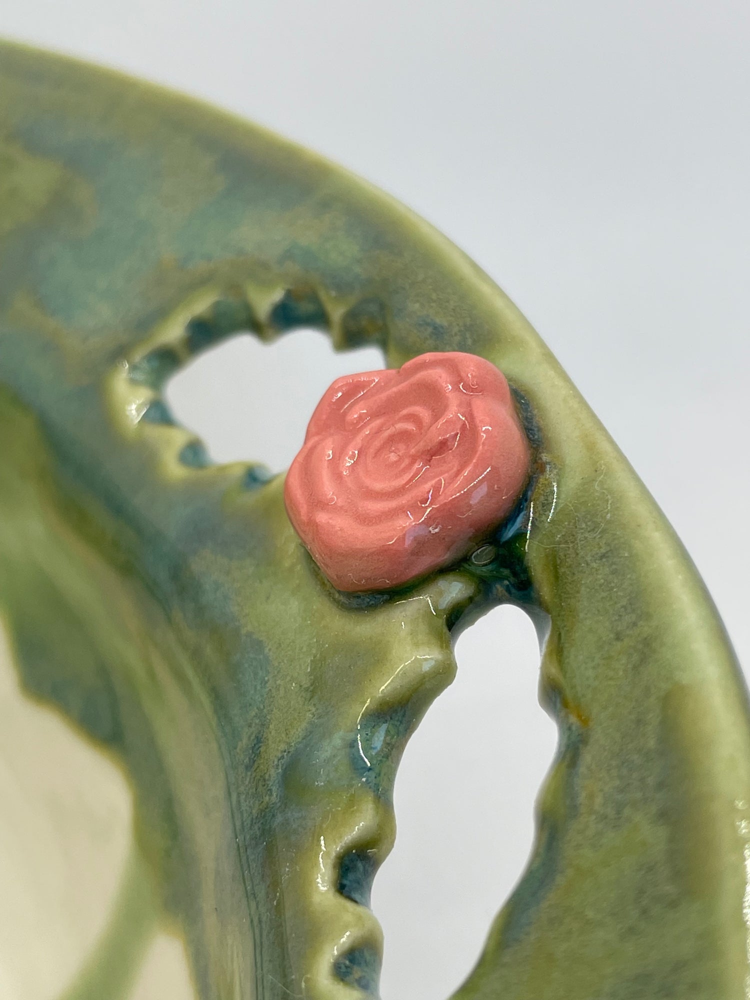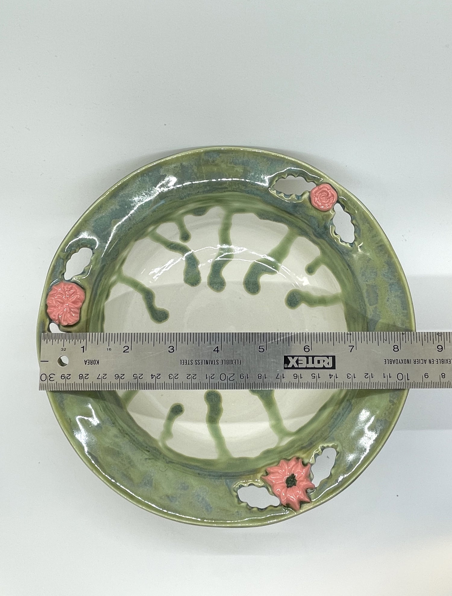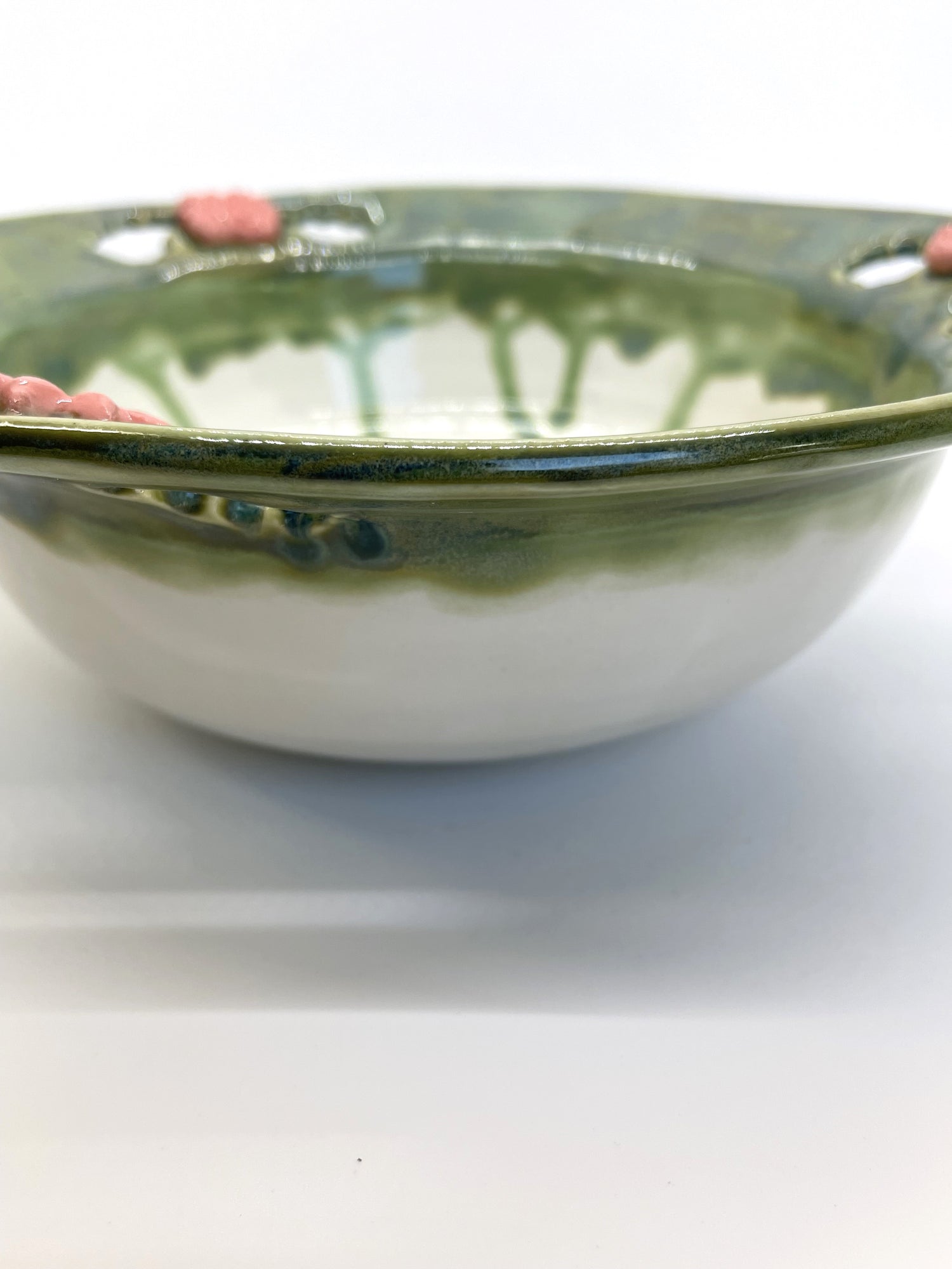 A ring of richly running jade glaze encircles the rim of this unique decorative bowl. A trio of blush pink flowers, each made from a different sprig, and cut-out leaf shapes add pretty touches. While decorative, it's completely functional too. Use it as a fruit bowl in your kitchen, or to serve salads and side dishes for large families or gatherings.