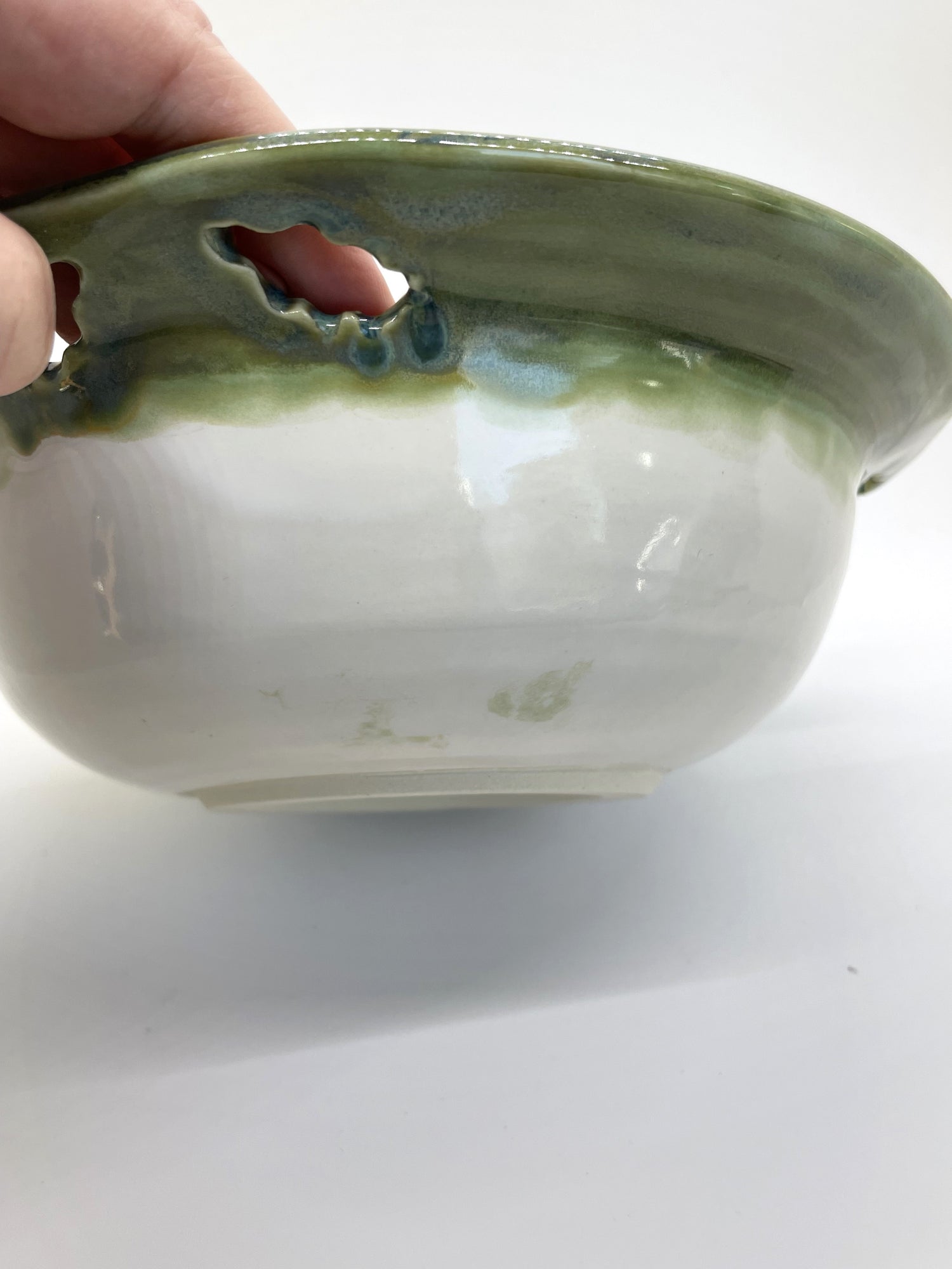 Seconds: This bowl is discounted due to the glaze flaw where the green glaze is in the white area on bowl towards the bottom rim. This flaw is aesthetic only and doesn't affect function. This green area is not visible from above when the bowl is place flat on the table.