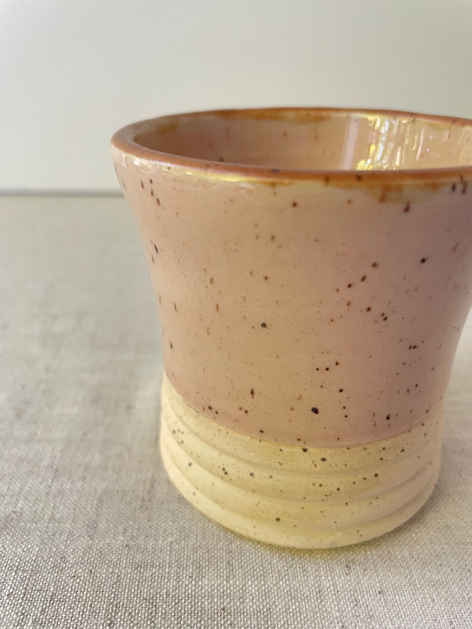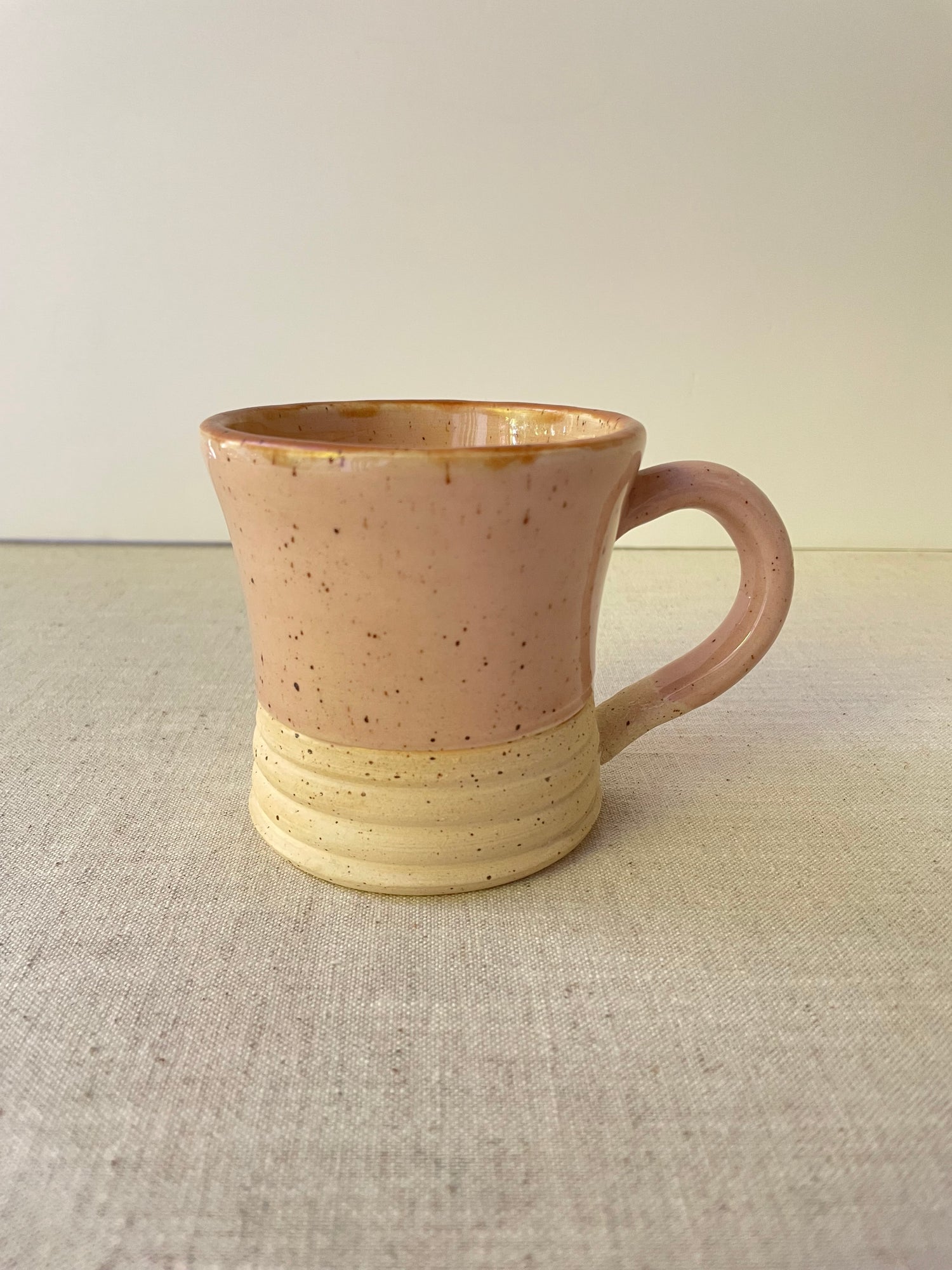 Made from speckled stoneware clay, this mug is glazed with a translucent delicate pink inside and above the exterior texture. Wavy bands accent the base to highlight the mug's organic charm. When you enjoy your favourite tea, coffee, cocoa and other hot drinks, you can even easily warm your beverage as stoneware is microwave-safe.Â