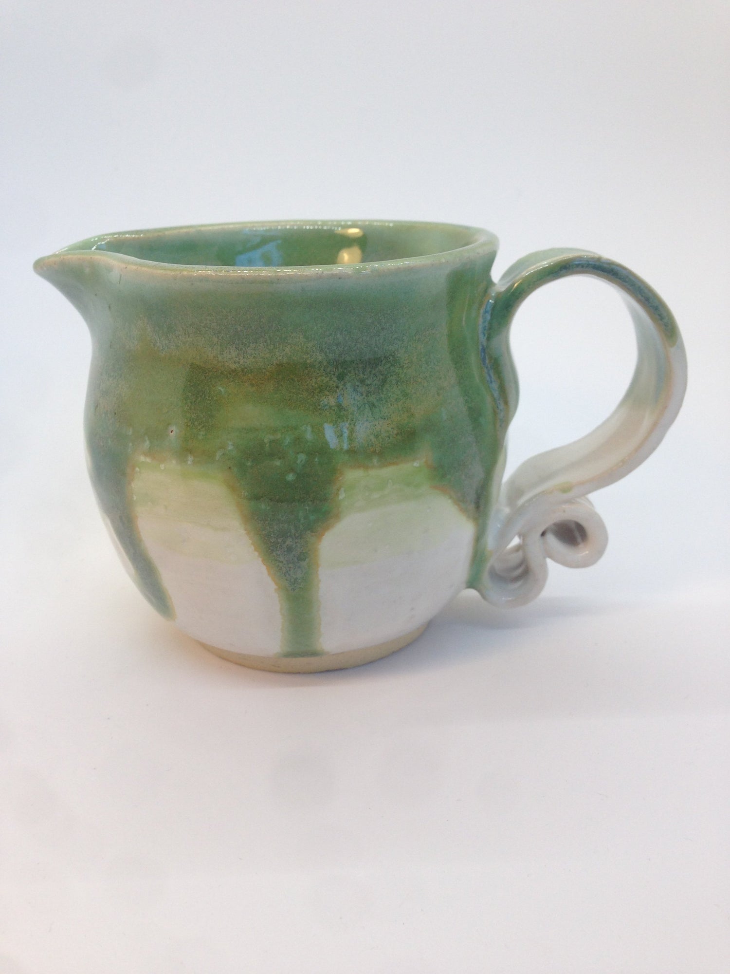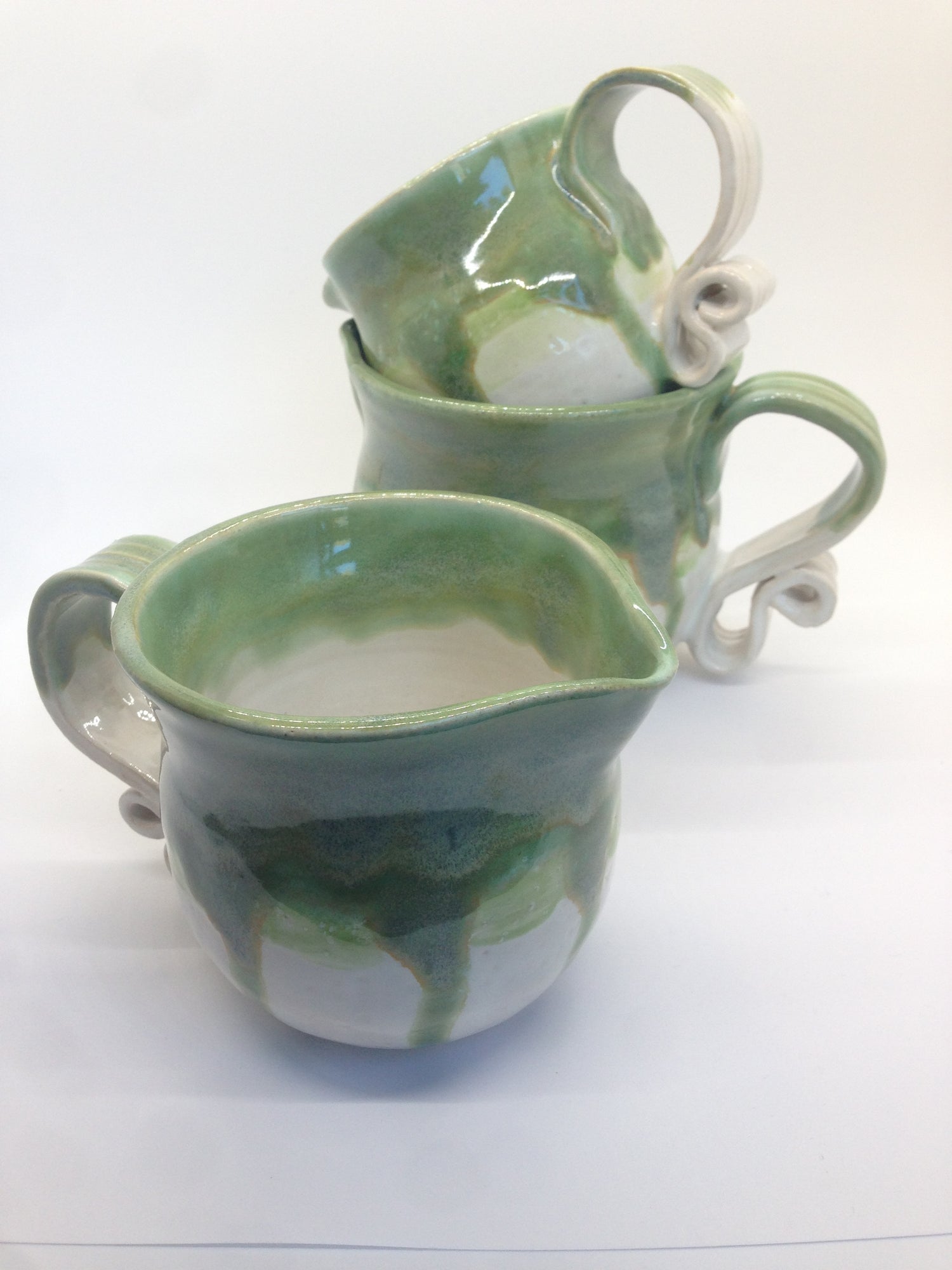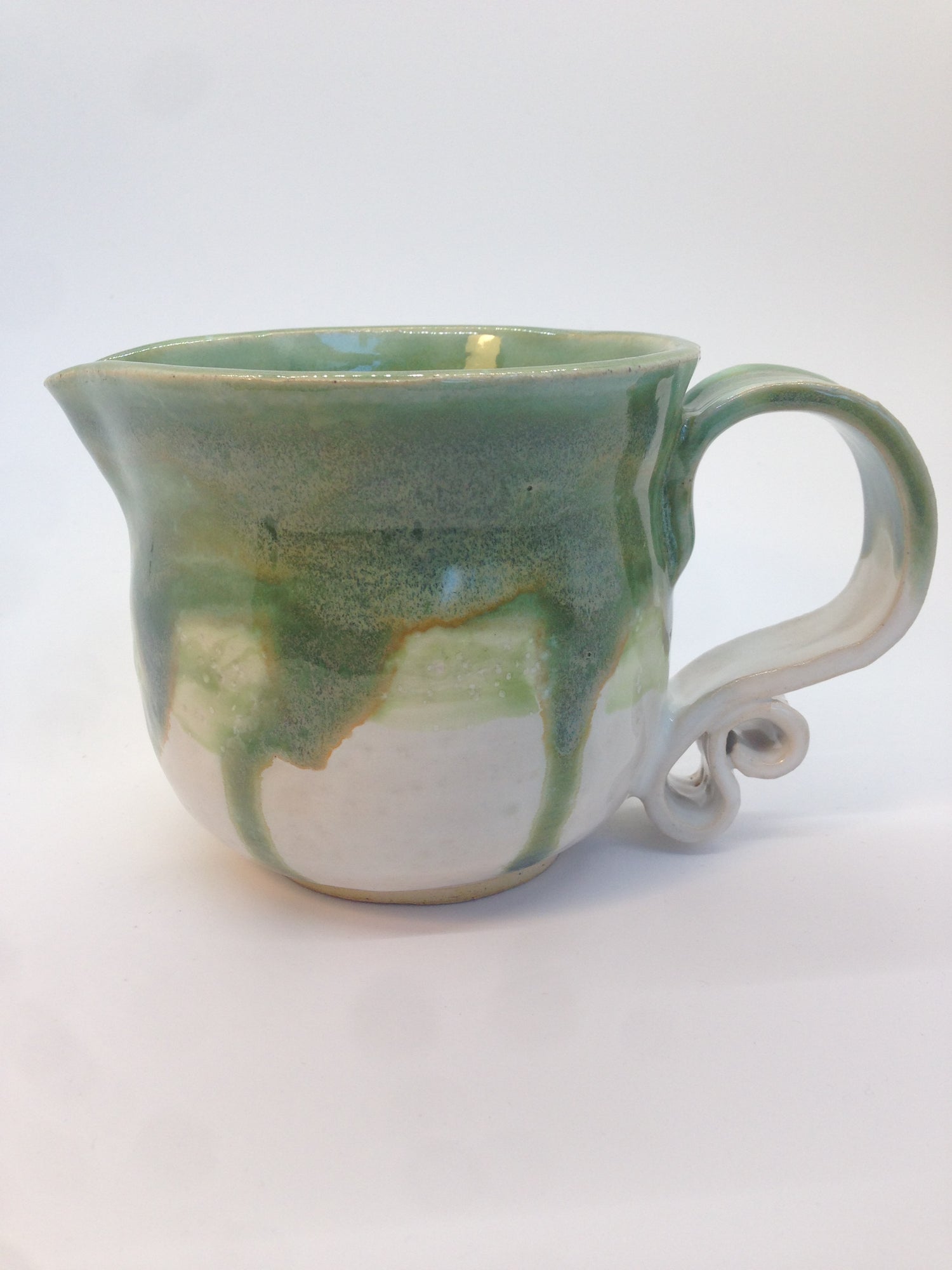 After I threw these pots on the wheel, I flared out a spout on each, and fashioned scrolling handles from a rolled slab. After I bisque fired them in an electric kiln, I painted the entirety of each piece in three layers of a soft white glaze, and another three layers of jade green on the top half, making sure to encourage some delightfully runny trails. Â