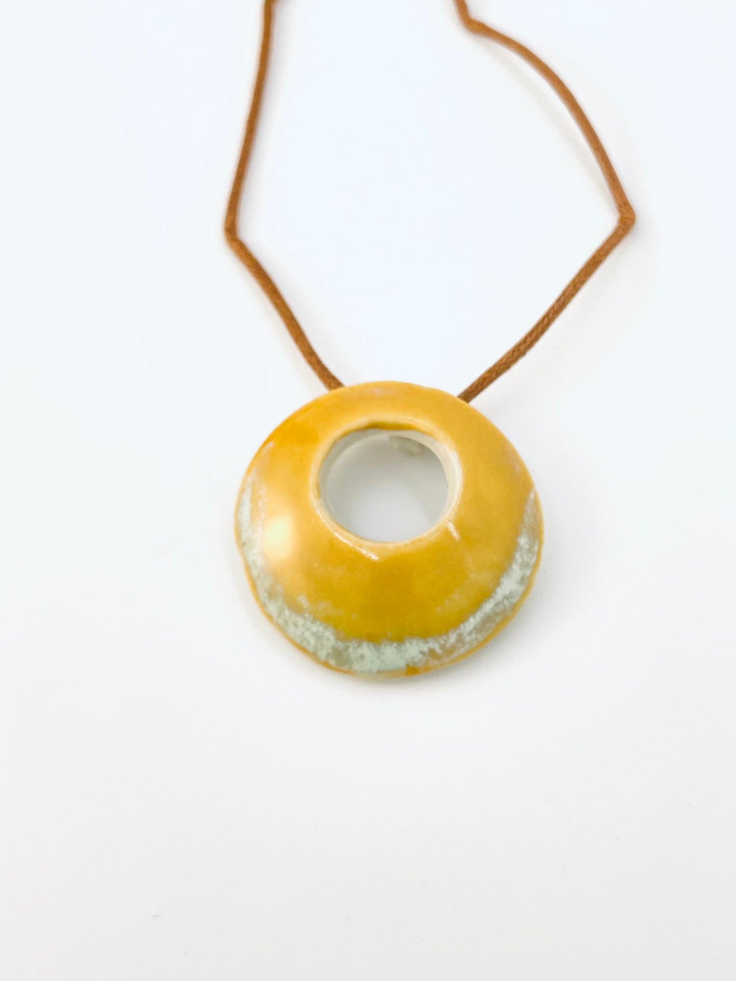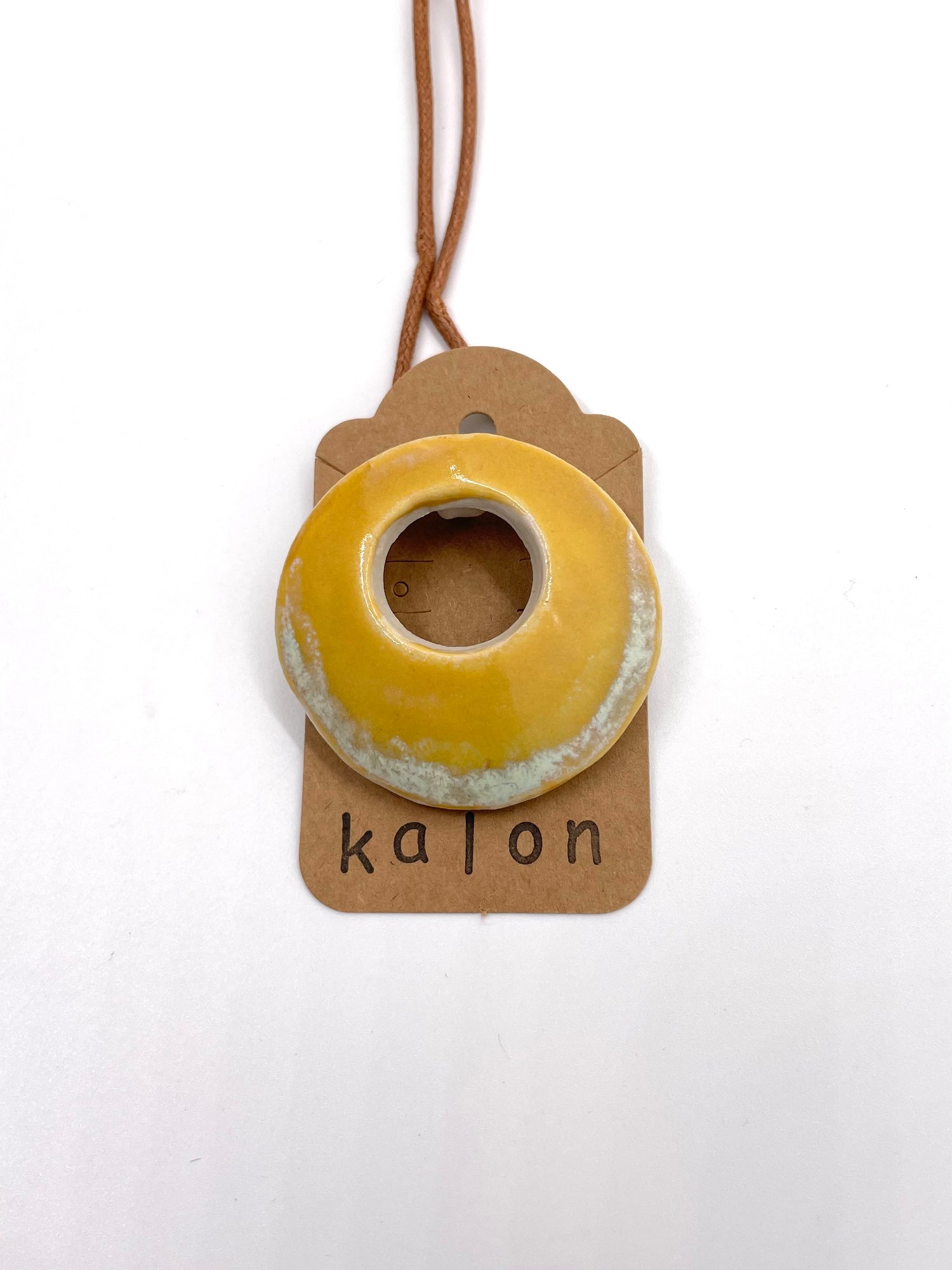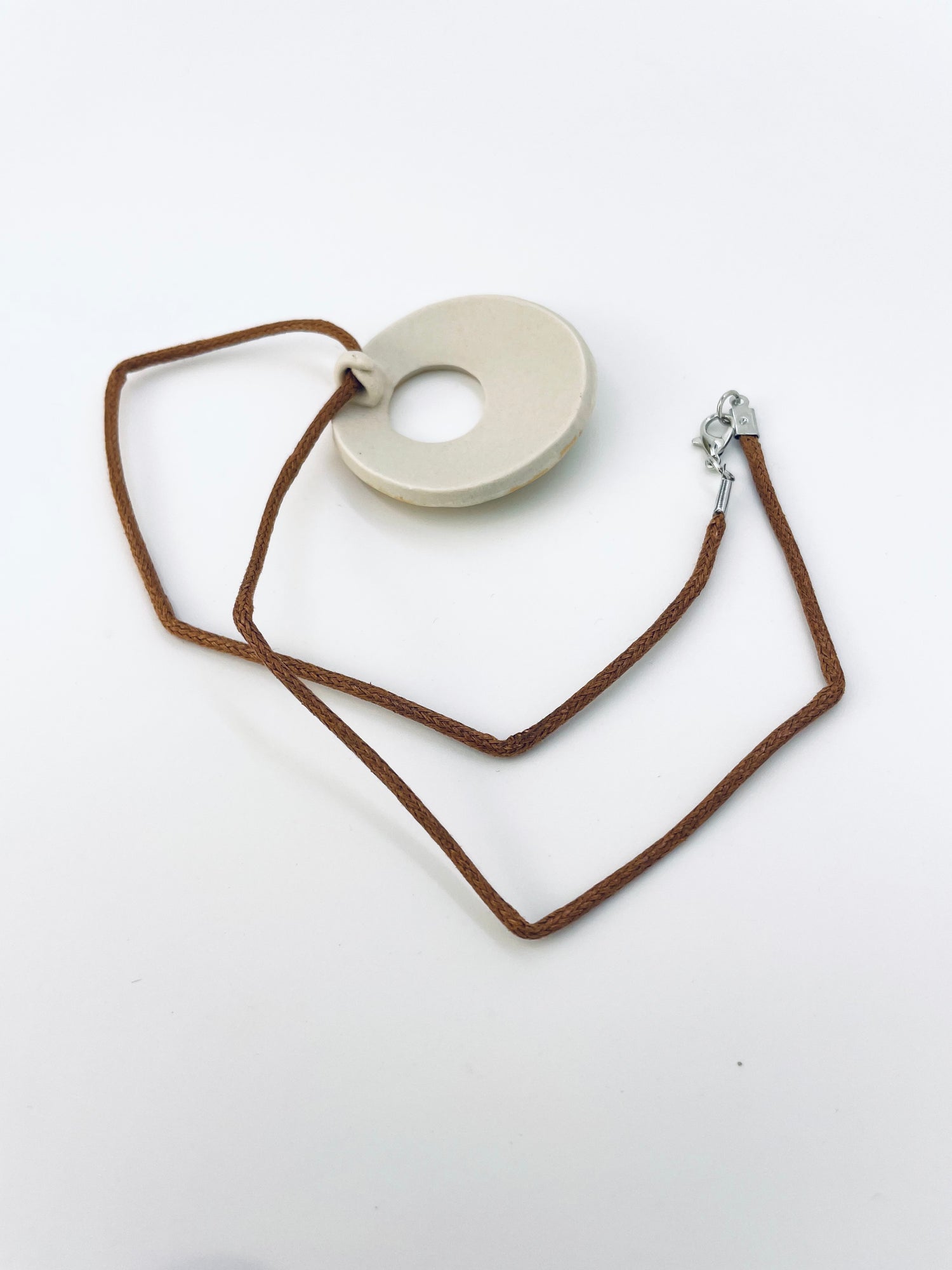 The necklace includes the two-inch-wide stoneware pendant on a waxed cotton cord approximately 20 inches in length with a stainless steel lobster clasp. As the pendants are handmade, each is unique; expect individual variations.