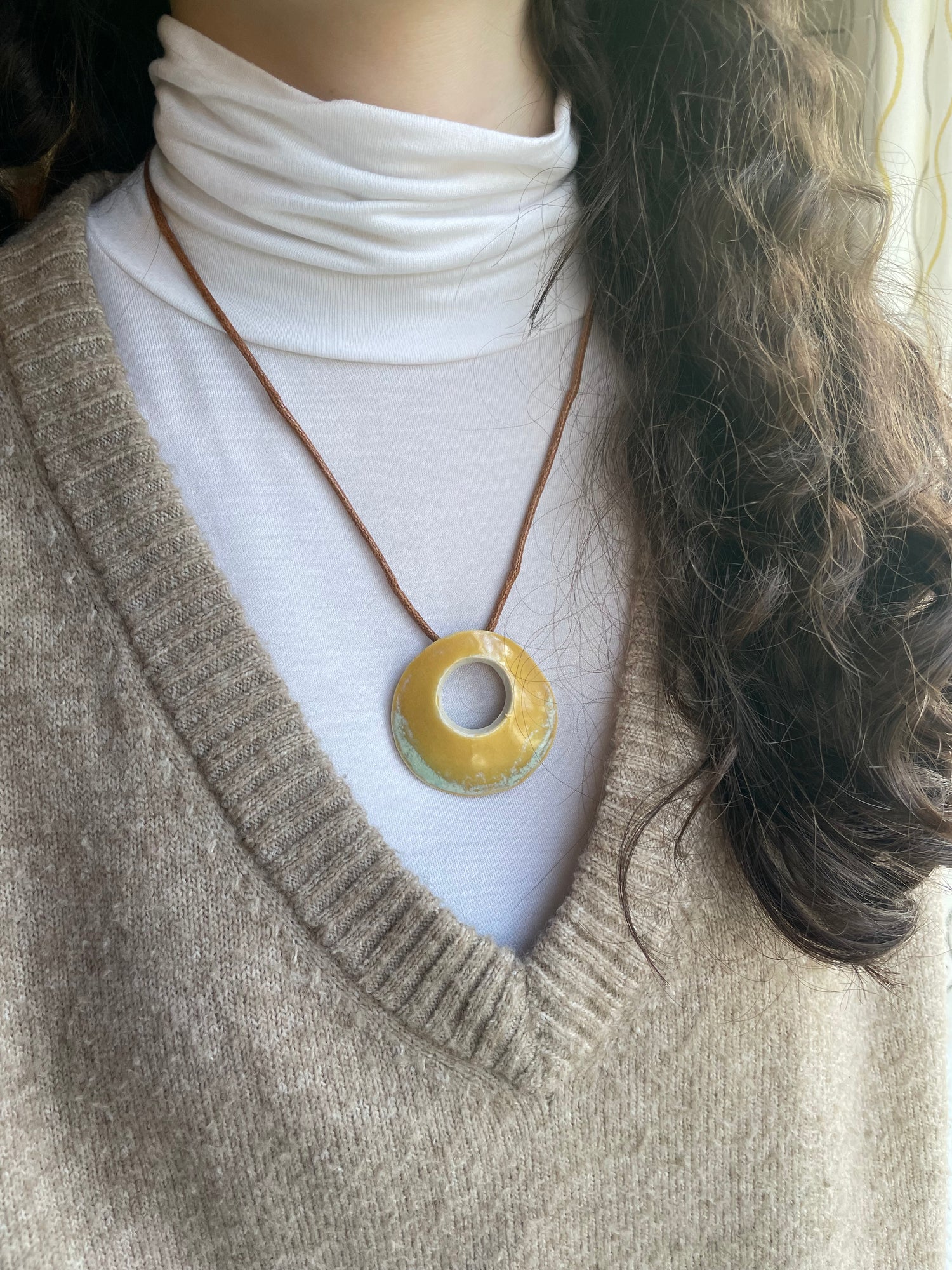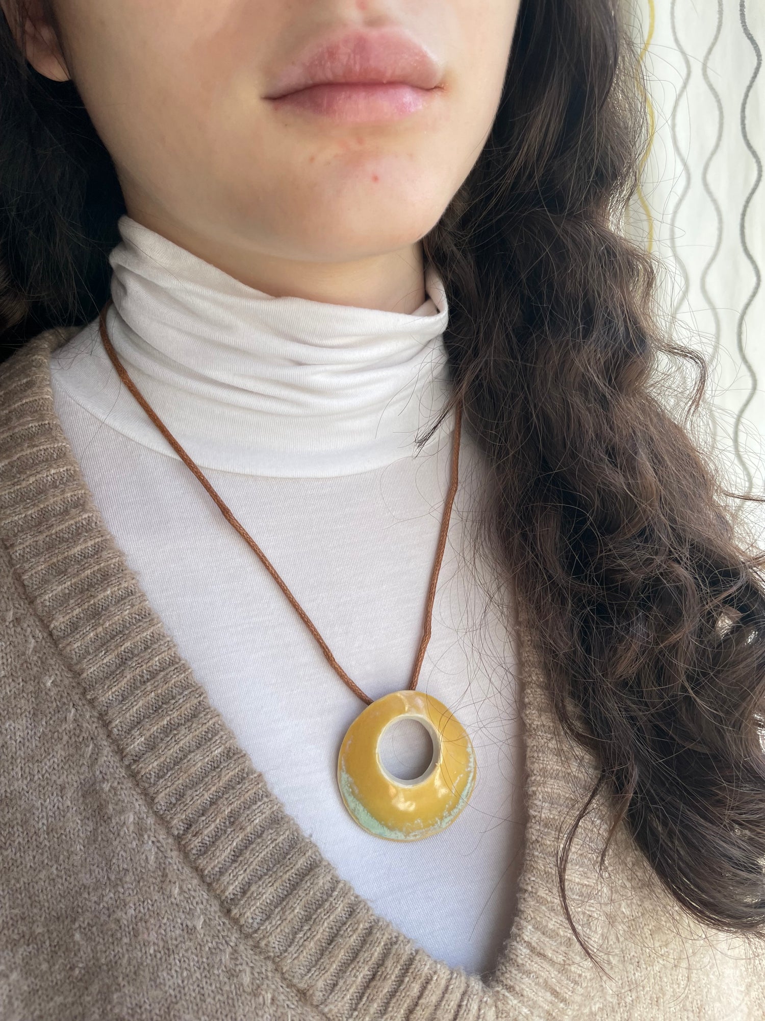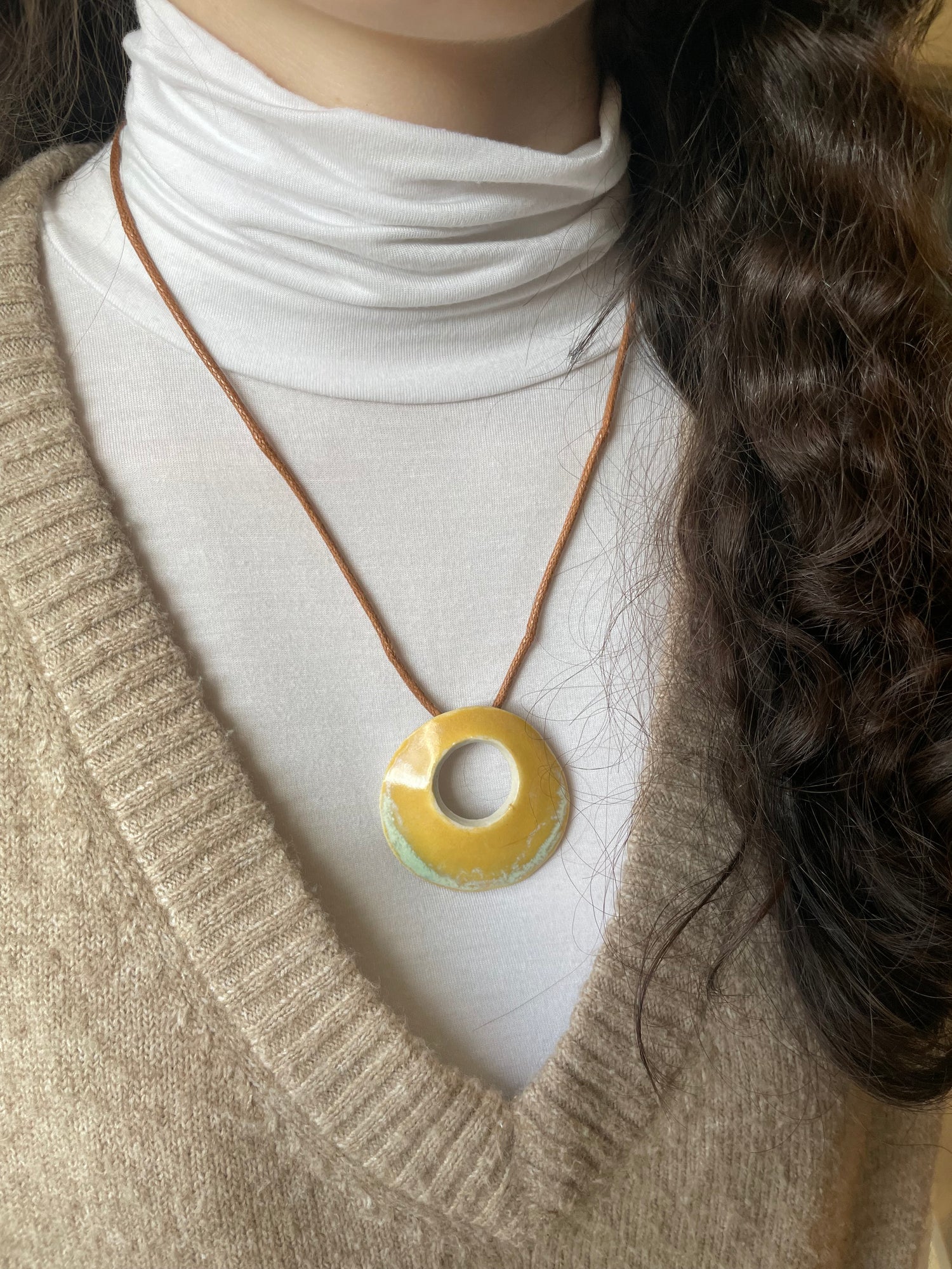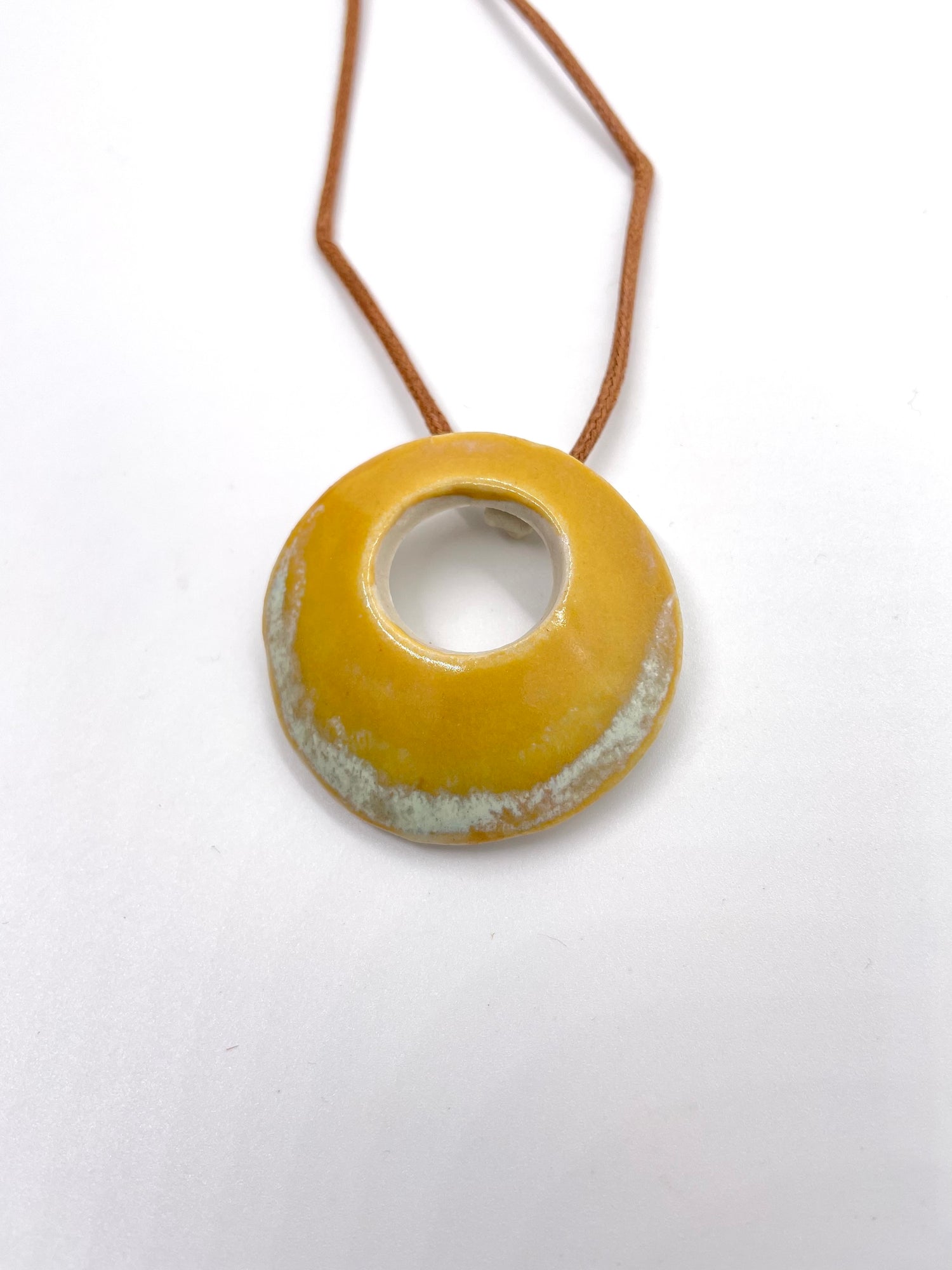 The necklace includes the two-inch-wide stoneware pendant on a waxed cotton cord approximately 20 inches in length with a stainless steel lobster clasp. As the pendants are handmade, each is unique; expect individual variations.